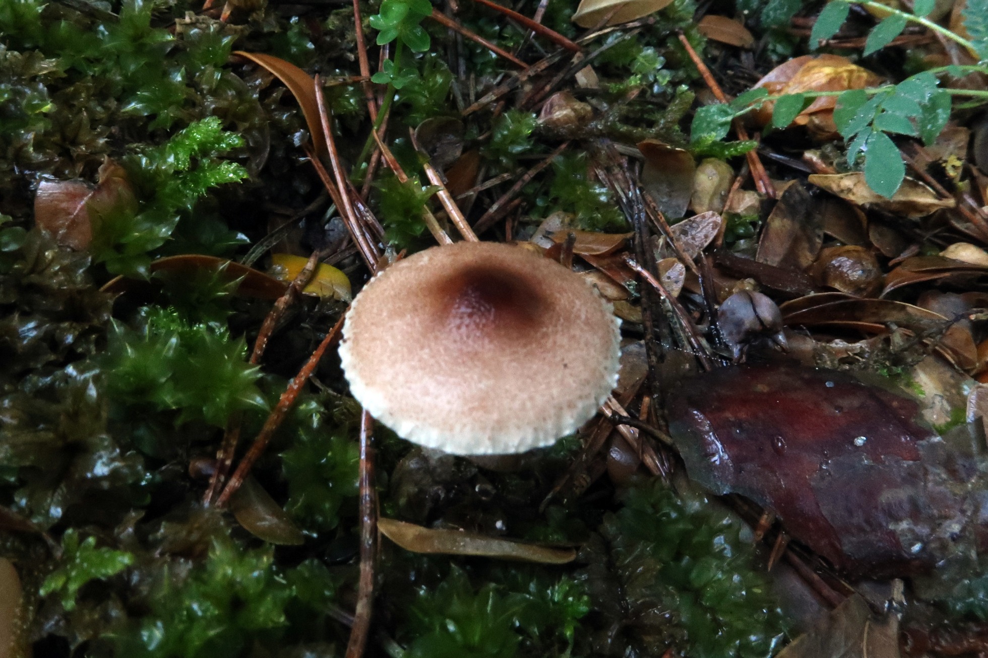 Un solo ejemplar de poco más de 2 cm., con sombrero entre convexo y aplanado, manteniendo un umbón en el centro, de color de fondo blanquecino y cubierto de numerosas escamas de color marrón rojizo mucho más abundantes en el centro: