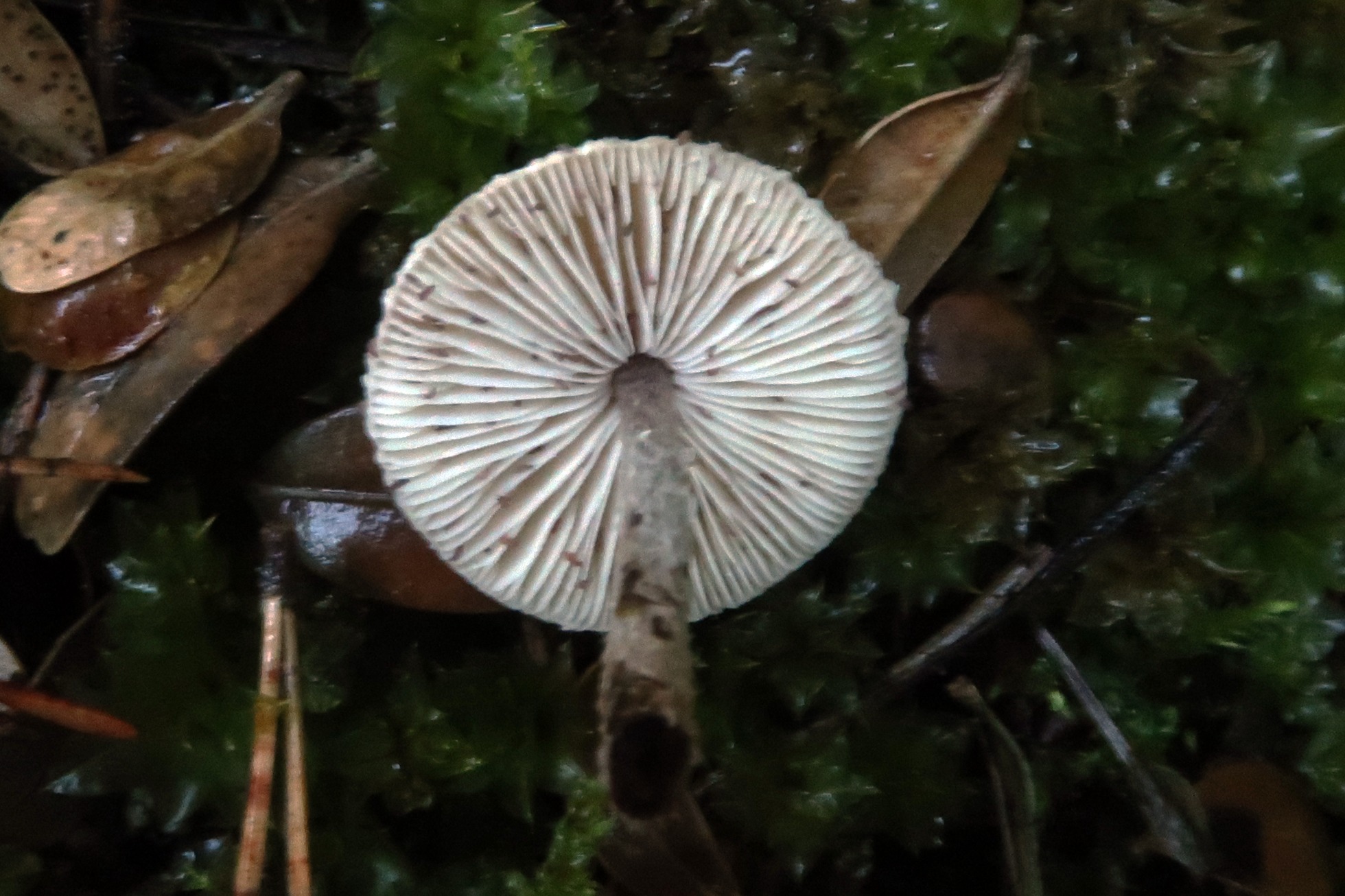 Láminas blancas parasitadas por Colémbolos y pie cilíndrico, sin anillo, cubierto de fibrillas blanquecinas sobre fondo marrón.