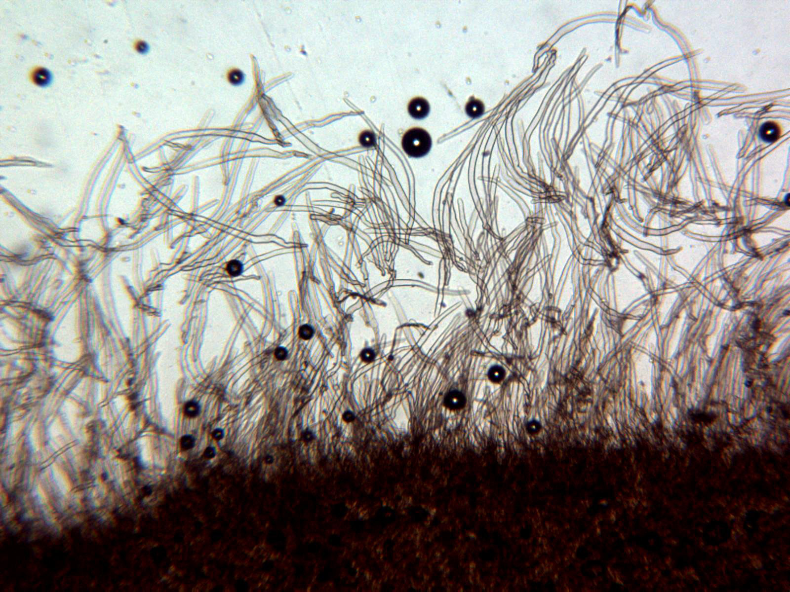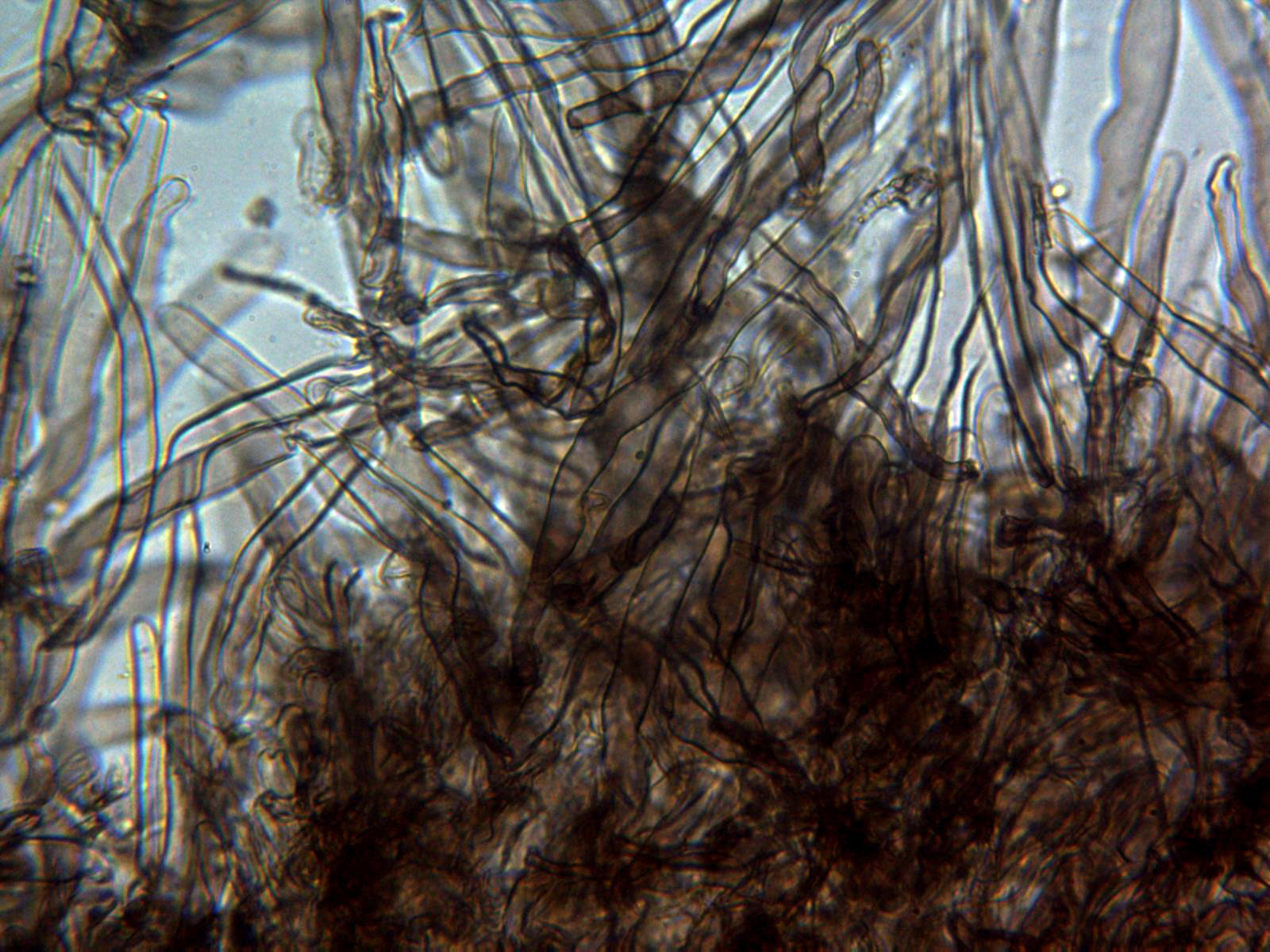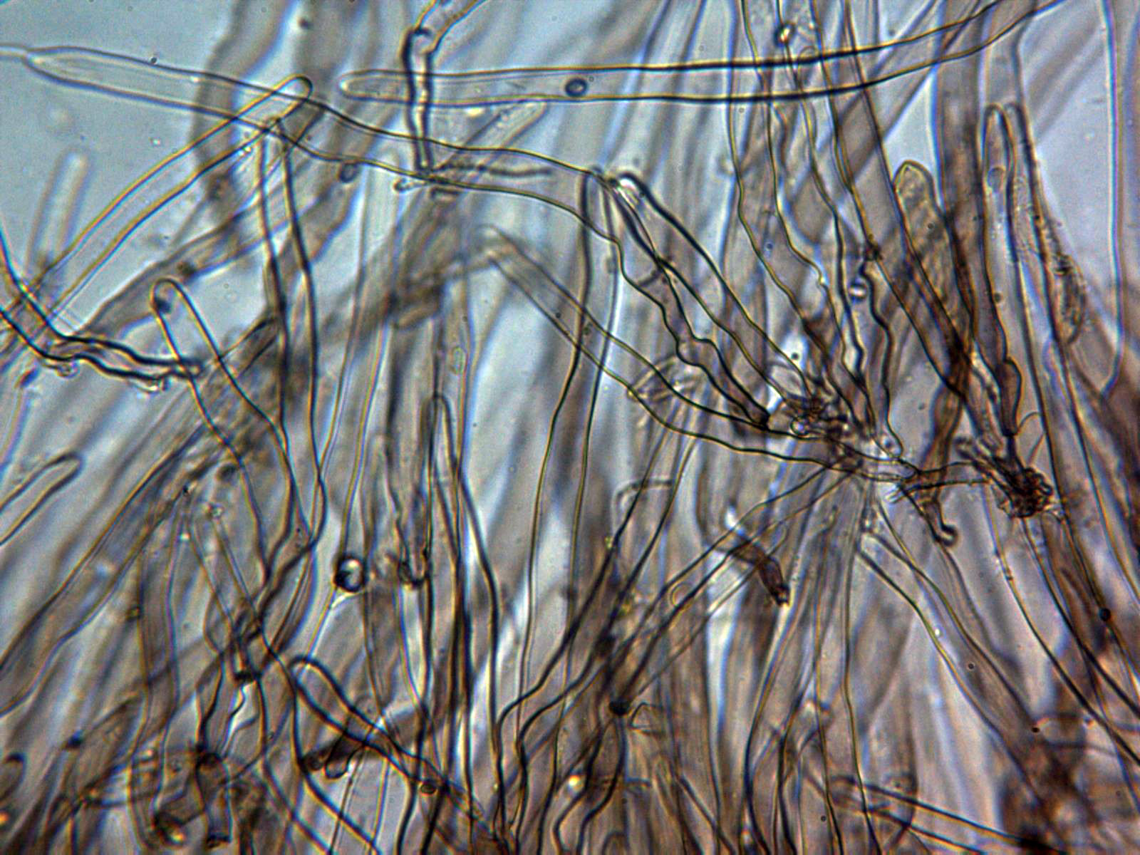 Pileipellis con células terminales a modo de pelos de hasta 500 micras, mezclados con otros bastante más cortos: