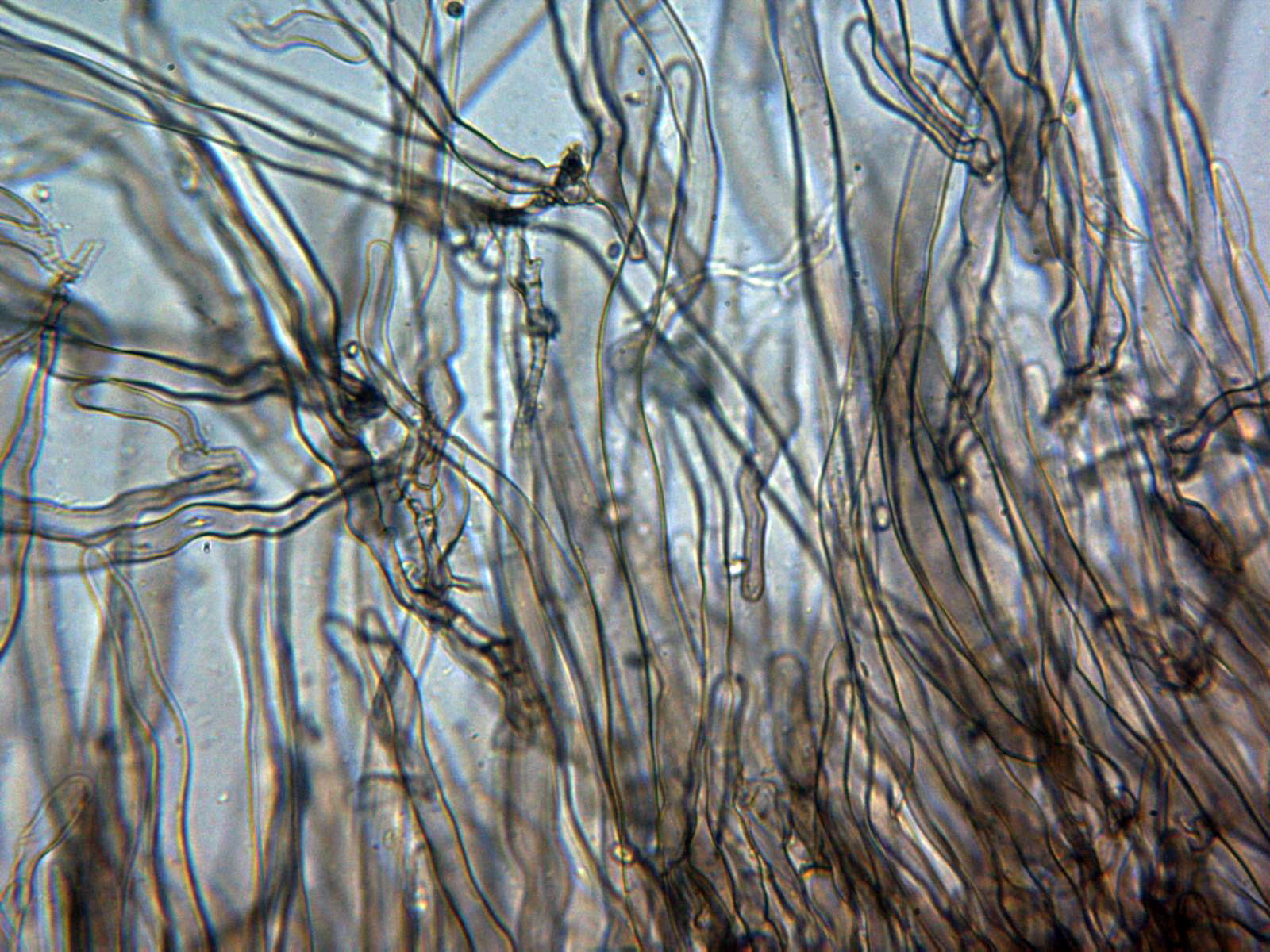 Port debajo de estos pelos unas hifas fuertemente pigmentadas que serían las causantes del color marrón rojizo del sombrero: