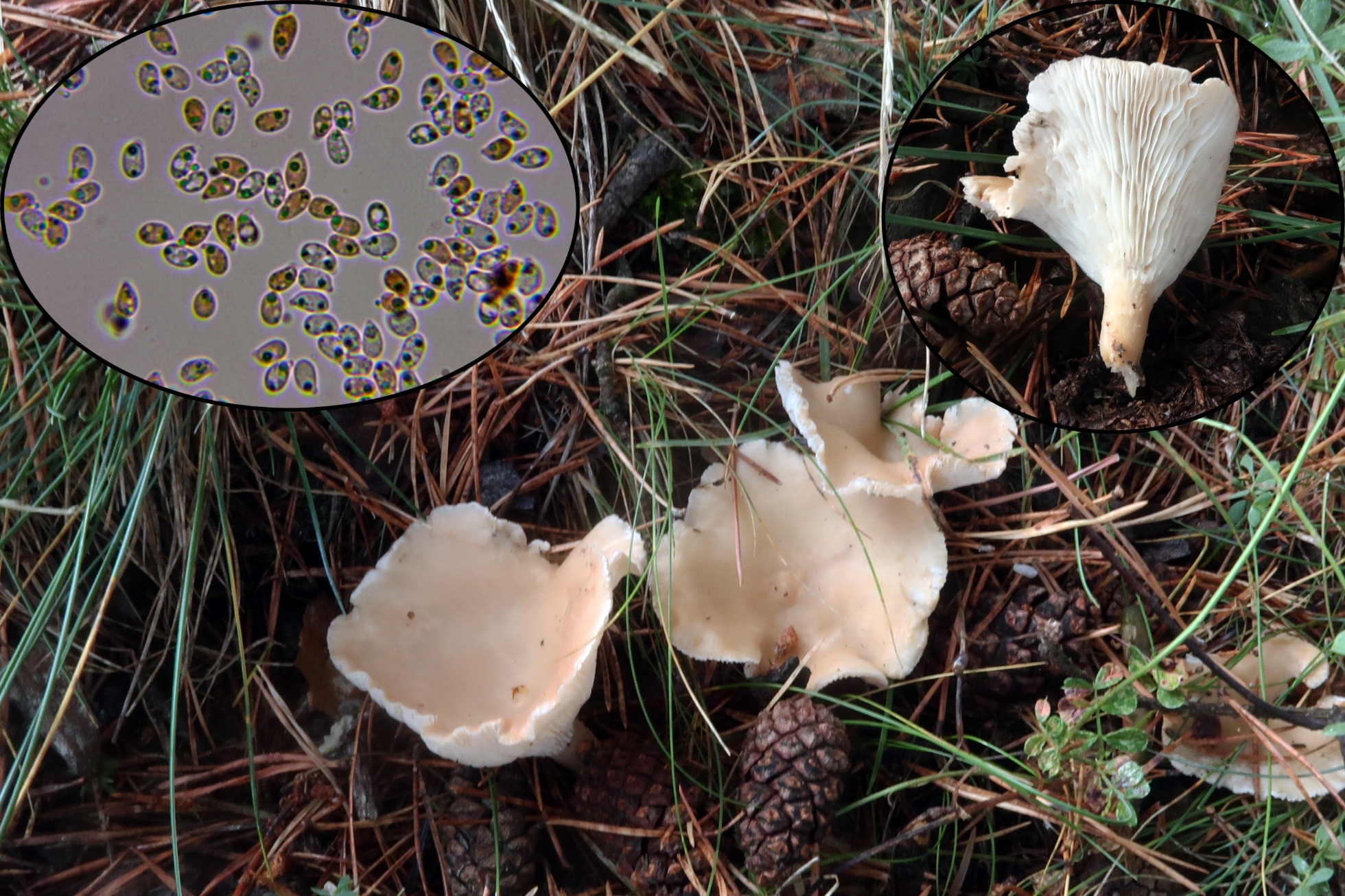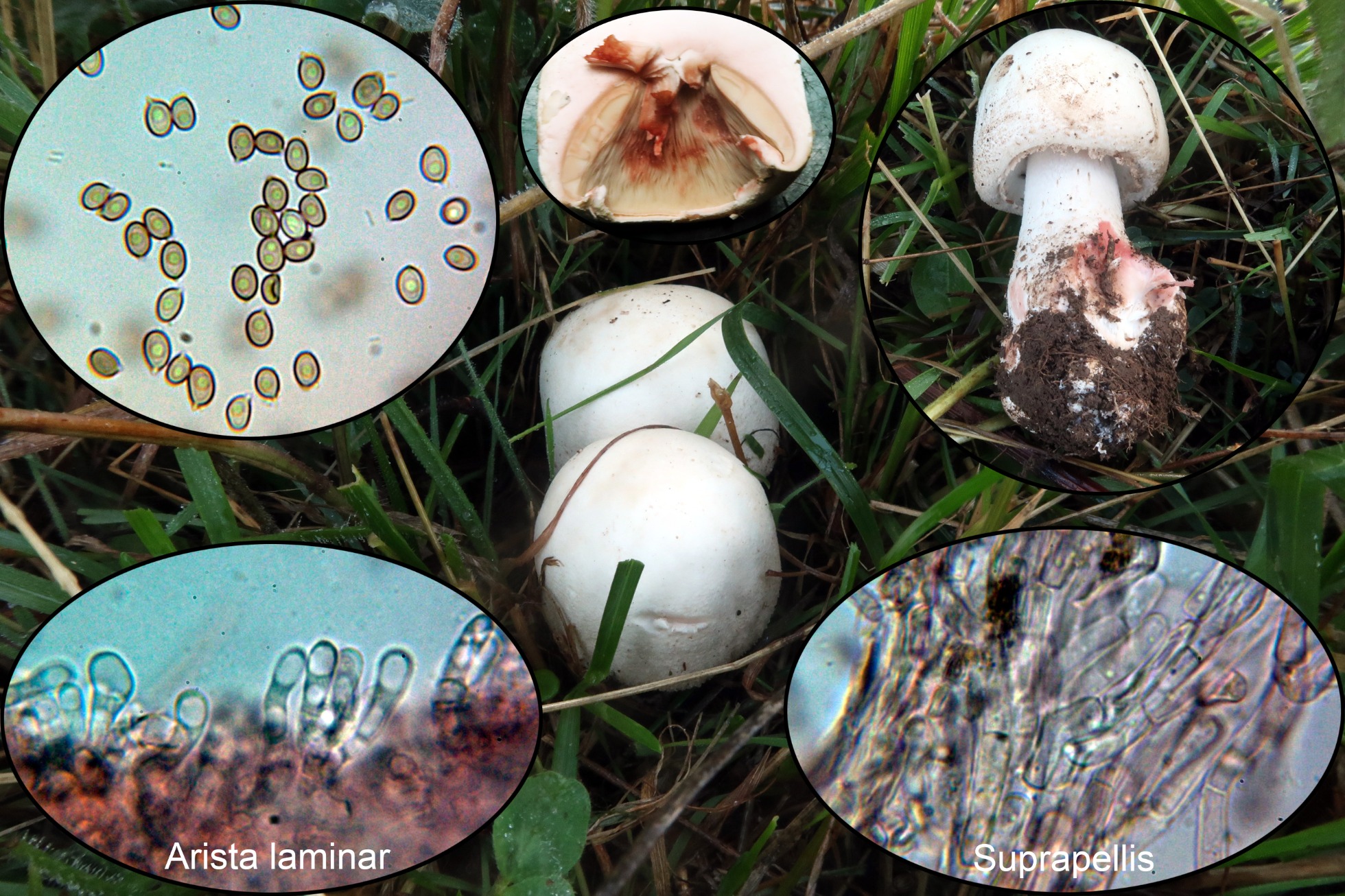 El primero un Agaricus de considerable tamaño a pesar de que se trataba de unos primordios y aún no habían empezado a abrirse, por el dato de la carne fuertemente enrojeciente al más mínimo roce o manipulación, solo puedo pensar en el Agaricus haemorrhoidarius o ya en todo caso el Agaricus vinosobrunneus, al parecer ambos en la actualidad estarían sinonimizados bajo el epíteto de Agaricus sylvaticus, dado el color totalmente blanco del píleo debo pensar en alguna variedad albina del mismo, en "Les Champignons de Suisse" con sombrero blanco se describe el Agaricus sylvaticus var. pallidus, que parece encajar bastante con mi propuesta.