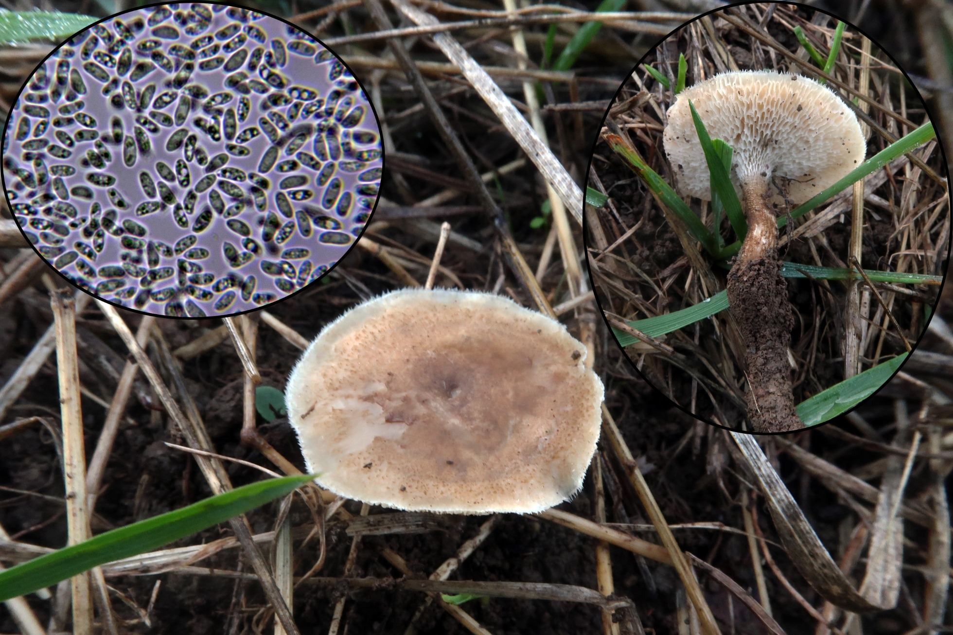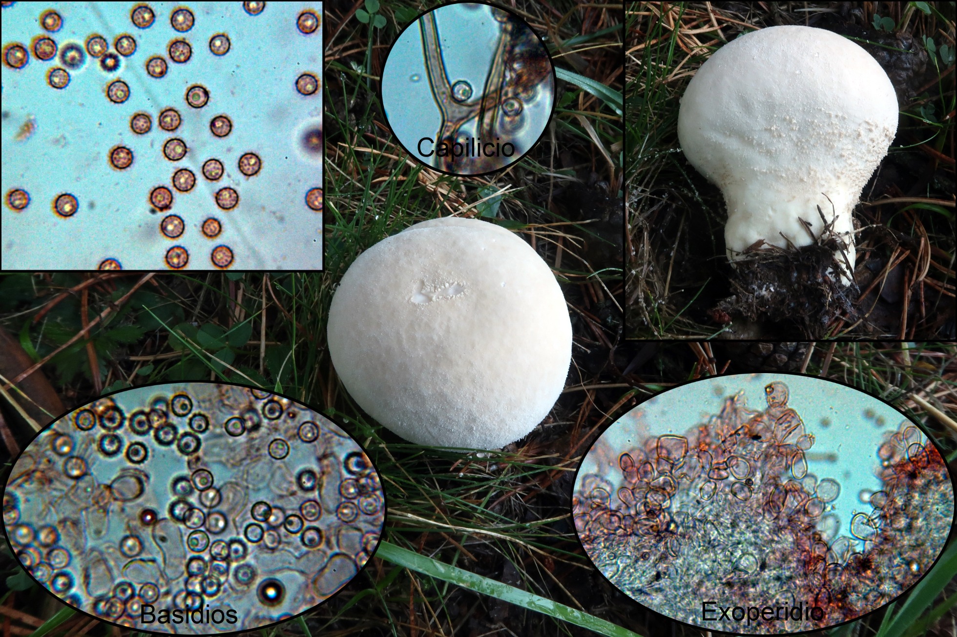 Un Lycvoperdon con su superficie prácticamente lisa, aunque su pie no es aún demasiado largo, atendiendo a su considerable tamaño y sus esporas espinosas, atendiendo al trabajo "Puffballs of Northern and Central Europe" de Mikael Jeppson, me conducen al Lycoperdon excipuliforme
