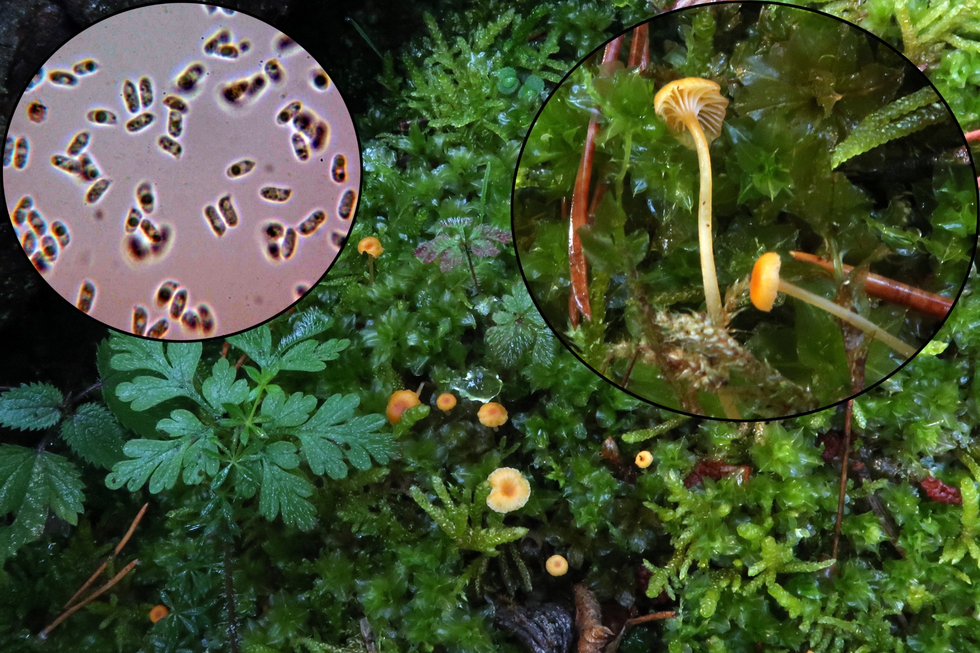 Destacando sobre el musgo del suelo, con láminas decurrentes, la vistosa Rickenella fibula