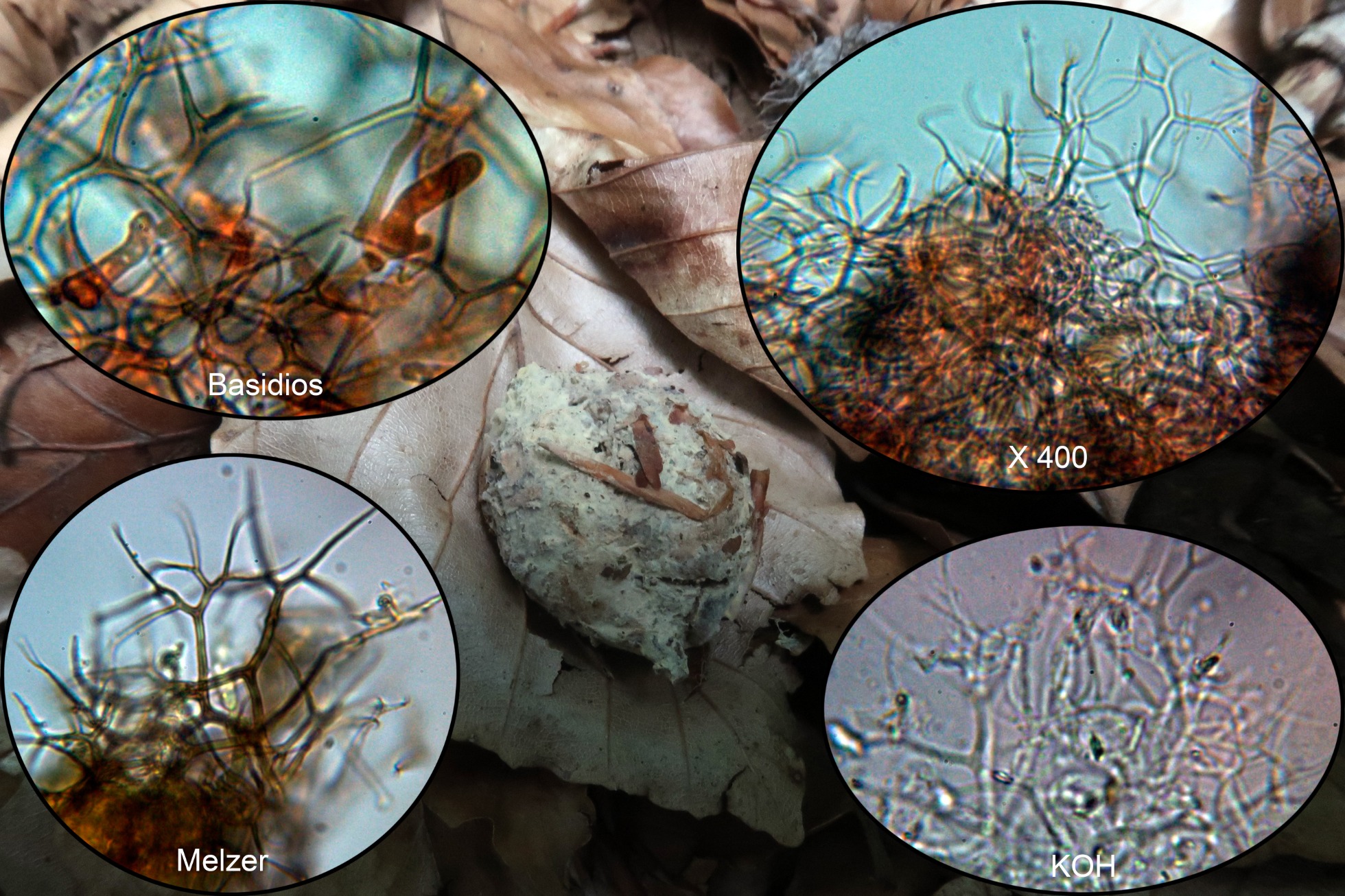 Y para terminar una del 8 de Agosto pasado, sobre la superficie de un hayuco, por la microscopía solo puedo pensar en Vararia, dado que no pude obtener esporas, lo dejo como lo más parecido macroscópicamente, es decir la Vararia aff. ochroleuca.