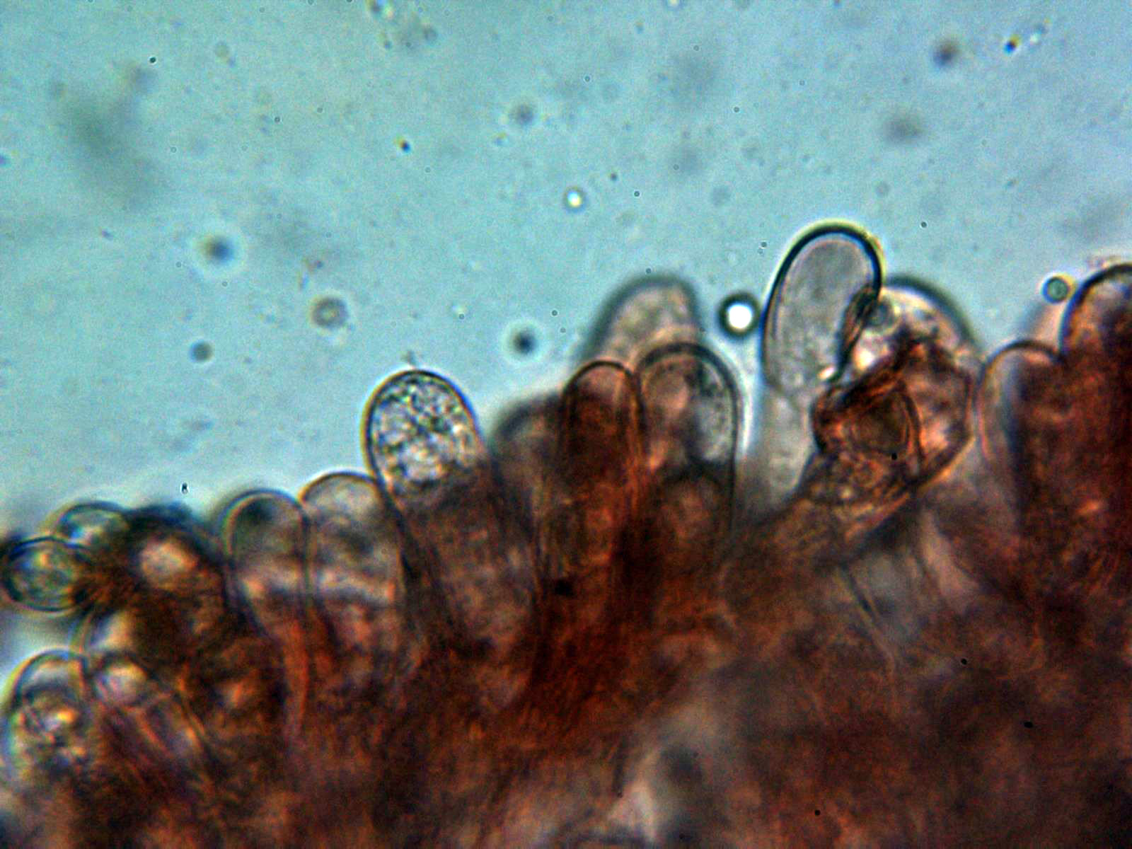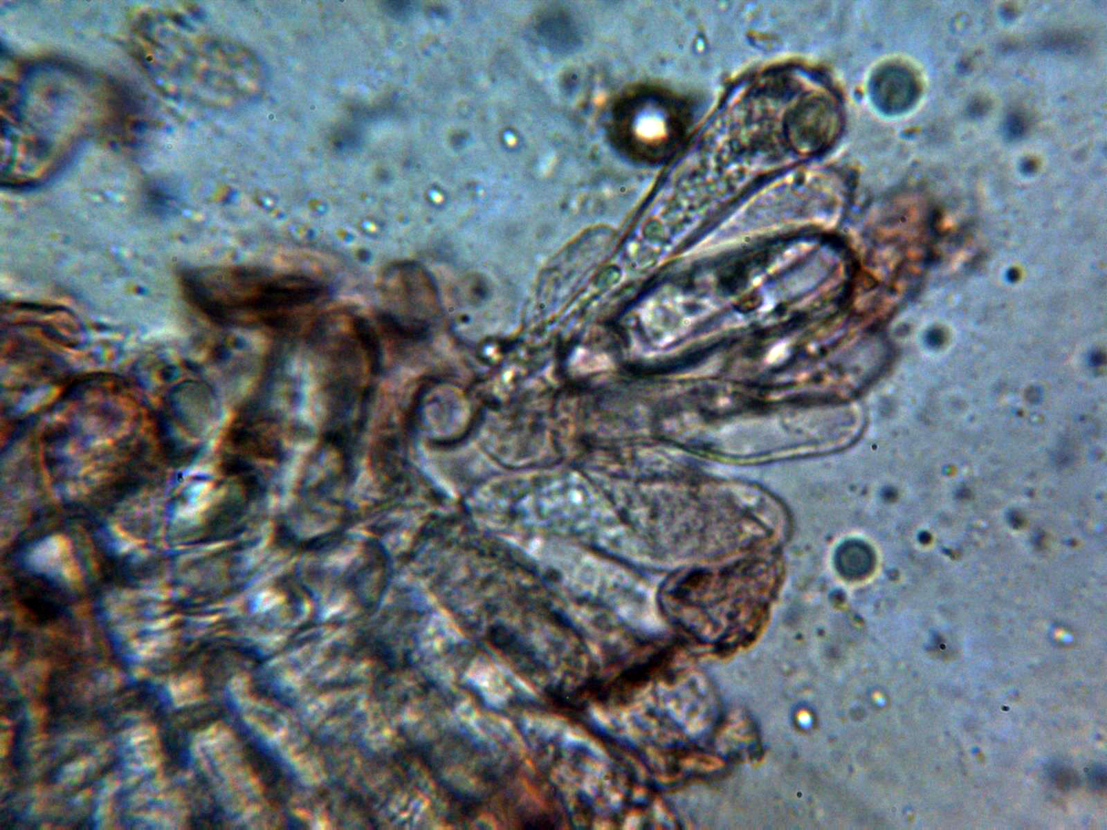 Los basidios mayoritariamente tetraspóricos, pero alguno debería haber bispórico dado el gran tamaño de algunas de las esporas comparándolas con el resto: