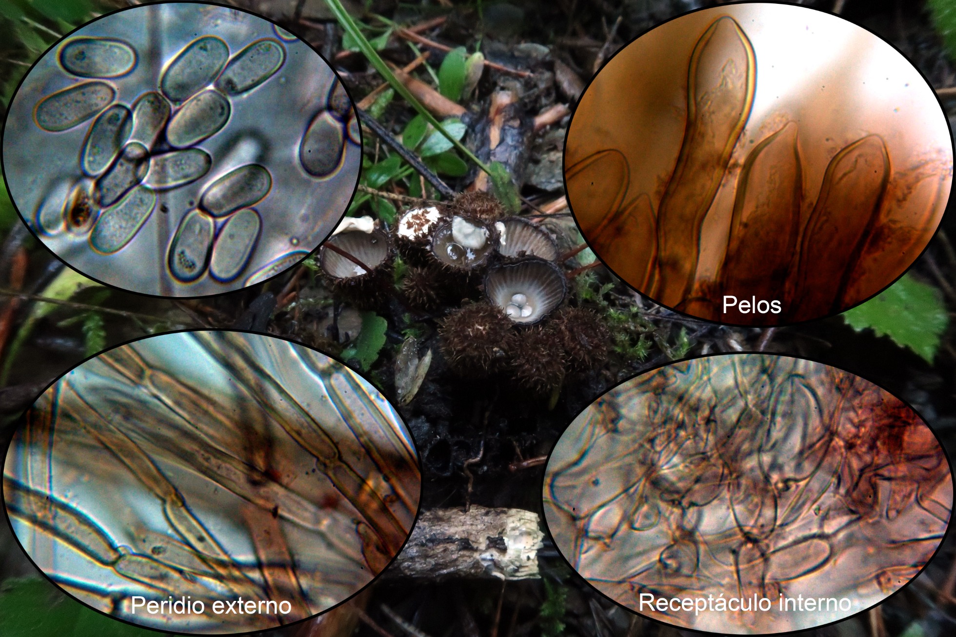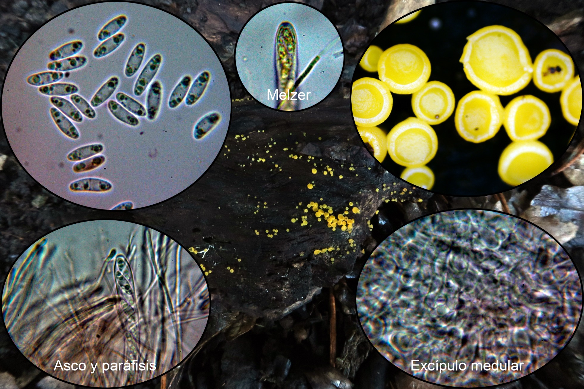 Un muy diminuto ascomiceto, con una base filamentosa a modo de tela de araña, la Arachnopeziza aurata