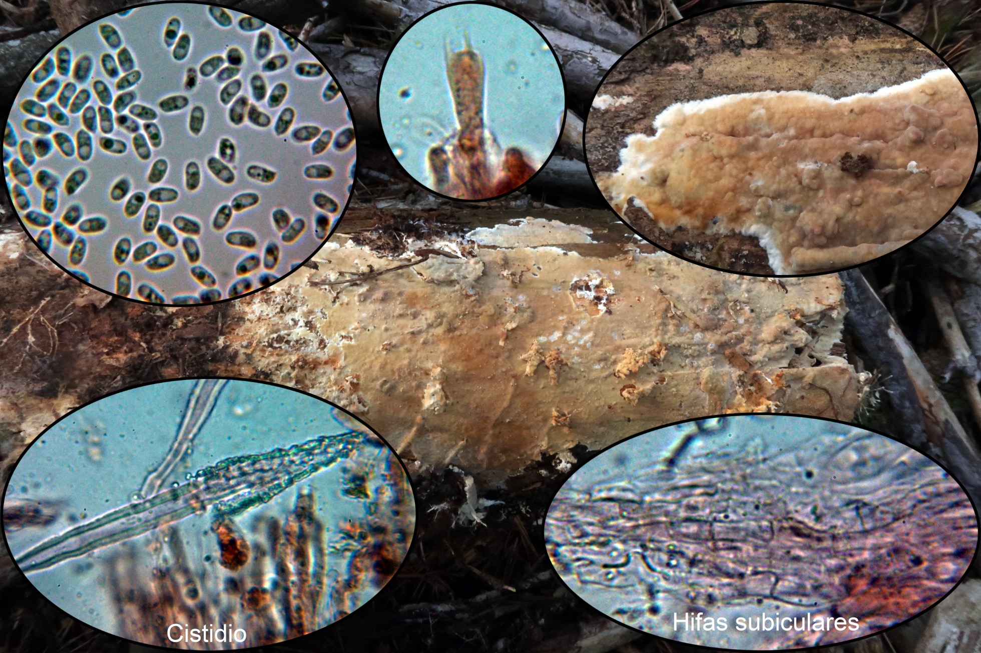 Un Corticial de aspecto céreo, es el quinto estudio que realizo a la especie (me cuesta ya encontrar cromos nuevos), con grandes y no muy anchos cistidios, la Phanerochaete sordida