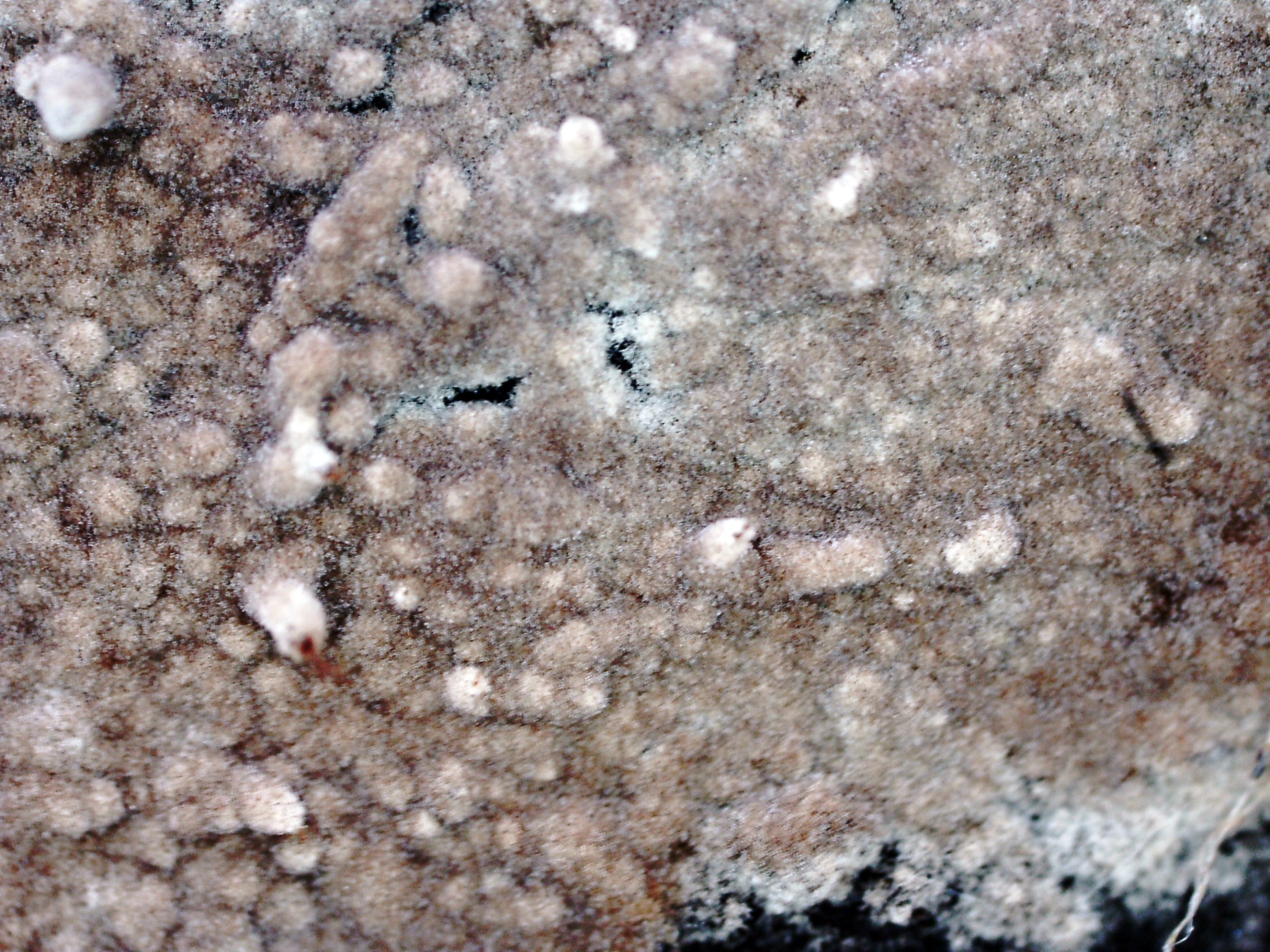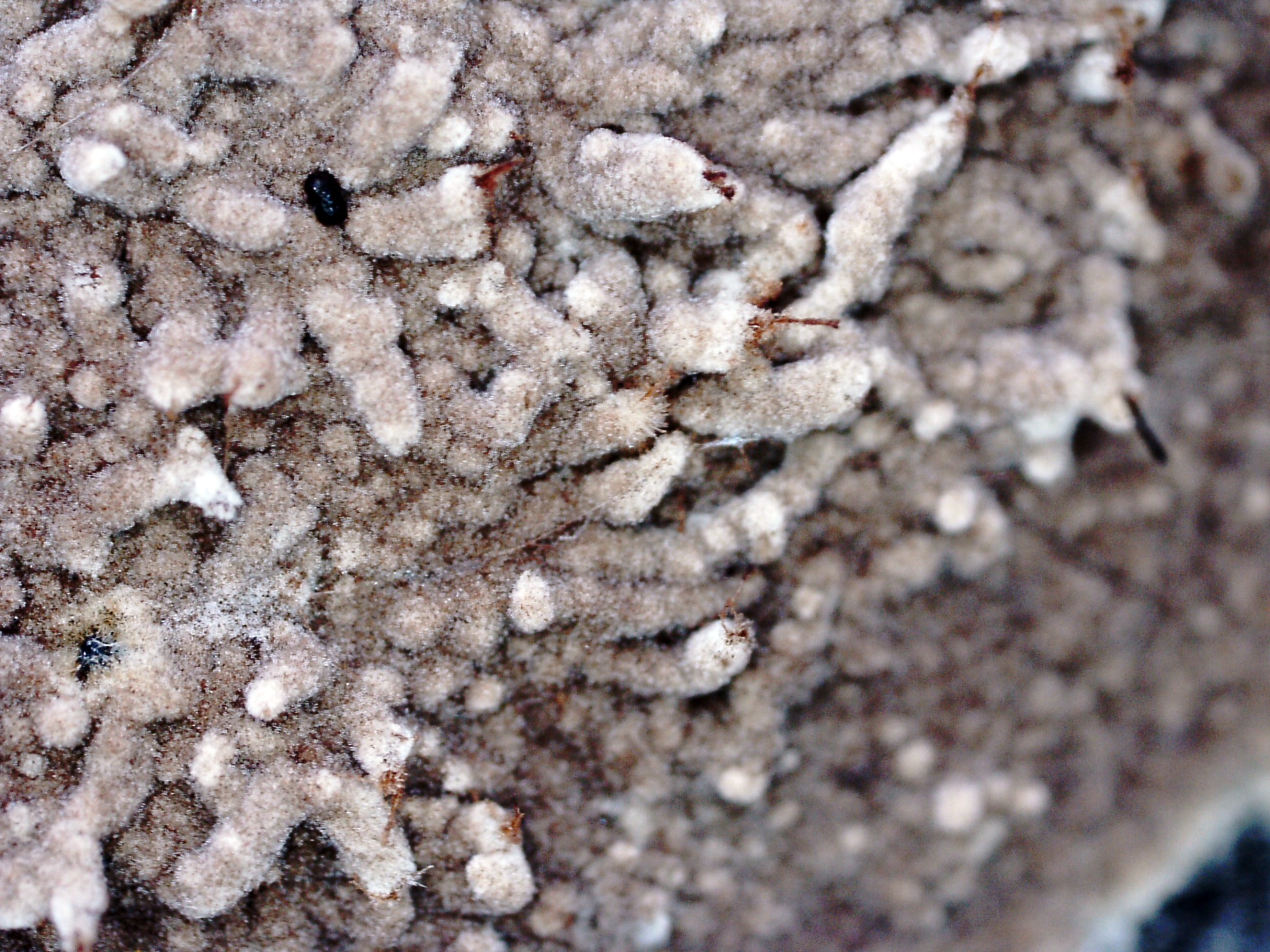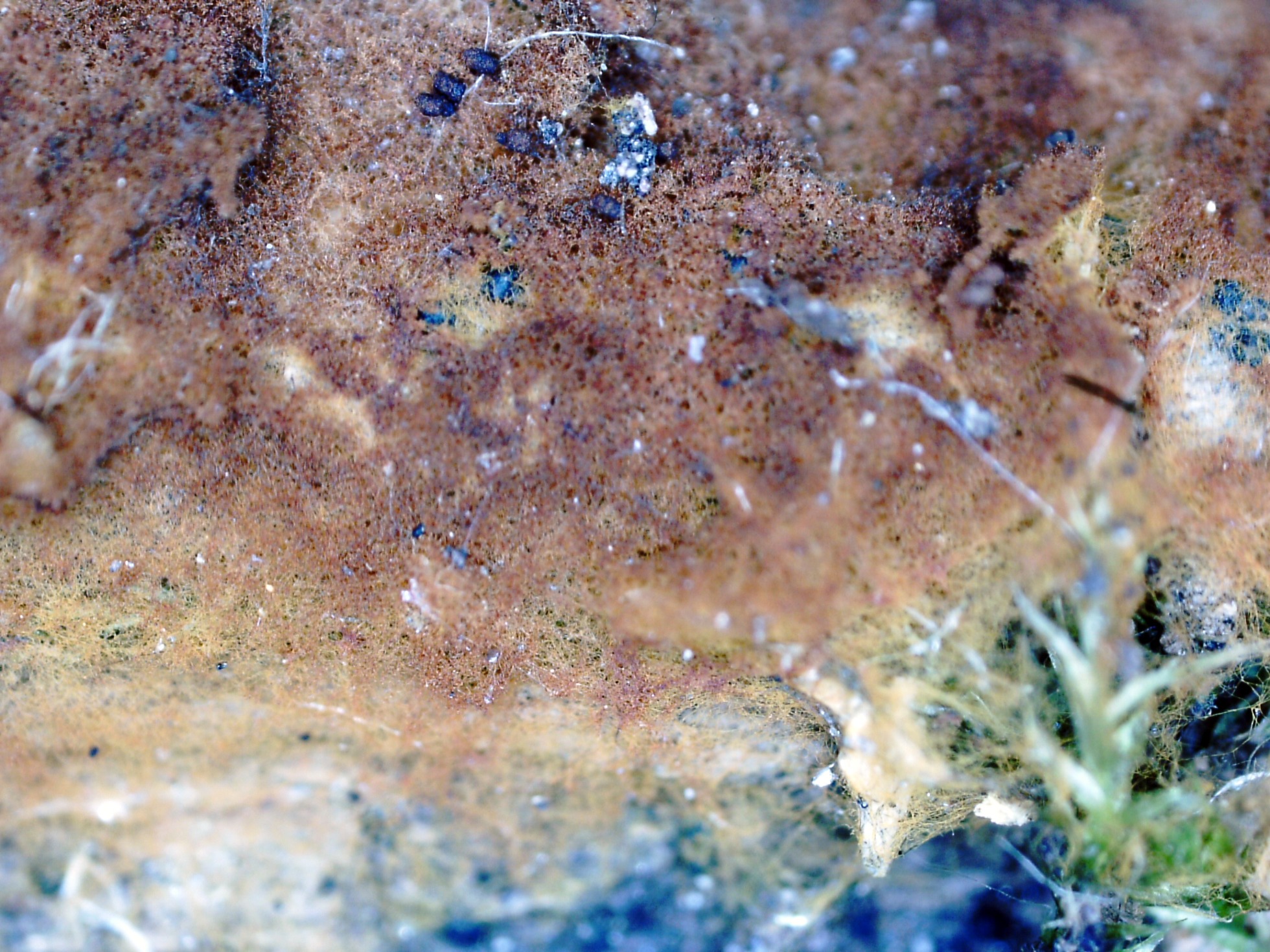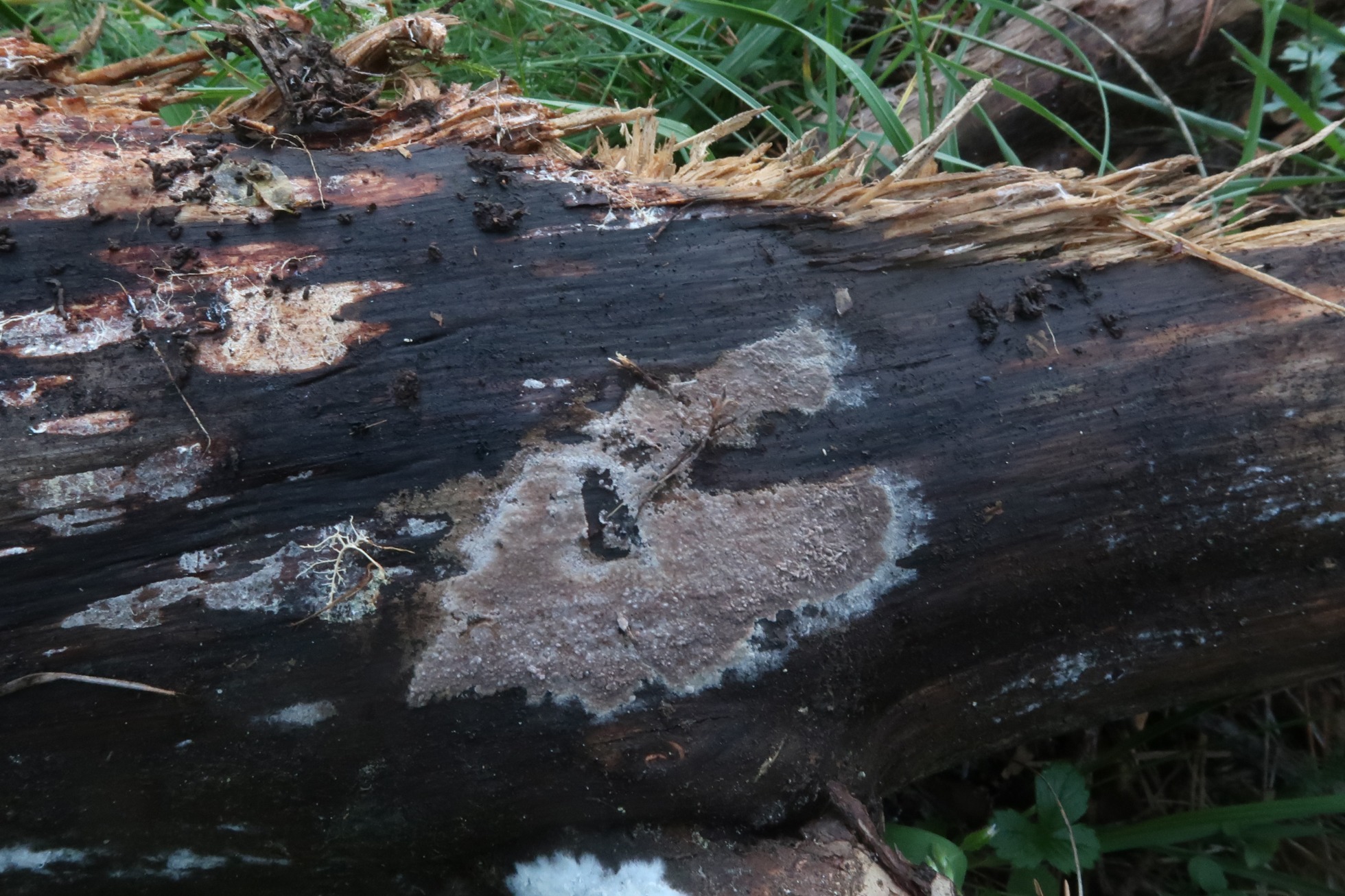 Una Tomentella fotografiada el 29 de Agosto en soto fluvial, sobre la superficie de un tronco tumbado de planifolio, en la parte que está en contacto con el suelo.