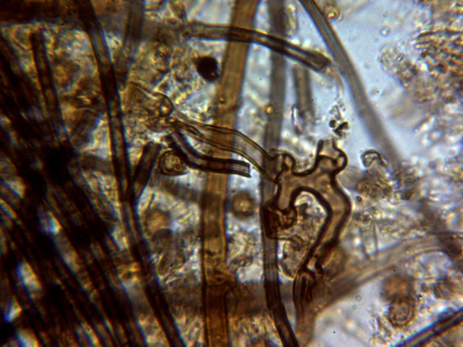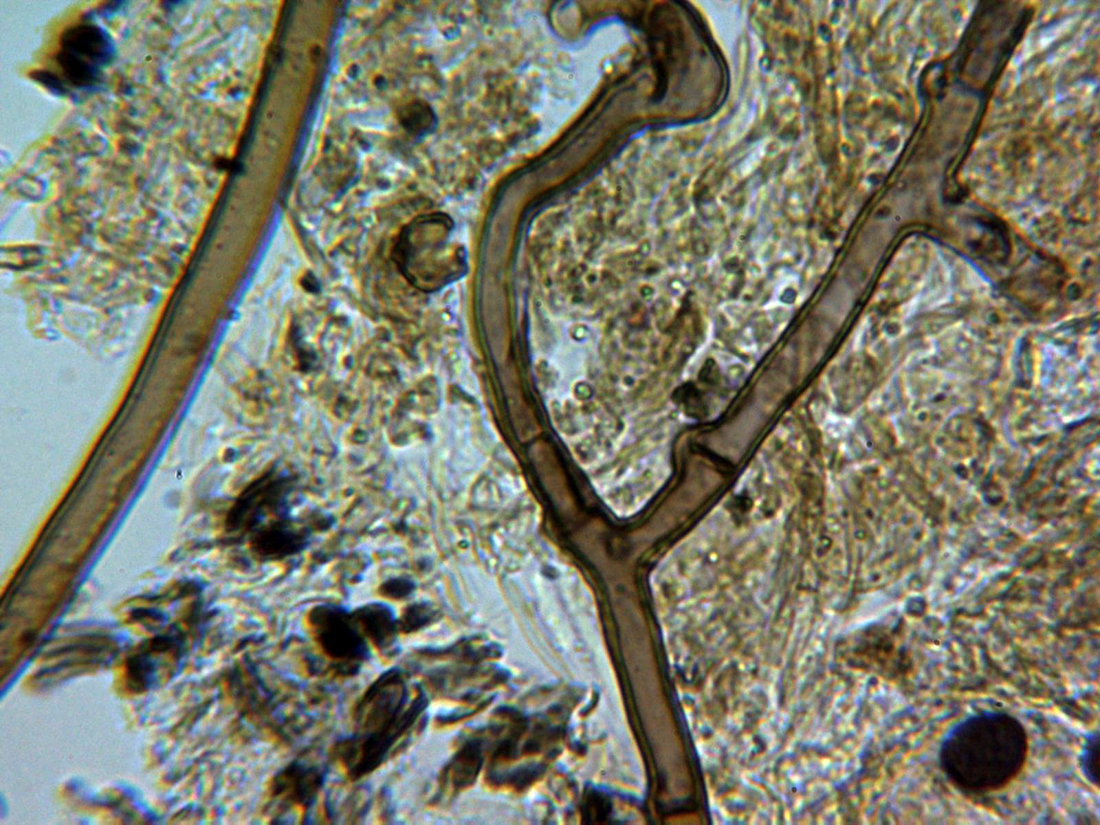 Hifas subiculares de paredes gruesas sin incrustaciones y con fíbulas: