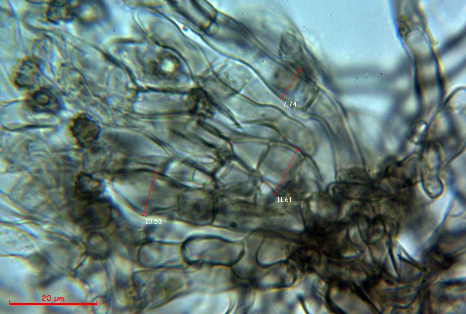 Una imágen de las hifas subhimeniales con inflamientos, septos cortos y sus medidas en anchura:
