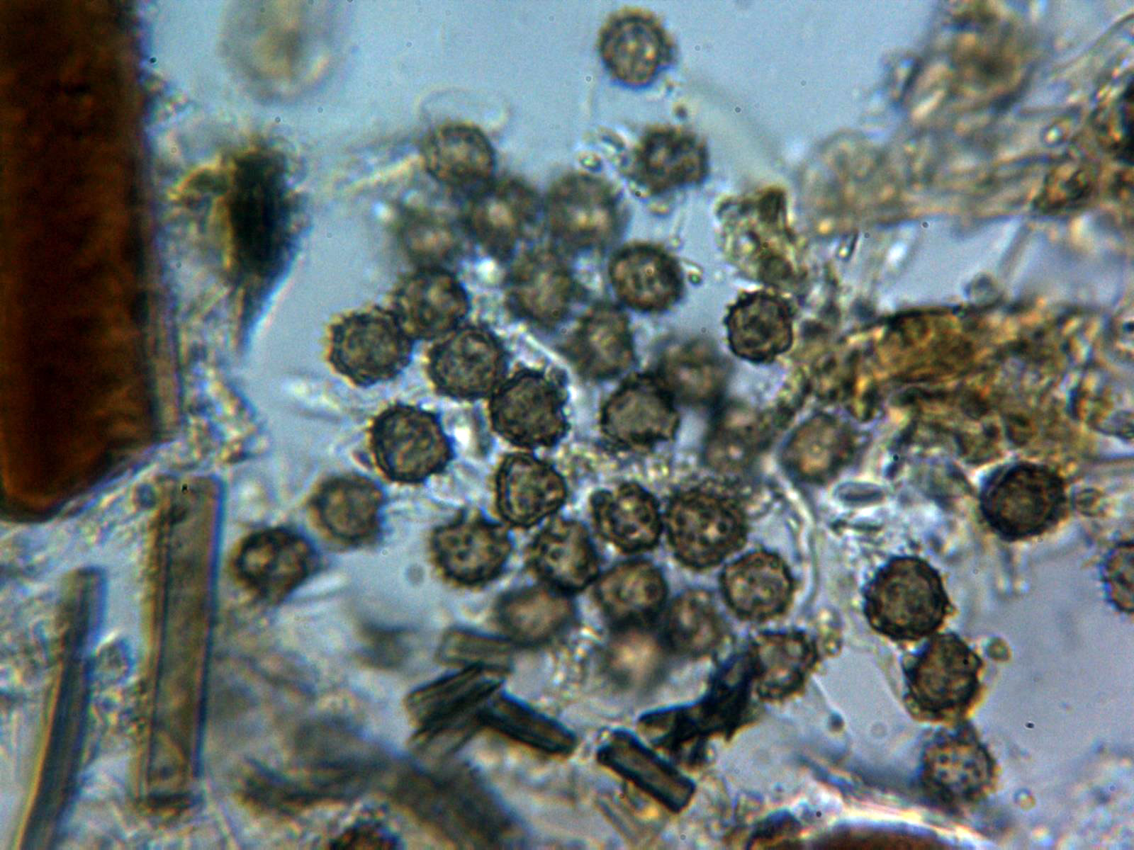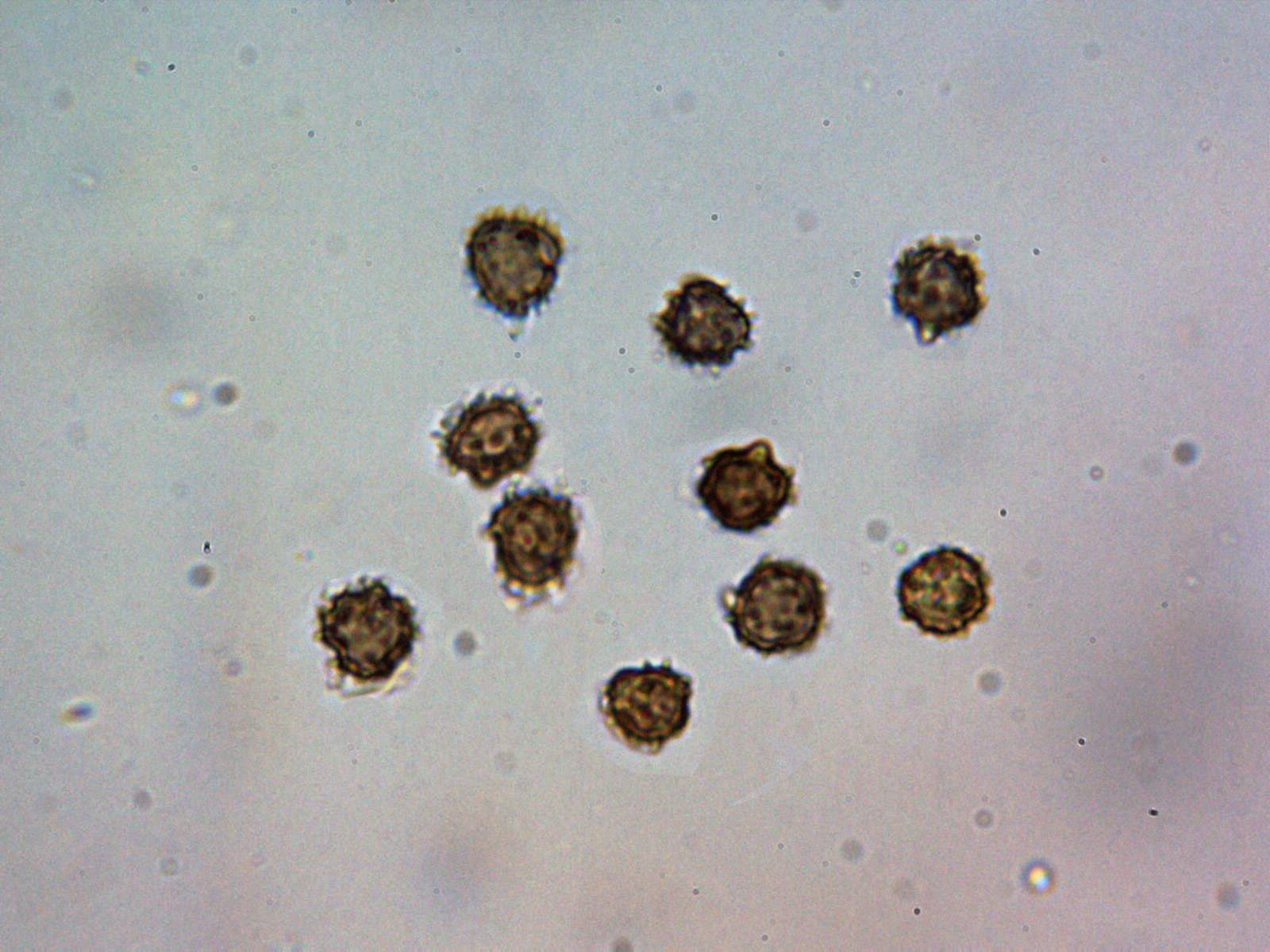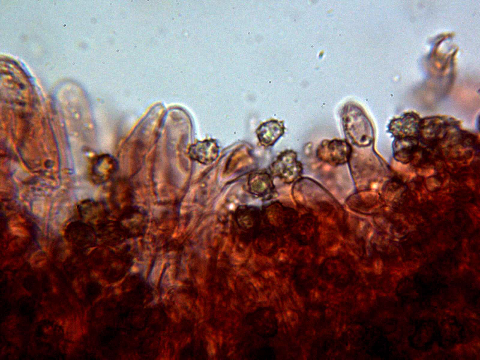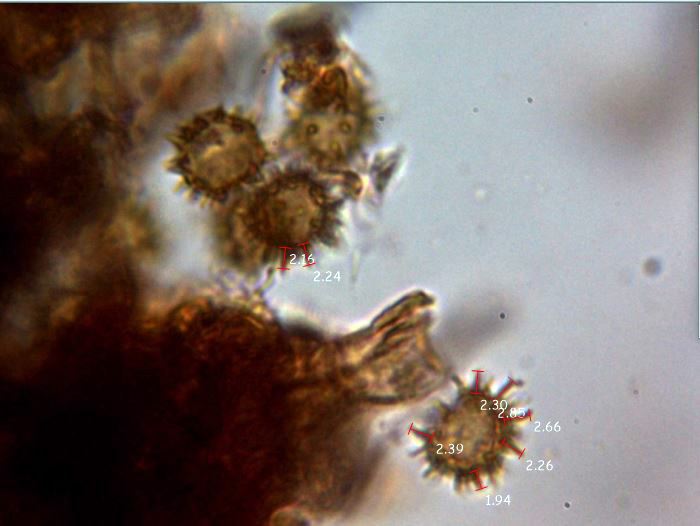 Atendiendo a las Claves del género, por la ausencia de cistidios, esporas más grandes de 7 µm. sin contar las espinas, estas espinas sin bifurcaciones, forma globosa de estas con el contorno regular, el color marrón de estas y con un tamaño de las espinas de hasta 2,5 µm., conducen al grupo de la Tomentella stuposa, la Tomentella lapida y la Tomentella alpina, por la ausencia de incrustaciones en las hifas subiculares solo nos queda la Tomentella alpina propuesta para la que se citan unas medidas eporales de entre 7,5 a 9,5 µm. Aquí me ha salido un "cromo nuevo"