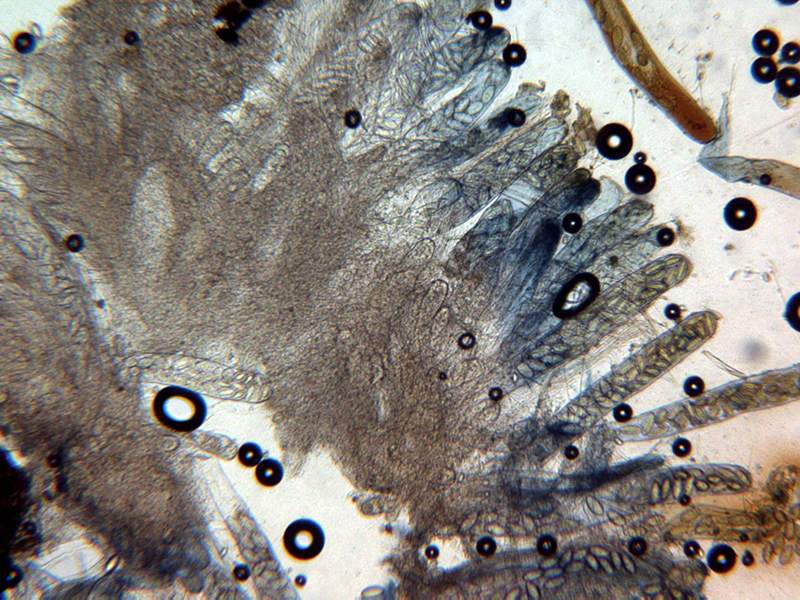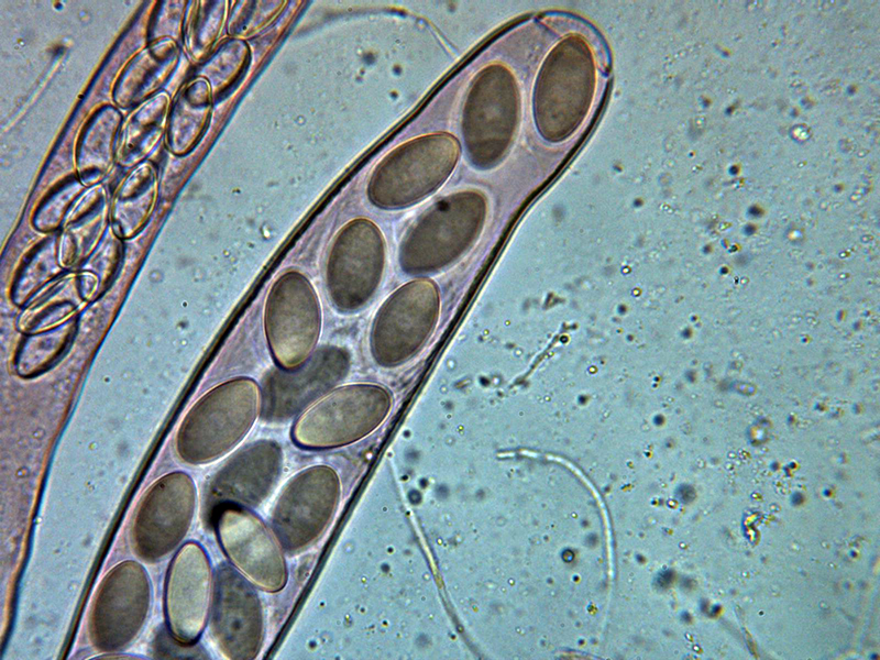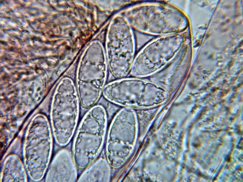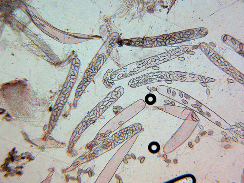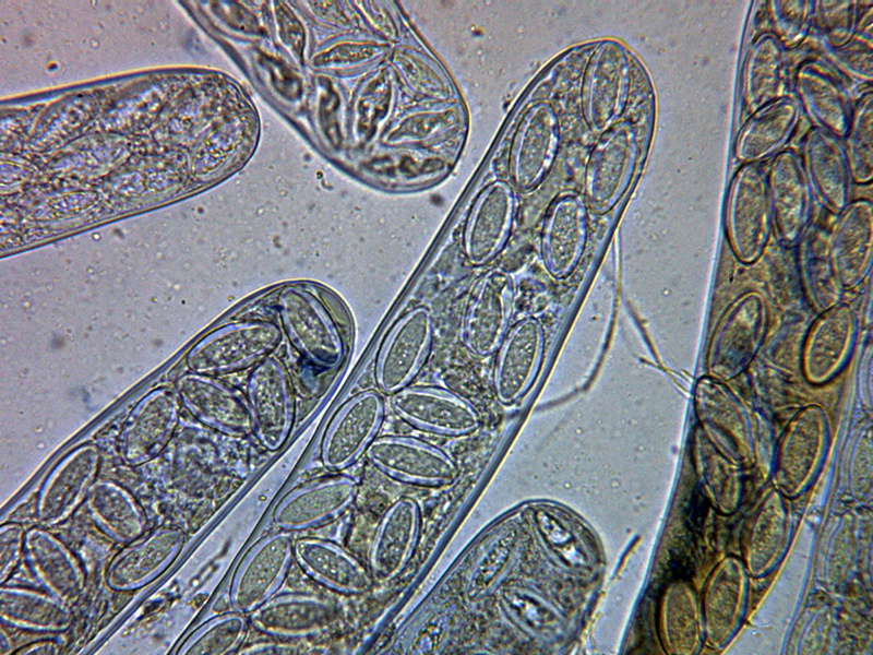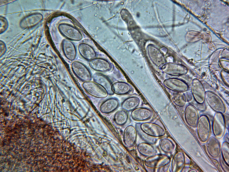 Ascos muy visibles ya a solo 100 aumentos de entre 382 a 418 µm. de largo y una anchura de entre 46 a 54 µm., con reacción amiloide al Melzer de su contenido, los que he podido contar mayoritariamente con 32 esporas.