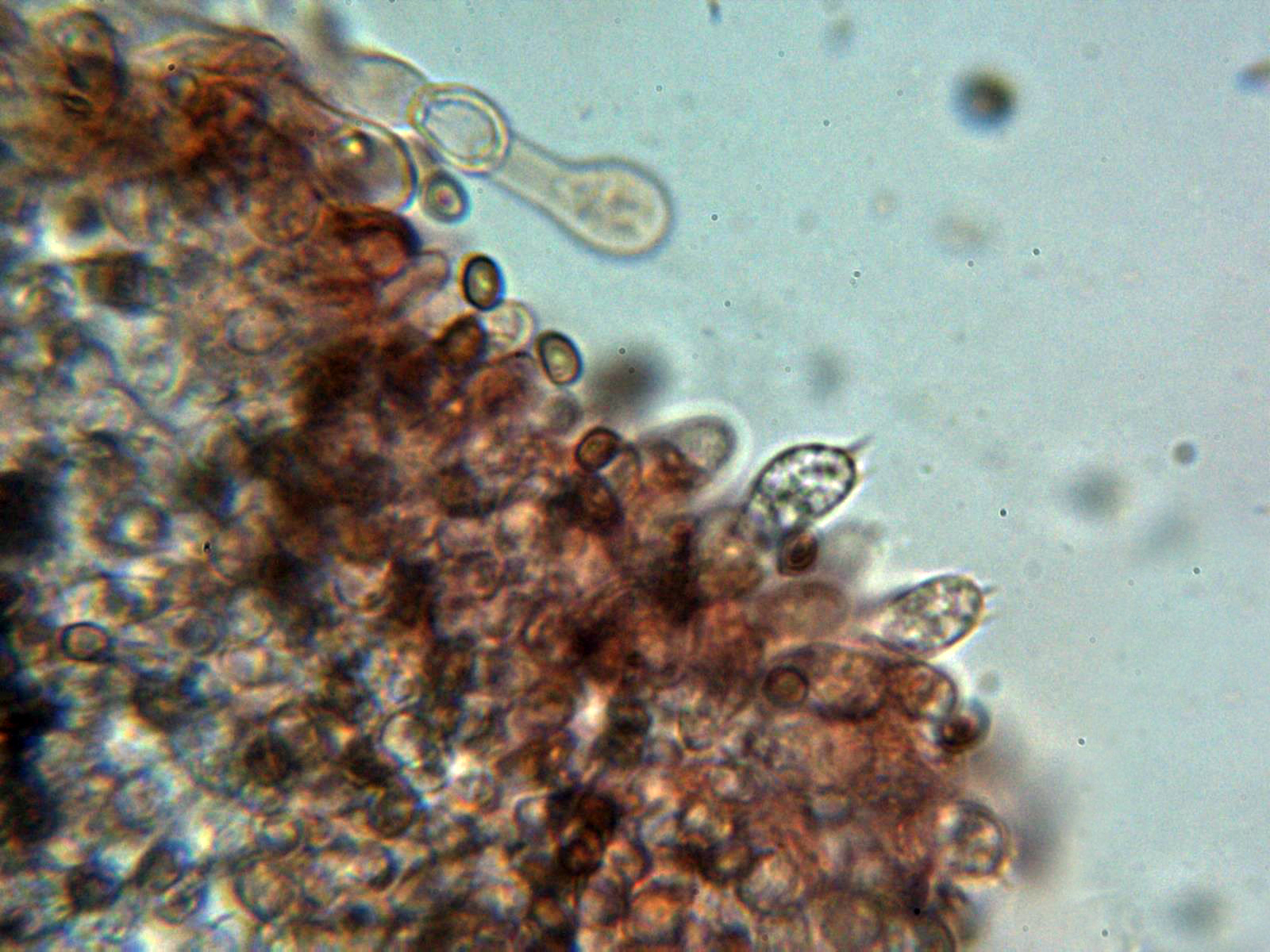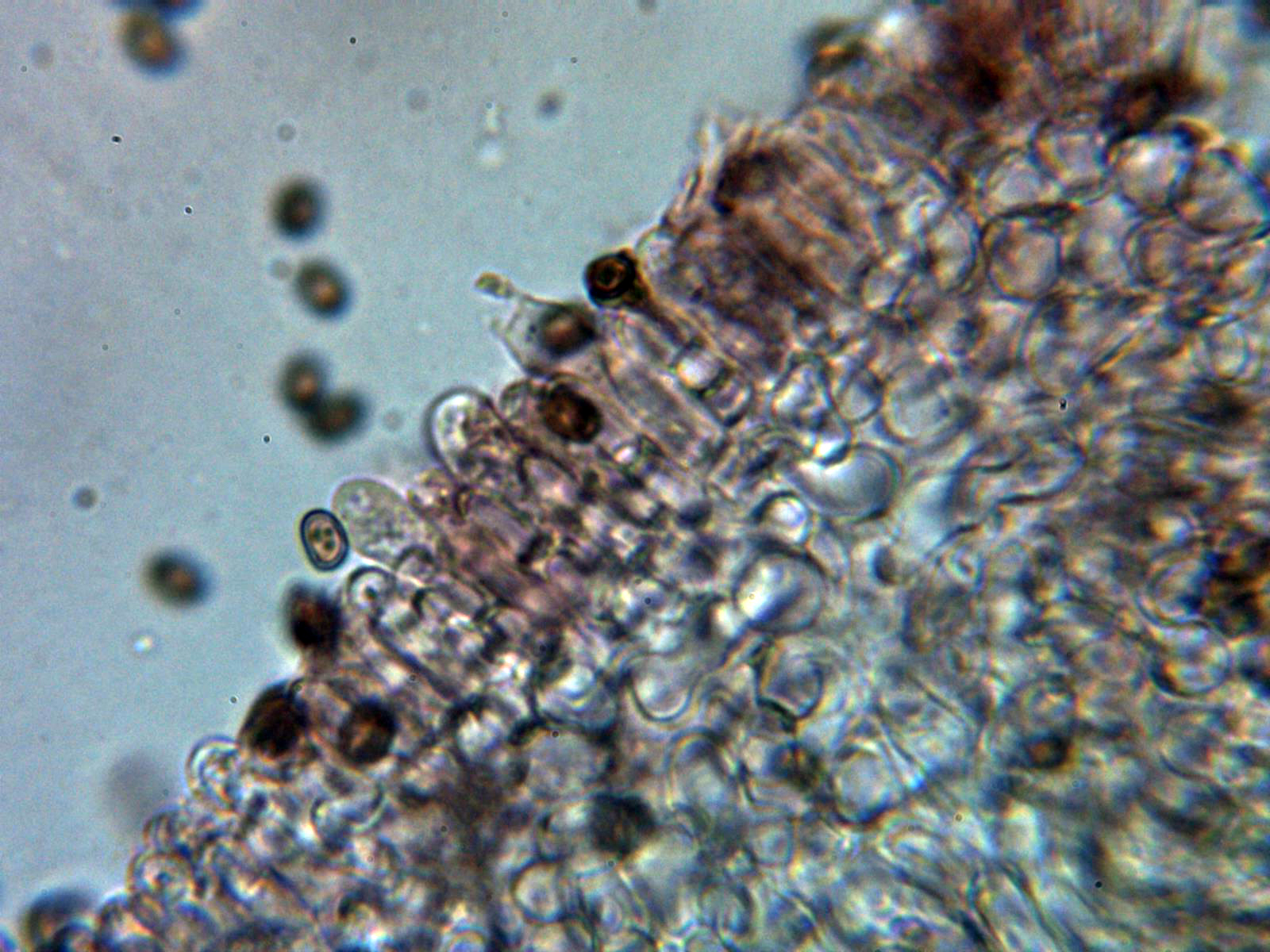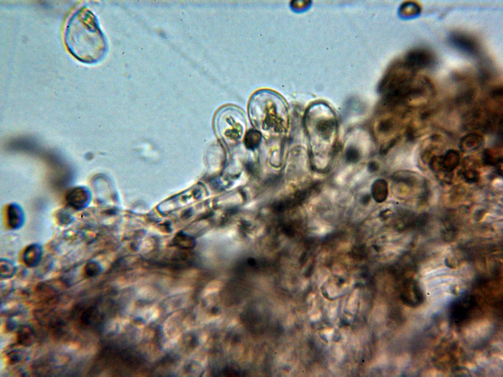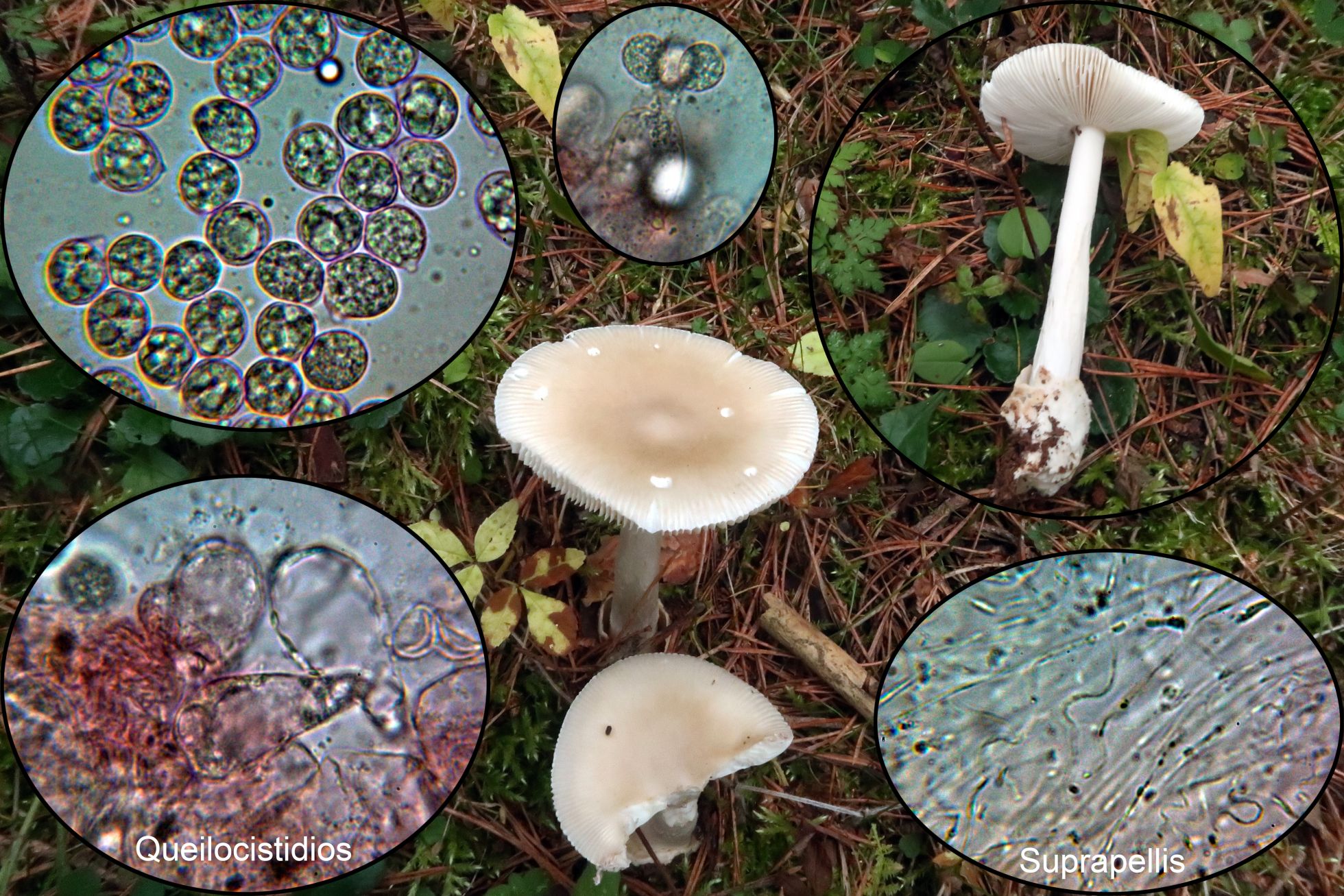 Hifas vesiculosas a modo de queilocistidios en la arista laminar, pleurocistidios no observados: