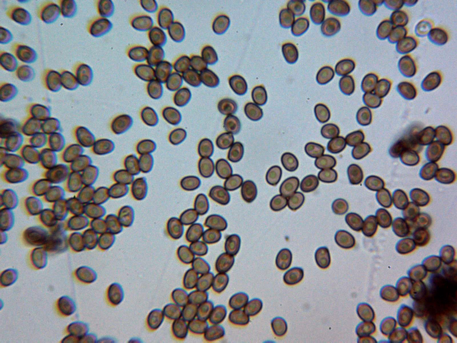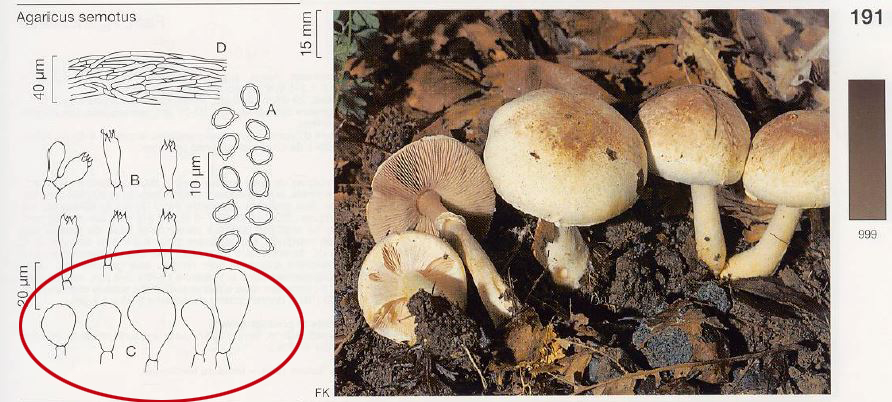 Nota: Esta determinación se ha hecho en base a las Claves de Funga Nórdica, sin embargo las medidas esporales citadas en las mismas Claves se encuentran por encima de mi propuesta (5-6 x 3.5-4 μm), no obstante en "Les Champignons de Suisse" se citan unas medidas esporales para el Agaricus semotus de 4,4-5,6 x 3,1-3,9 um. estas medidas encajarían a la perfección con las obtenidas en el presente estudio, según la descripción original estas esporas aún deberían ser algo más pequeñas (4-5 x 2,5-3,5 μm.) aunque también concordarían perfectamente con las del estudio.
