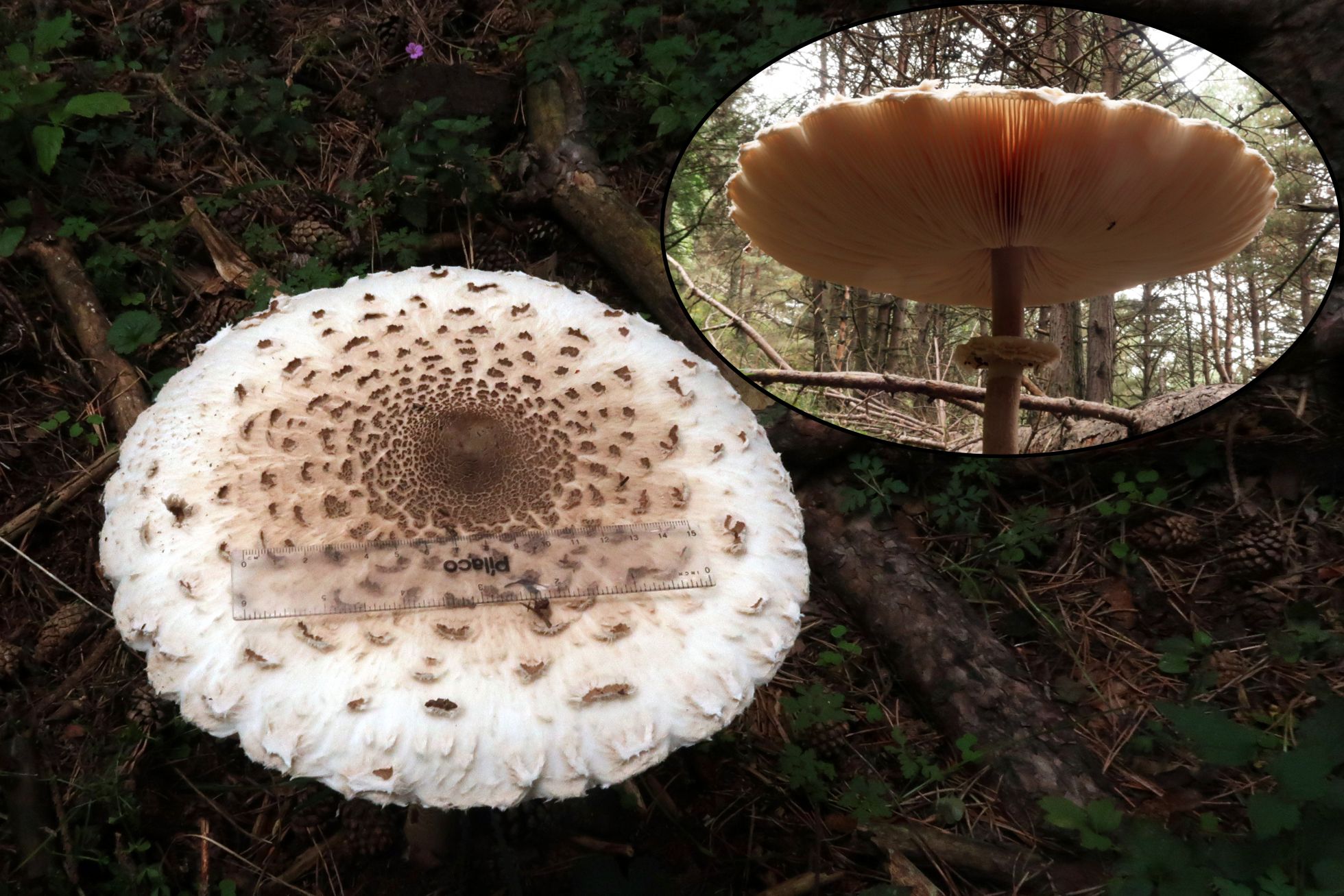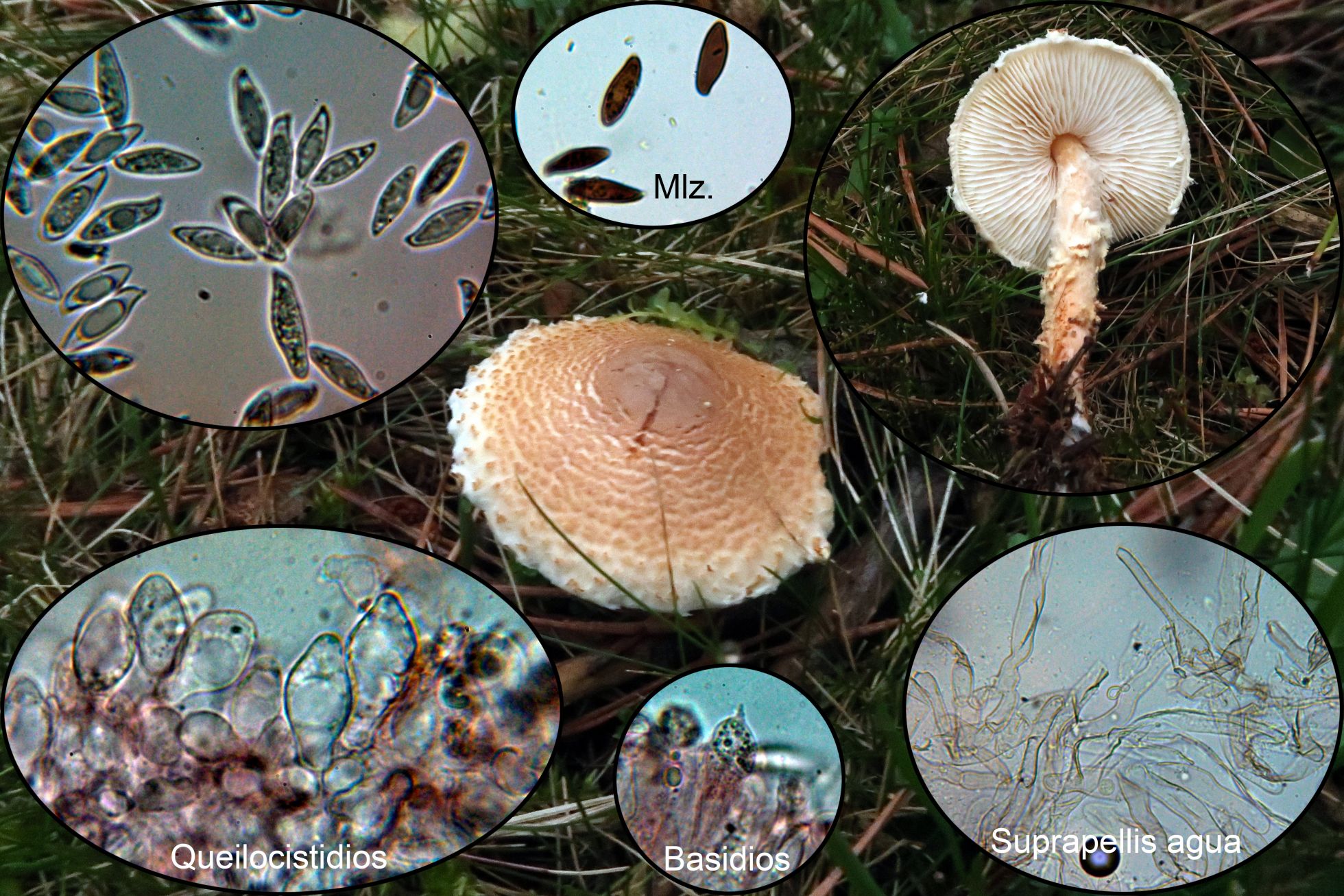 Otra Lepiota, en esta ocasión bajo coníferas, muy parecida a la Lepiota clypeolaria pero con esporas un poco más largas y un cociente Q por encima, la Lepiota magnispora: