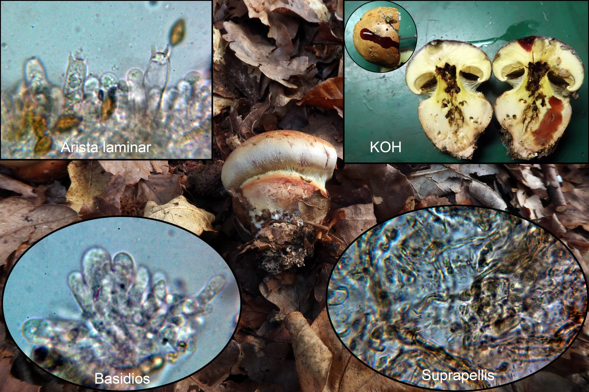 El primero un Cortinarius brotando en grupo que llamó la atención a Juan Antonio Aldama, aunque los Cortinarius acostumbran a ser complicados, no ha sido este el caso y atendiendo a la reacción al KOH a rojo intenso al instante en el sombrero y a casi negro antes de un minuto, así como la reacción de su carne a rojo, todo hace pensar en el Cortinarius alcalinophilus: