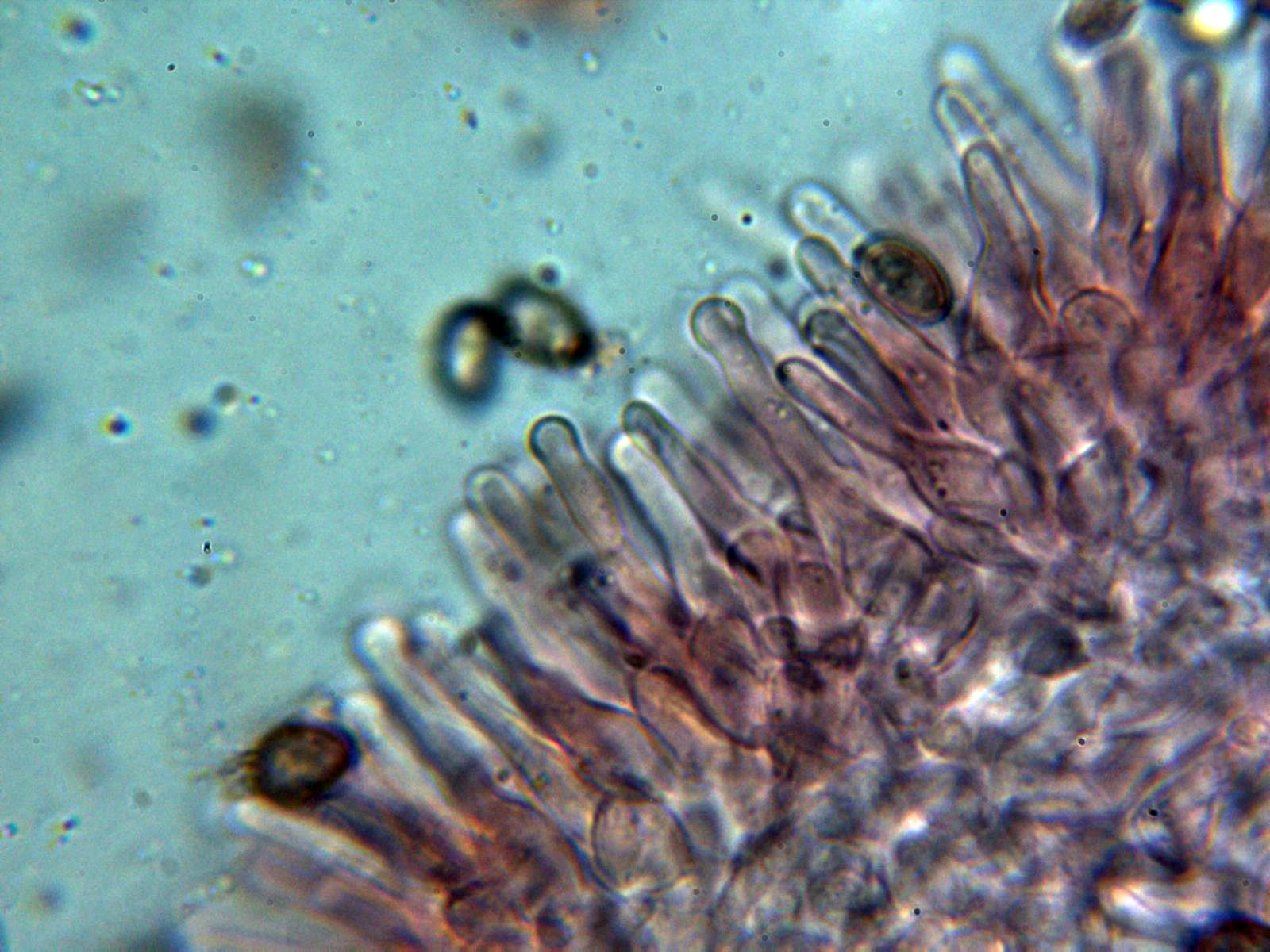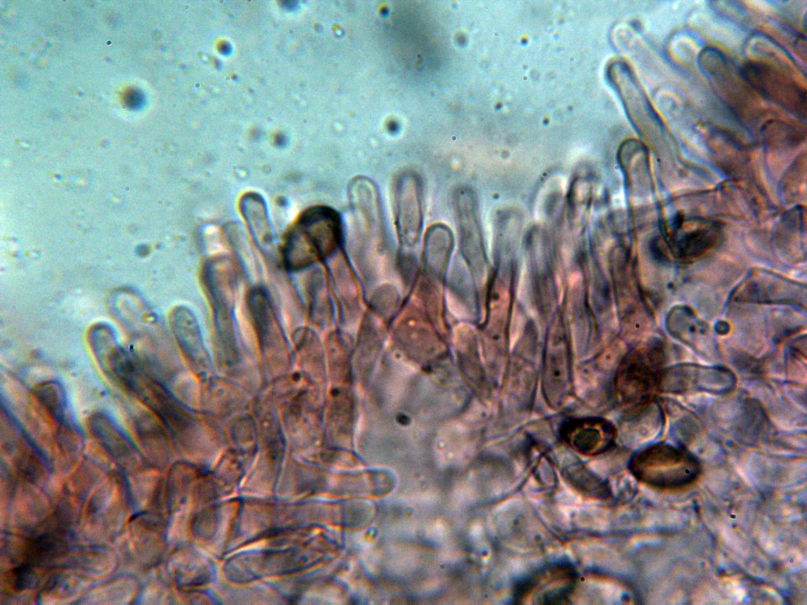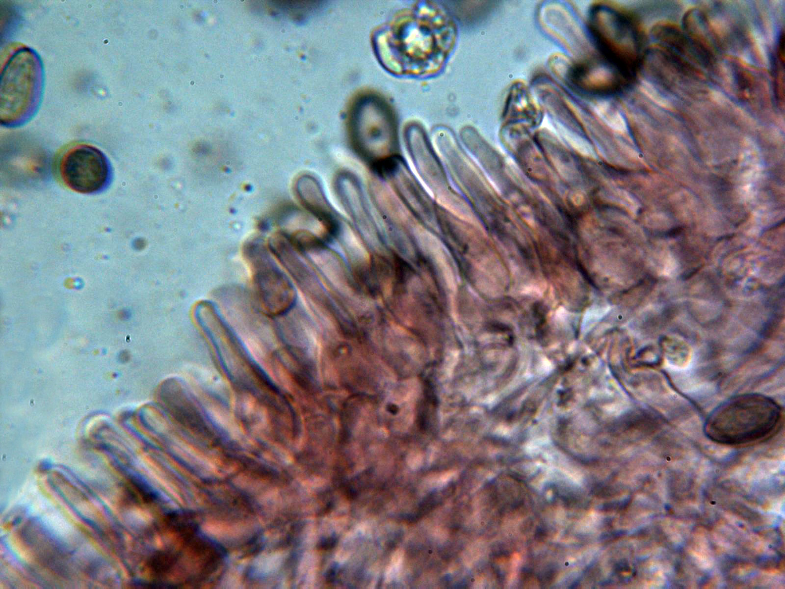 Queilocistidios cilíndricos ensanchados en su base, sinuosos, algunos ligeramente capitados cubriendo por completo toda la arista laminar dejándola totalmente estéril: