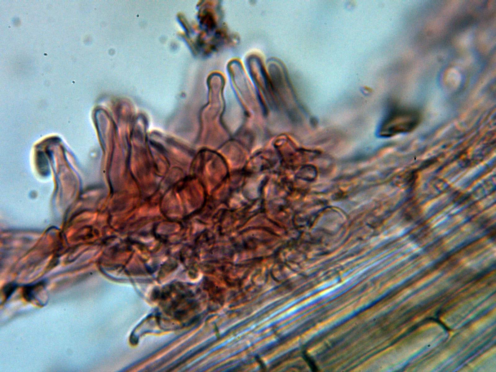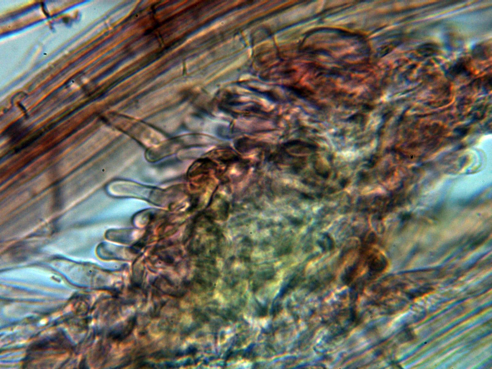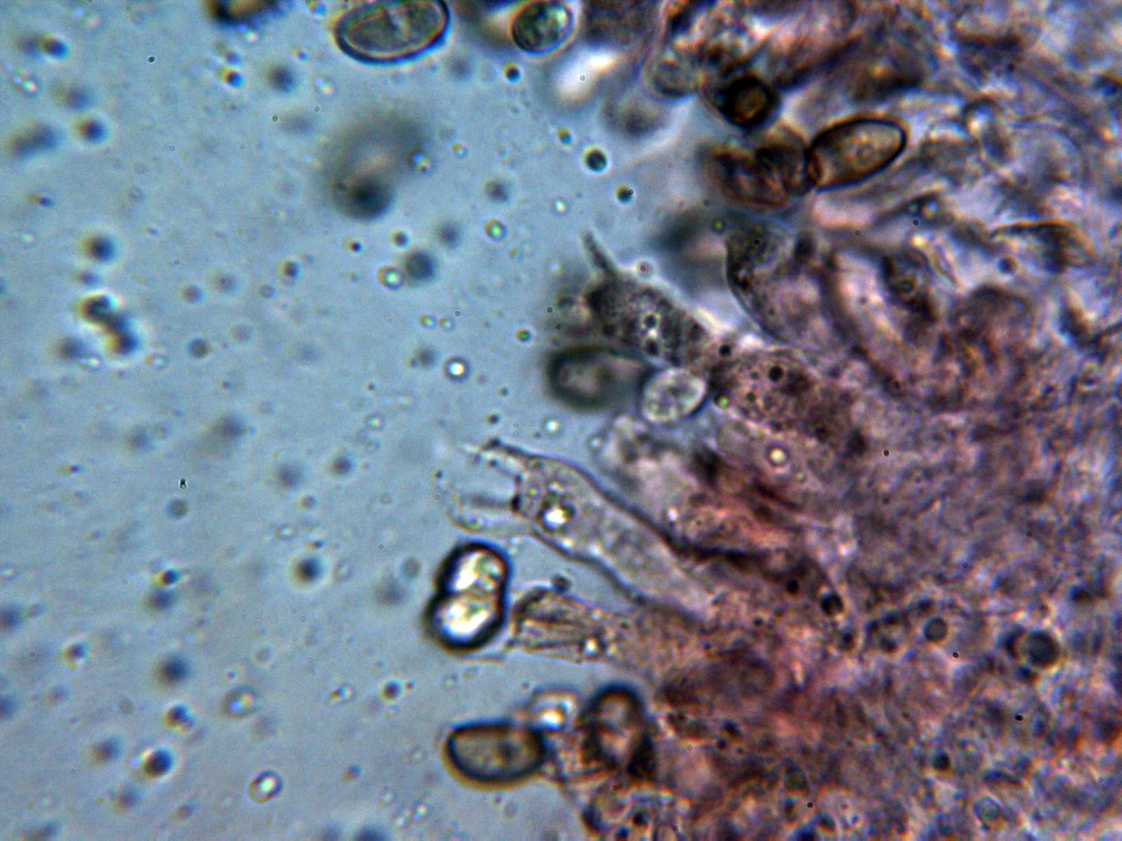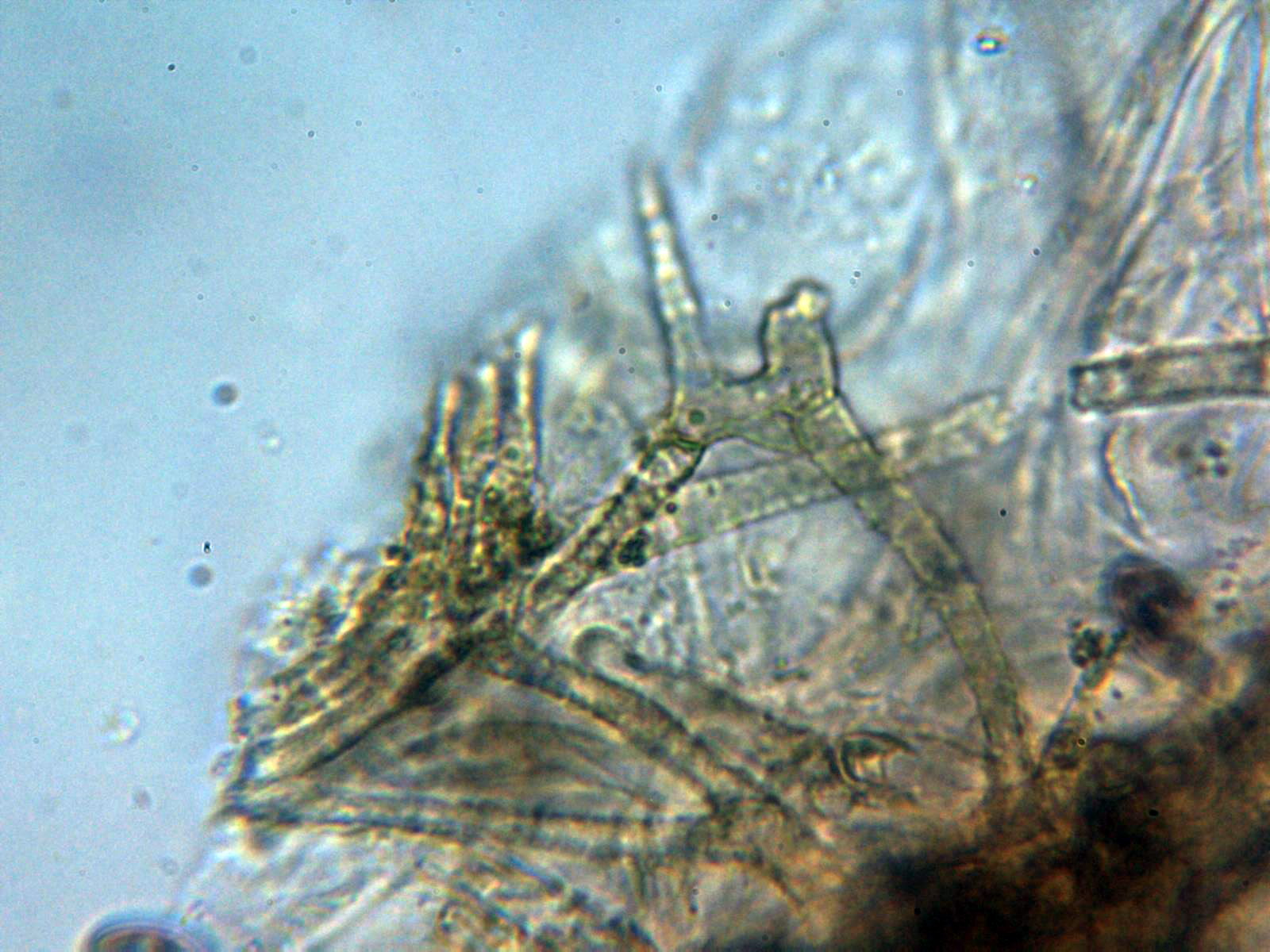 Queilocistidios cilíndricos ensanchados en su base, sinuosos, algunos ligeramente capitados cubriendo por completo toda la arista laminar dejándola totalmente estéril:
