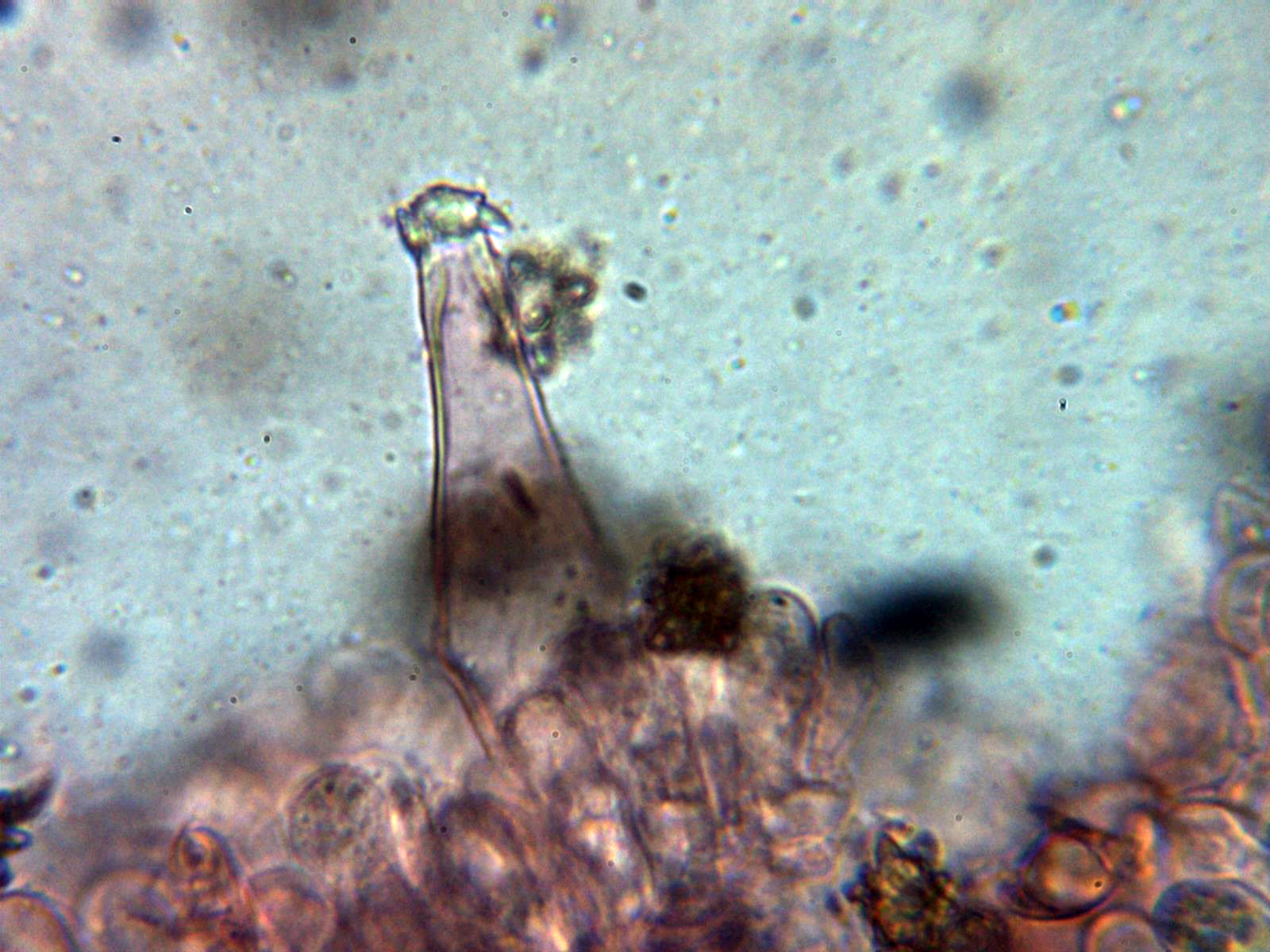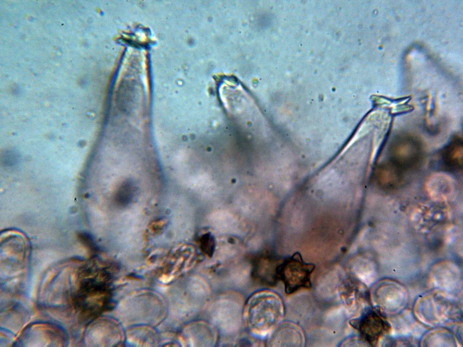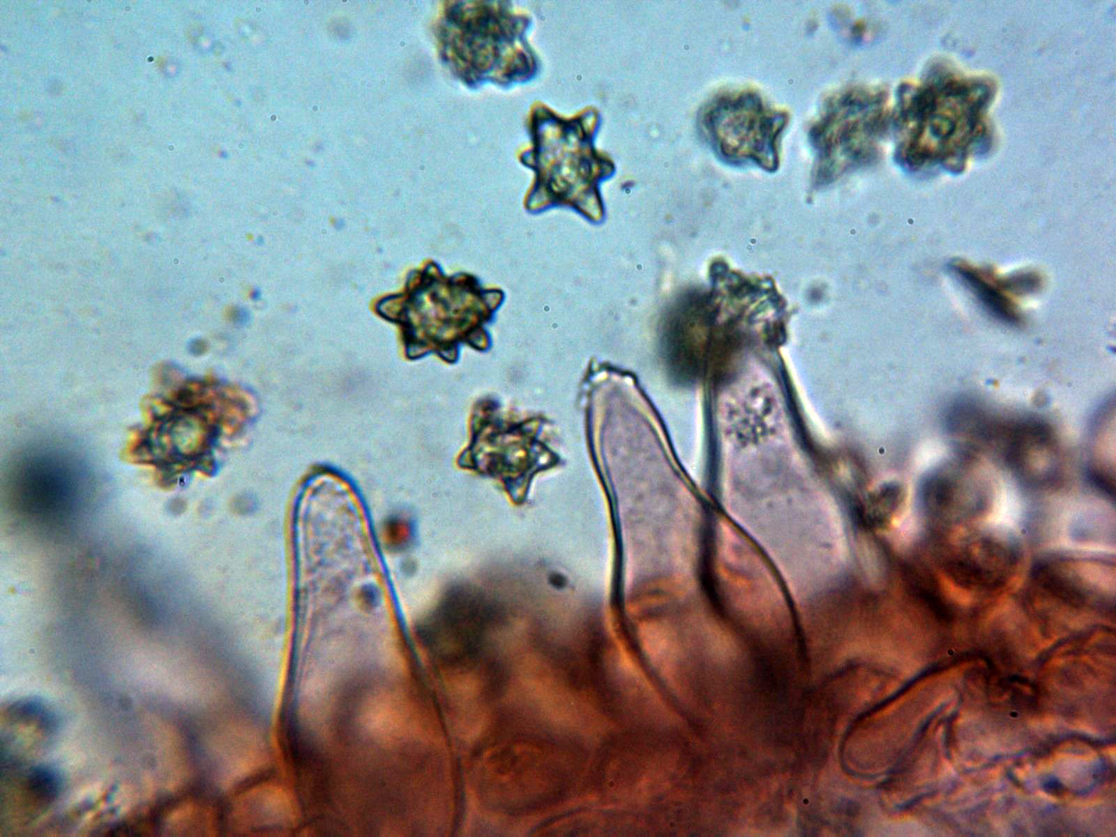 Queilocistidios abundantes , ventrudos y con cristales en el ápice: