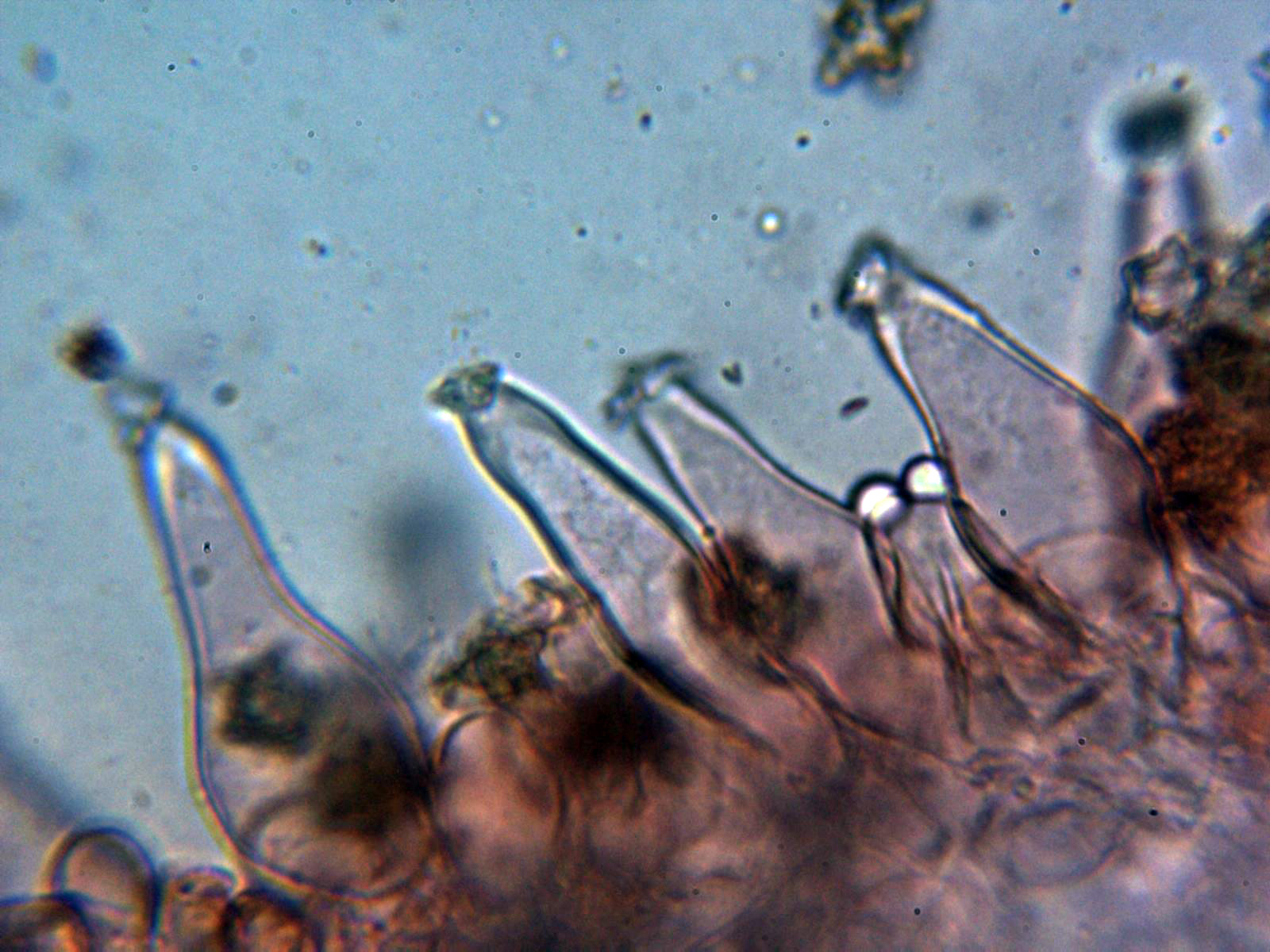 Pleurocistidios presentes ya mas dispersos y con una morfología parecida a los queilocistidios: