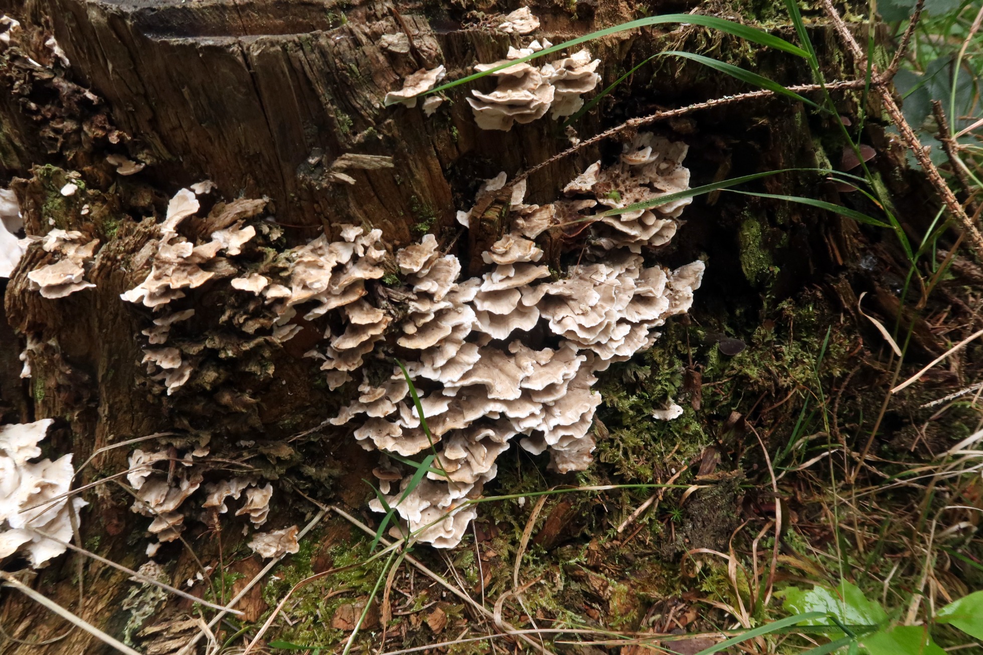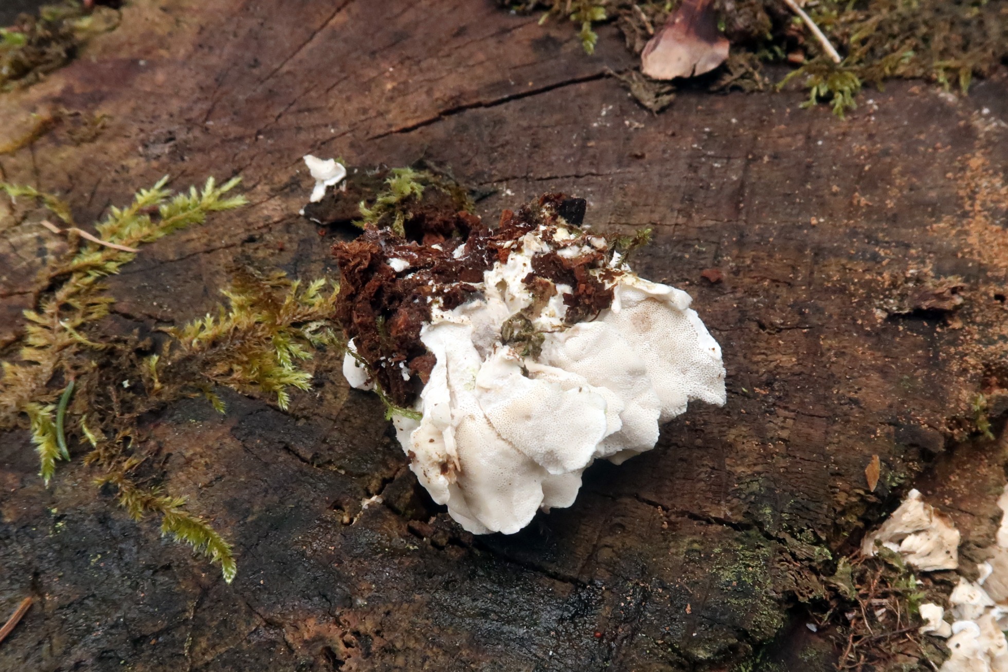 Un bello Polyporal creciendo de manera masiva sobre un tocón, a pie de campo aposté por Olygoporus y ya en el mismo sitio Koldobika le puso hasta apellido, Postia floriformis, ambos estábamos acertados ya que se trata de Oligoporus floriformis = Postia floriformis, aunque actualmente debemos denominarlo: