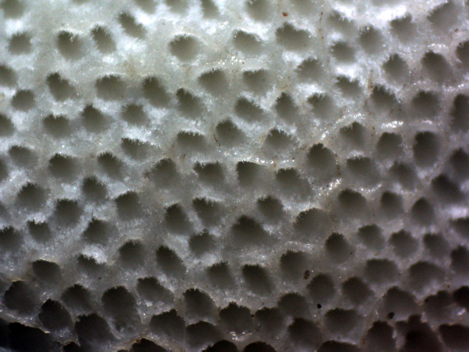 Los poros a 40 aumentos (entre 6 y 8 por mm.) angulosos y de pared gruesa: