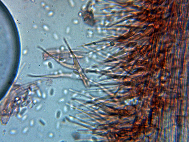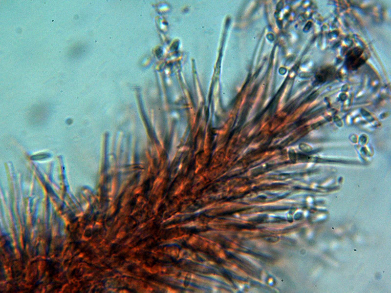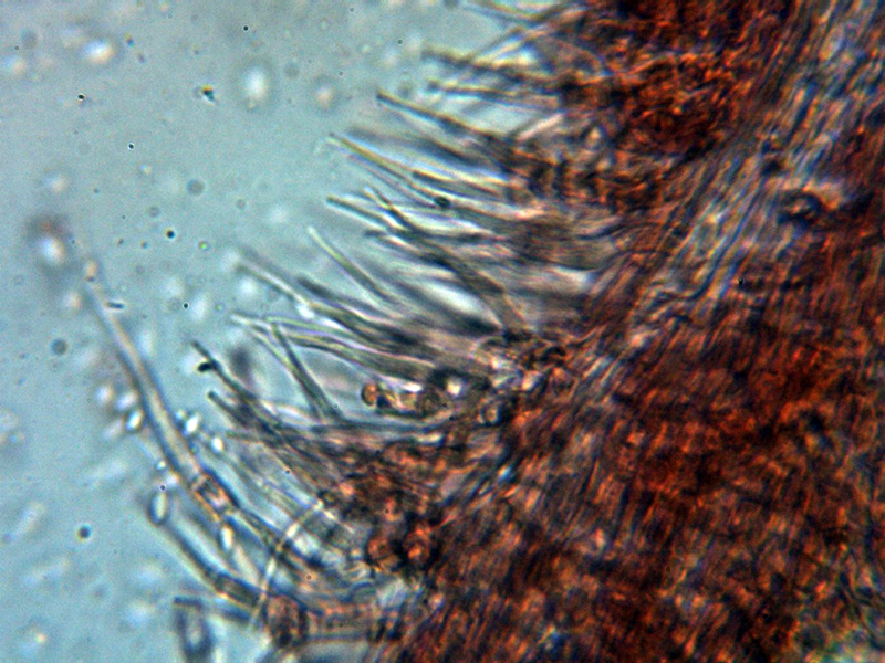 Hifas conidiógenas con terminaciones apuntadas, algunas con forma de horquilla y unas medidas de 28.5 – 43.9 × 2 - 3.5 µm.