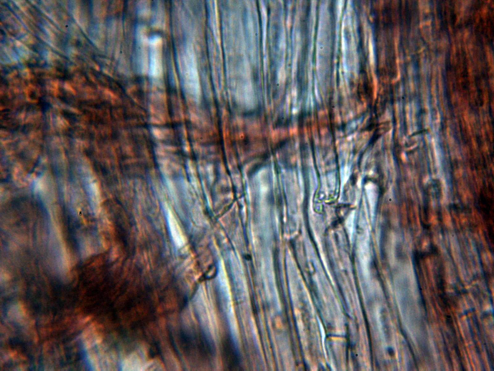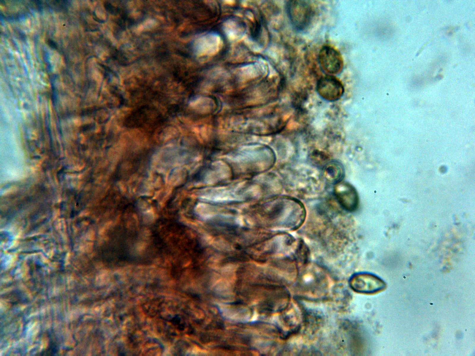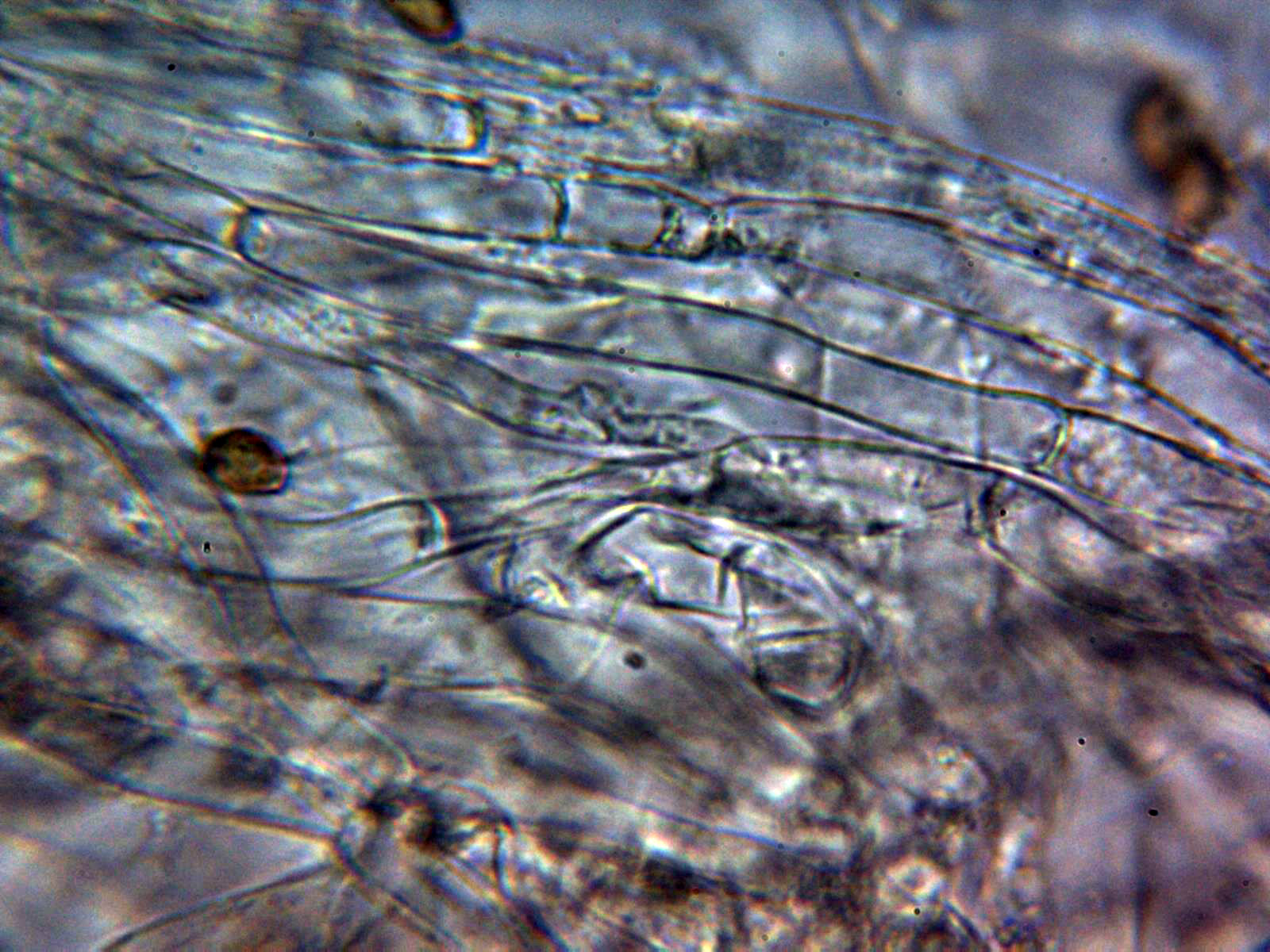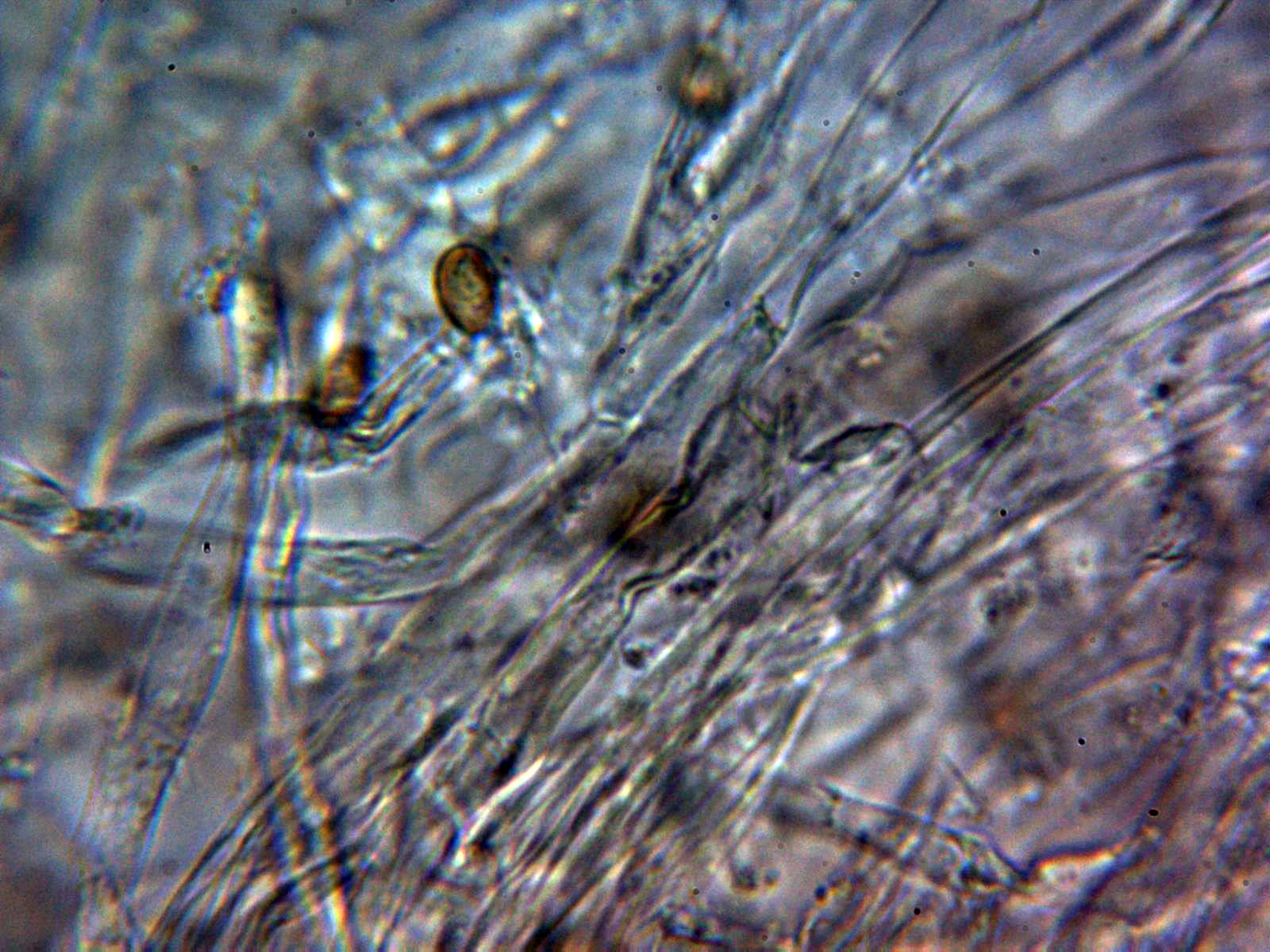 La pileipellis a 1000 aumentos en agua formada por hifas filamentosas dispuestas más o menos paralelamente, con tenue pigmento intracelular de color marrón, provistas de fíbulas y con una anchura de entre 5,6 a 10,7 µm.,