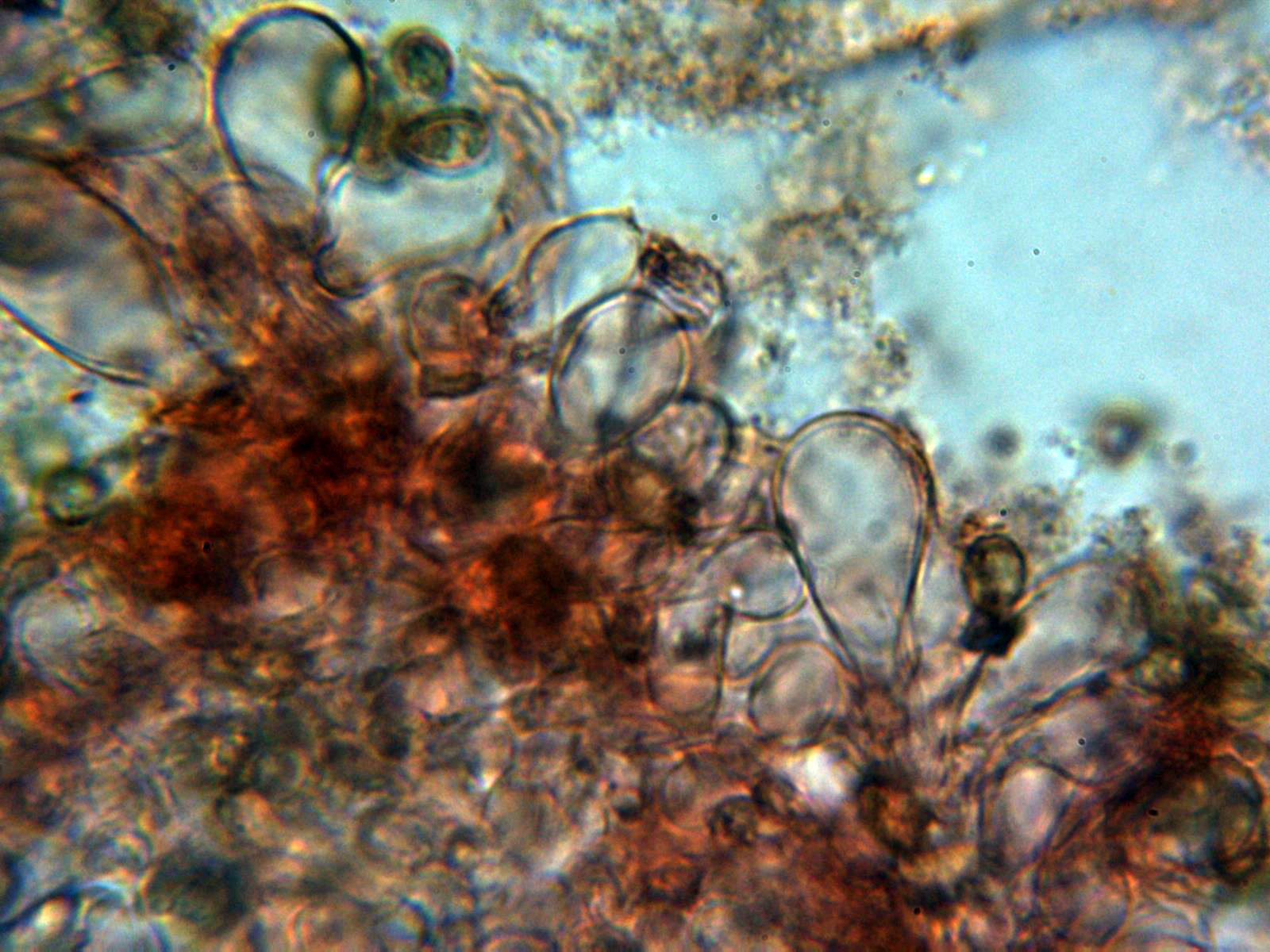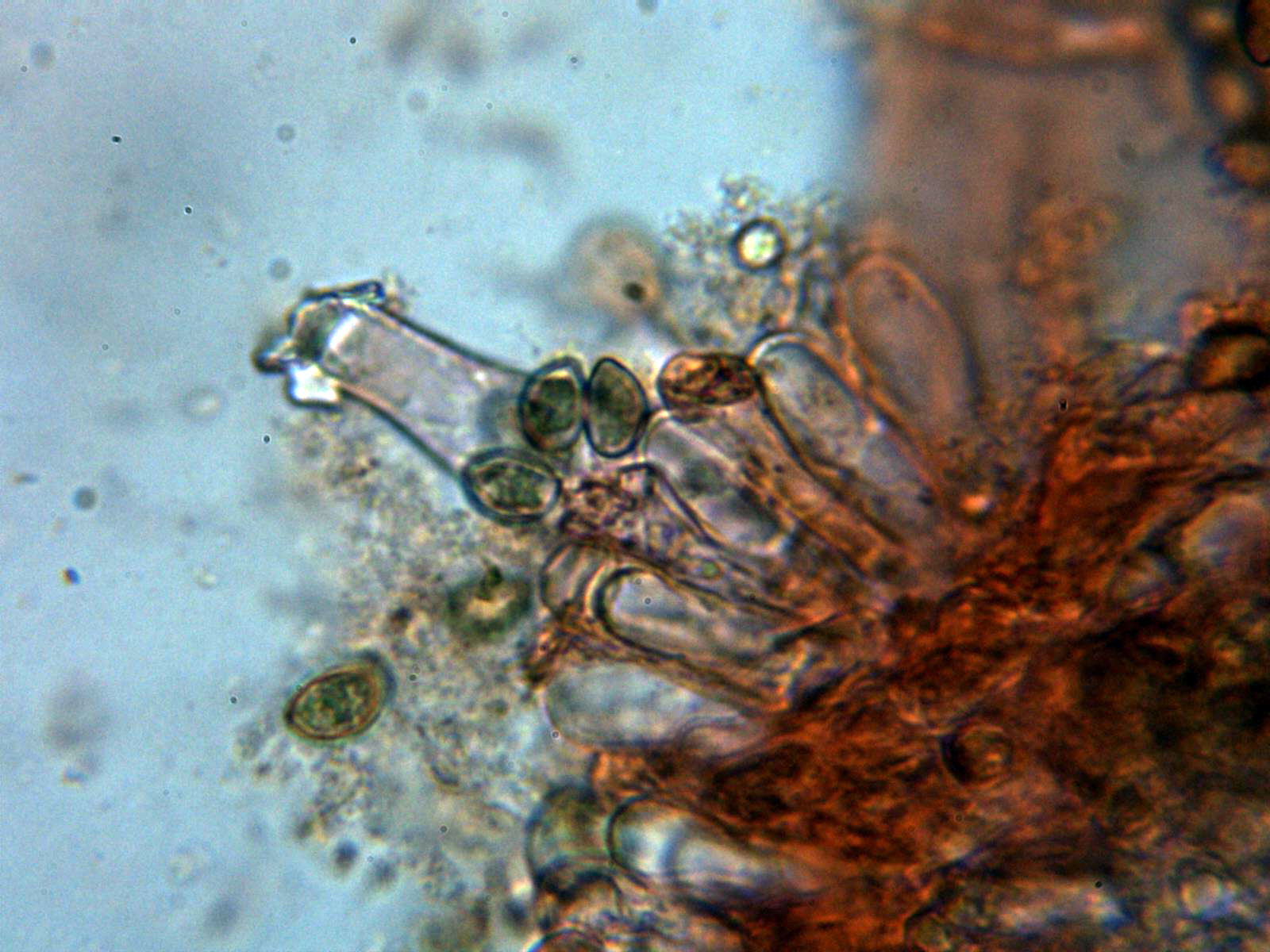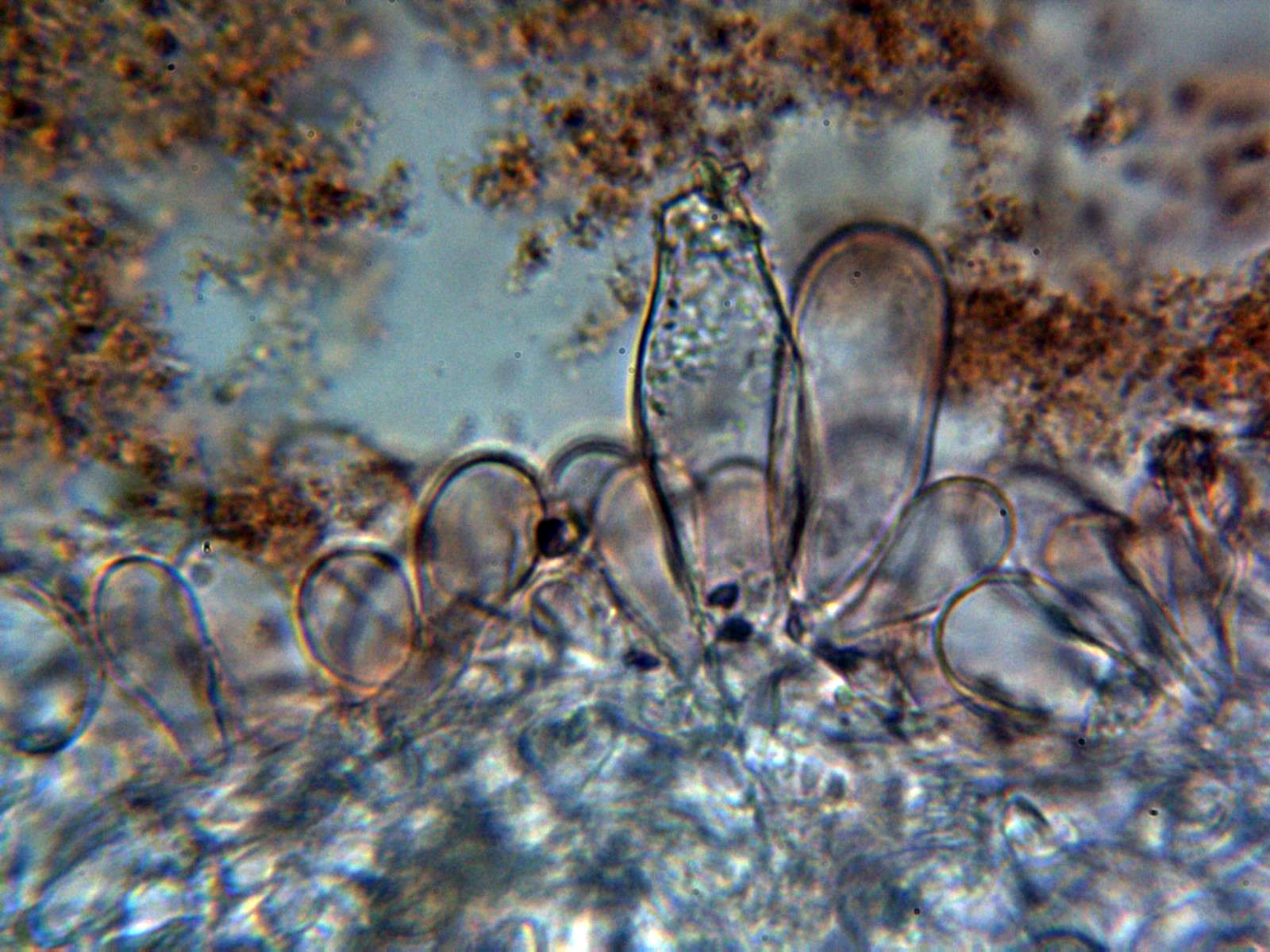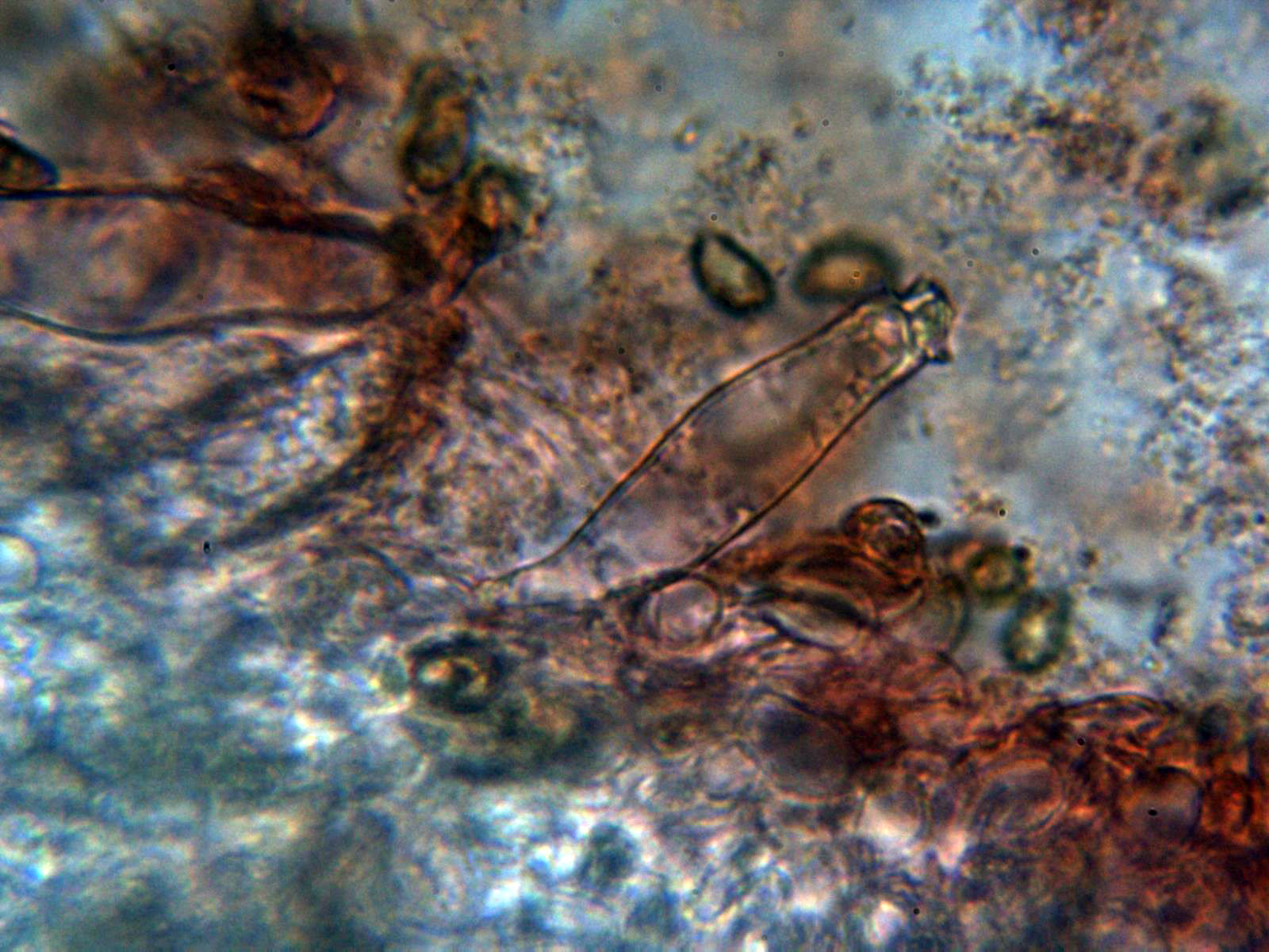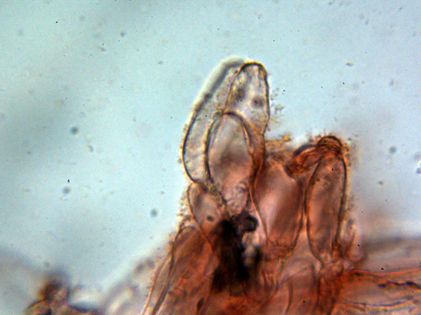 La pileipellis a 1000 aumentos en agua formada por hifas filamentosas dispuestas más o menos paralelamente, con tenue pigmento intracelular de color marrón, provistas de fíbulas y con una anchura de entre 5,6 a 10,7 µm.,