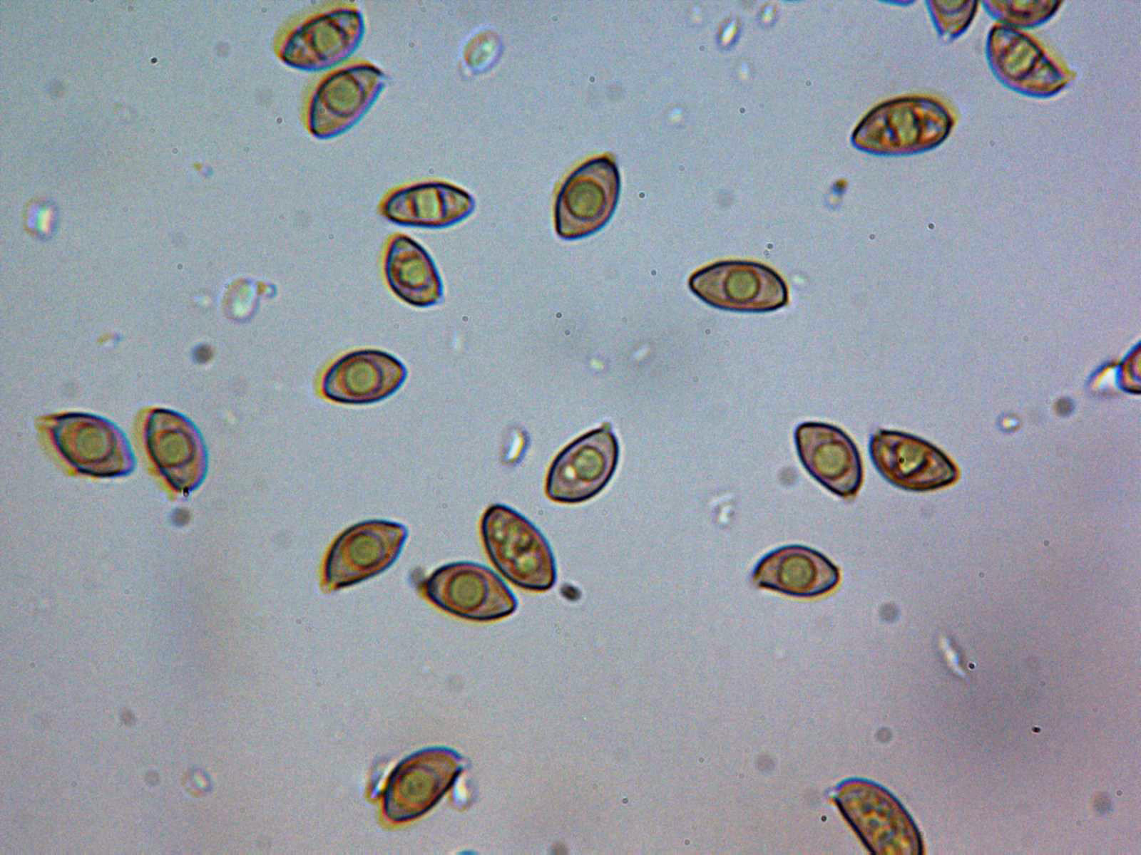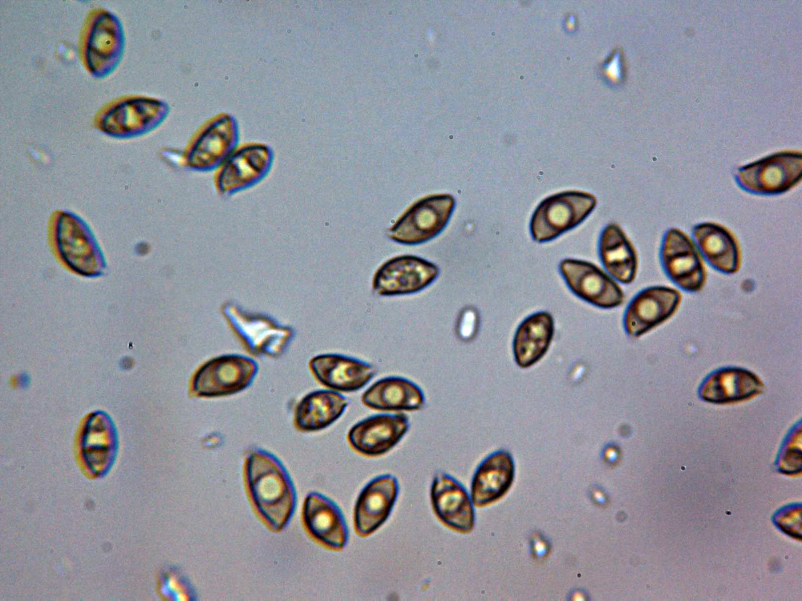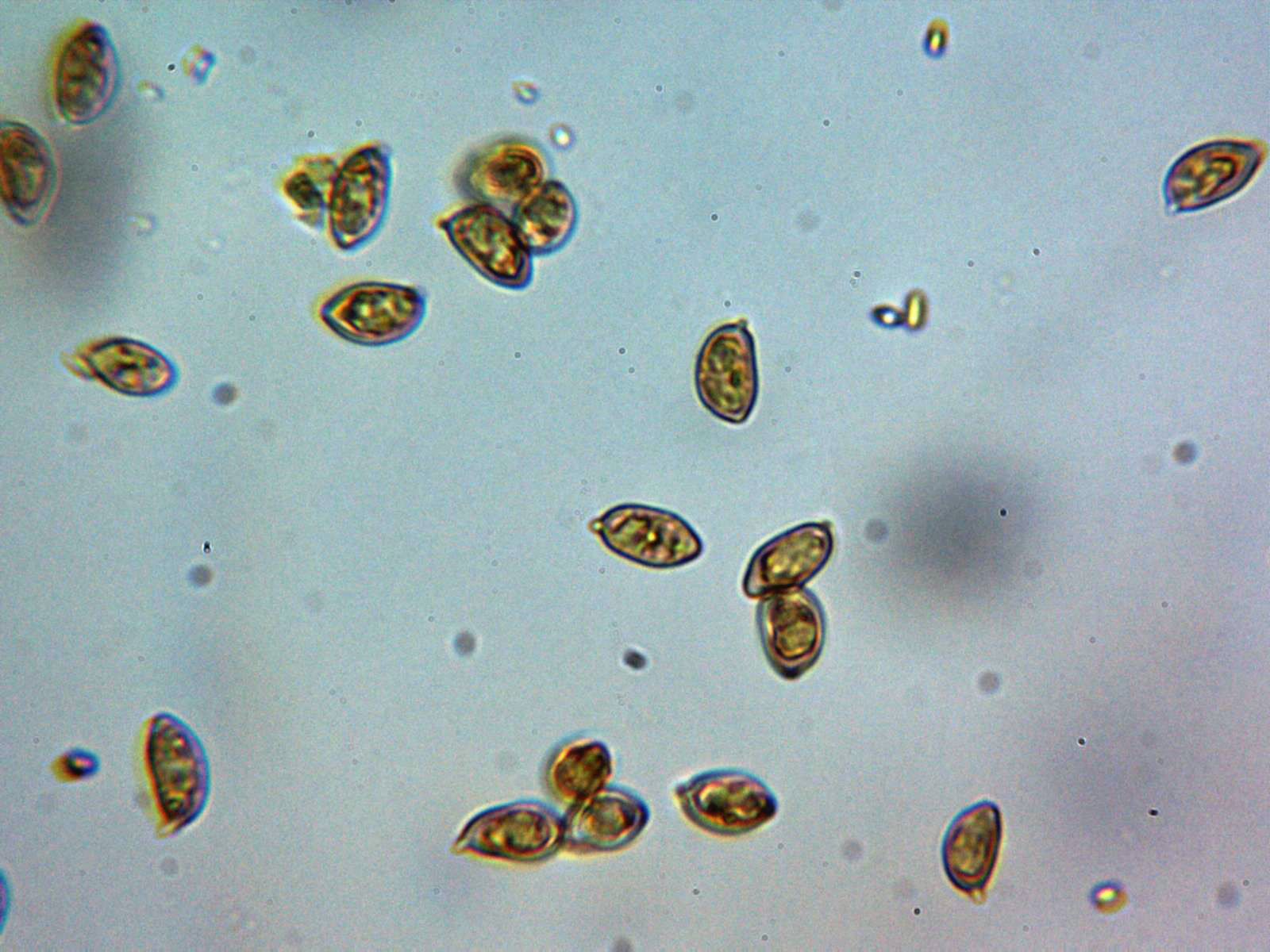 Un par de imágenes de las esporas en agua, amigdaloides y con el extremo algo apuntado.