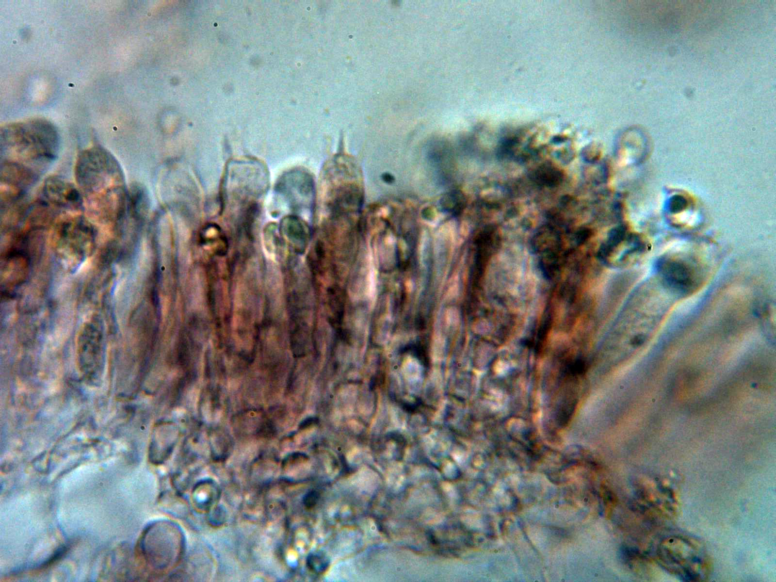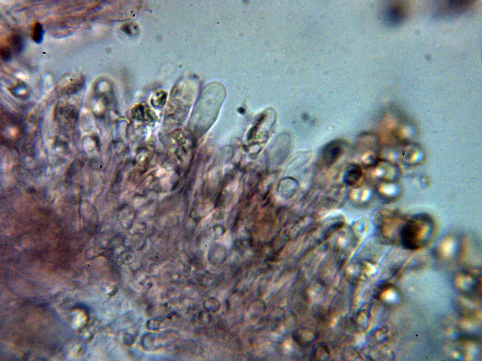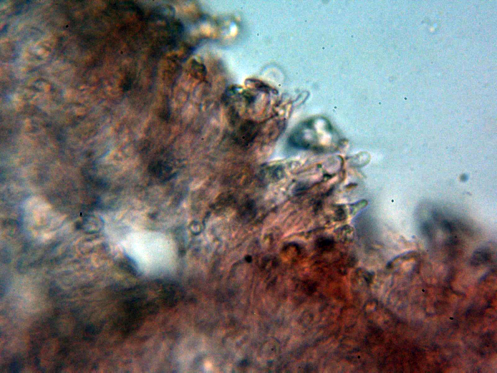 Aunque no presenta cistidios diferenciados en la arista laminar se pueden observar algunas hifas terminales a modo de pelos más estrechas que los basidios y que sobresalen algo por encima de estos.