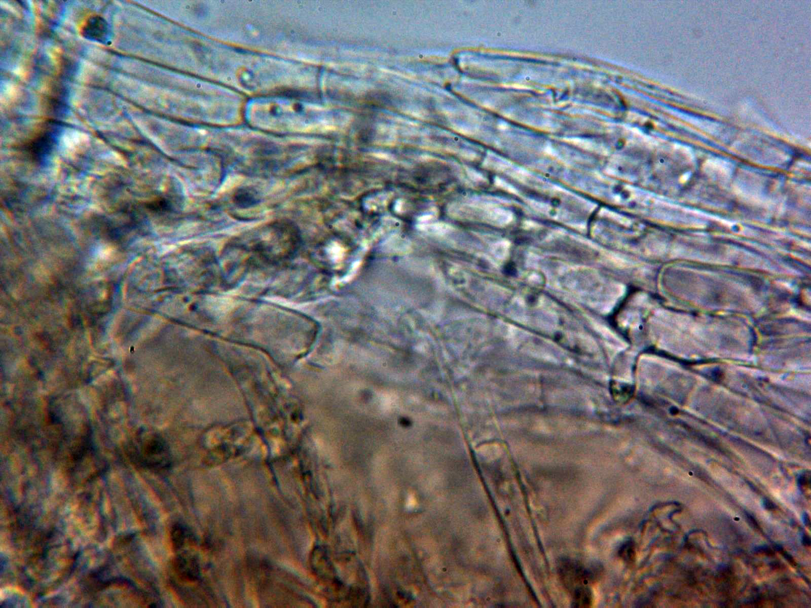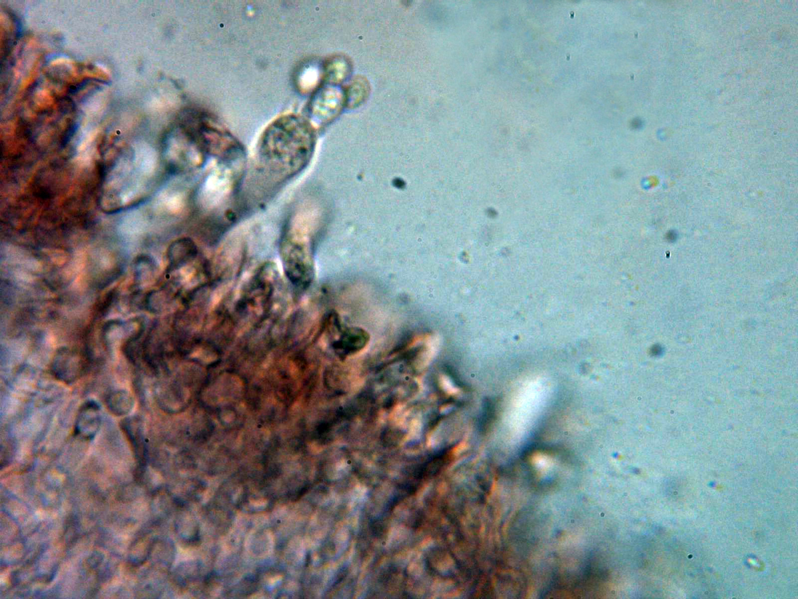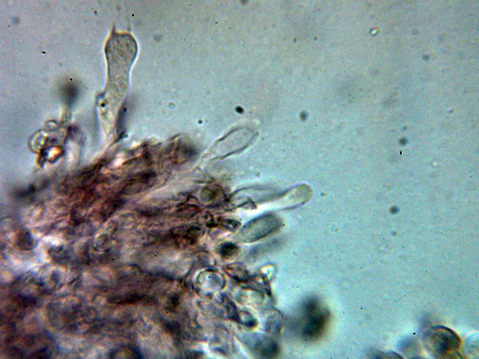 Aunque no presenta cistidios diferenciados en la arista laminar se pueden observar algunas hifas terminales a modo de pelos más estrechas que los basidios y que sobresalen algo por encima de estos.