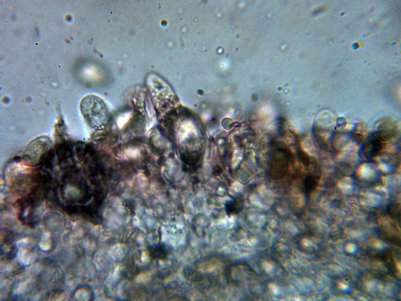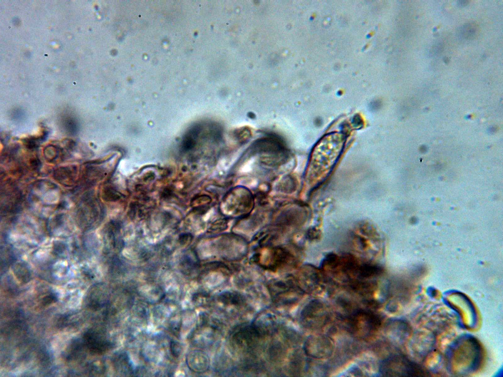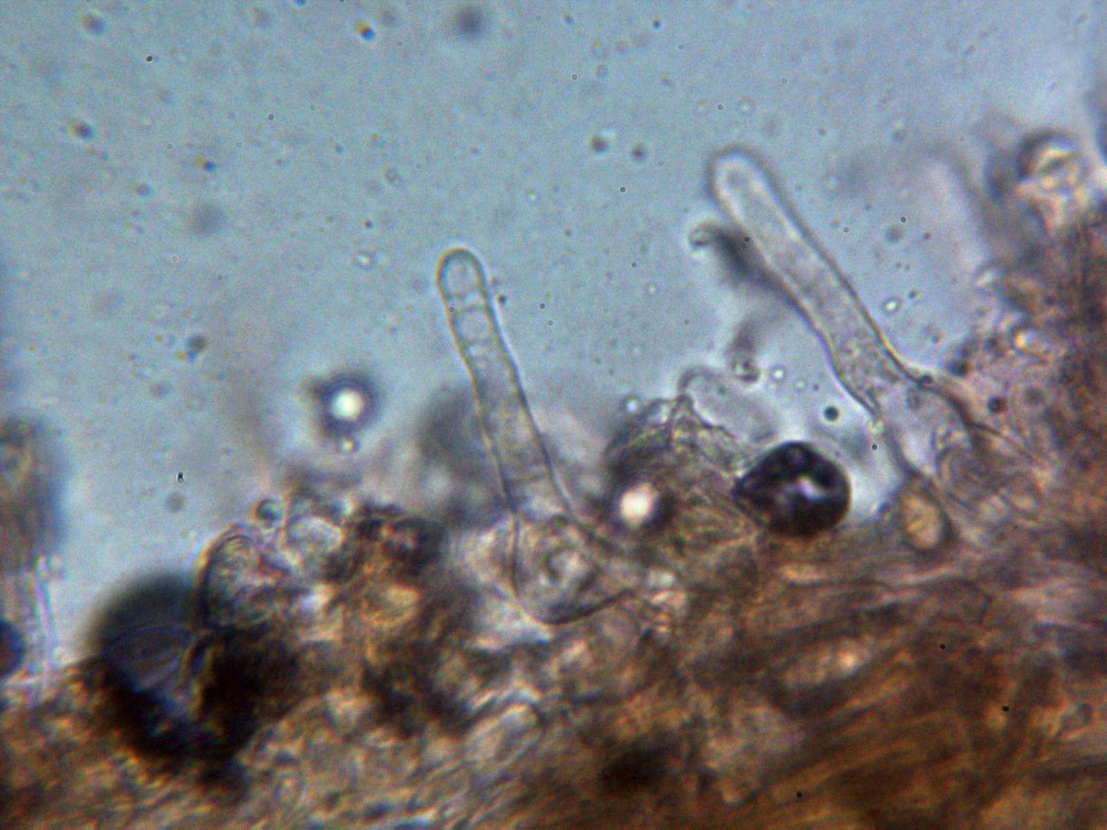 Aunque no se citan cistidios para la especie si pude observar aunque muy pocos, unas hifas terminales a modo de estos en la arista laminar: