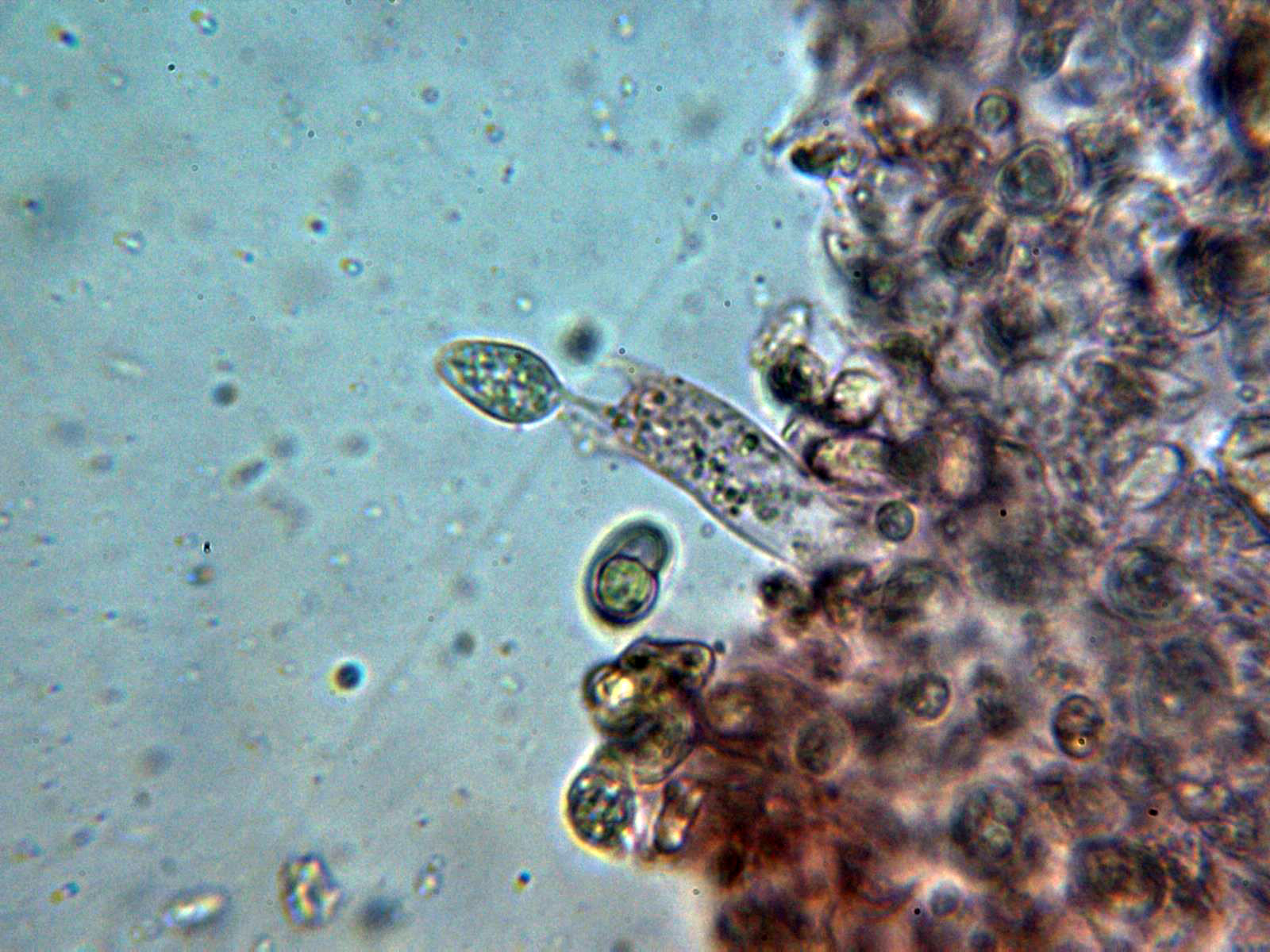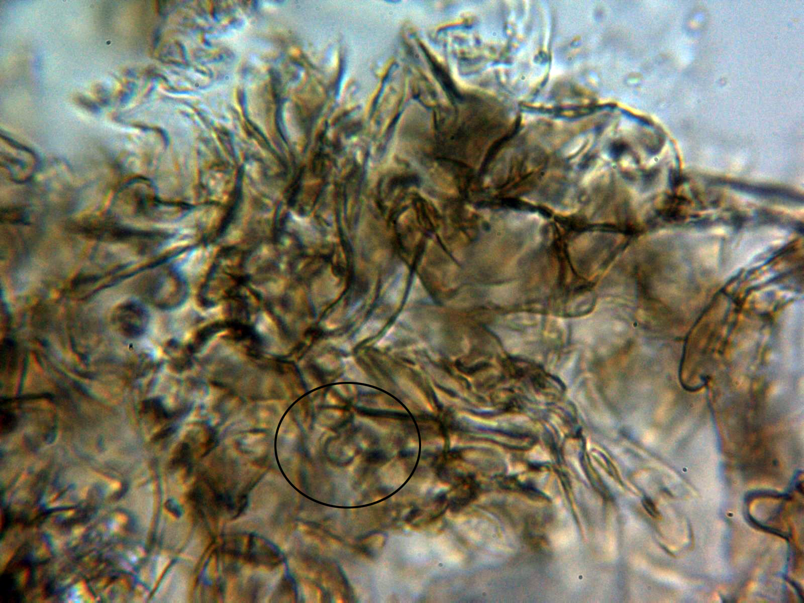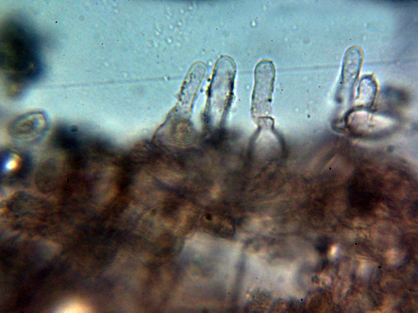 Aunque no se citan cistidios para la especie si pude observar aunque muy pocos, unas hifas terminales a modo de estos en la arista laminar: