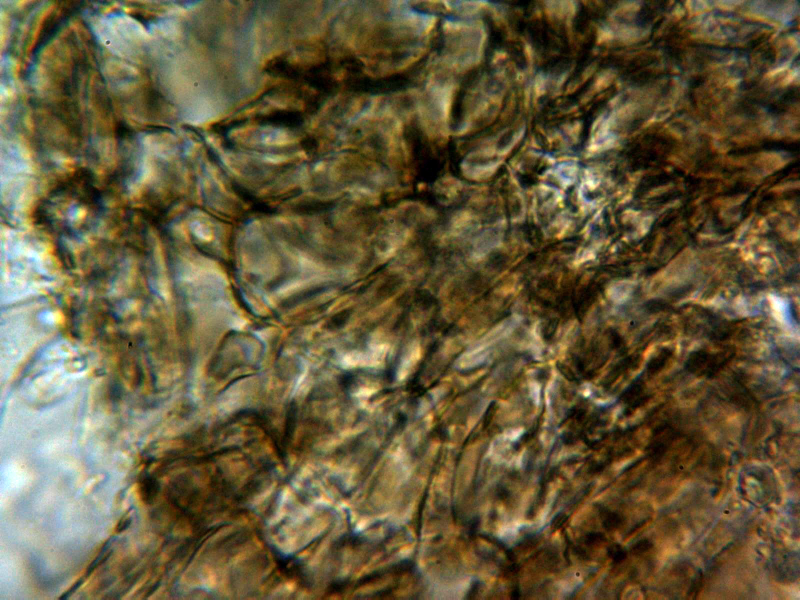 Hifas de la suprapellis en agua fuertemente pigmentadas, anchas y con tabiques cortos: