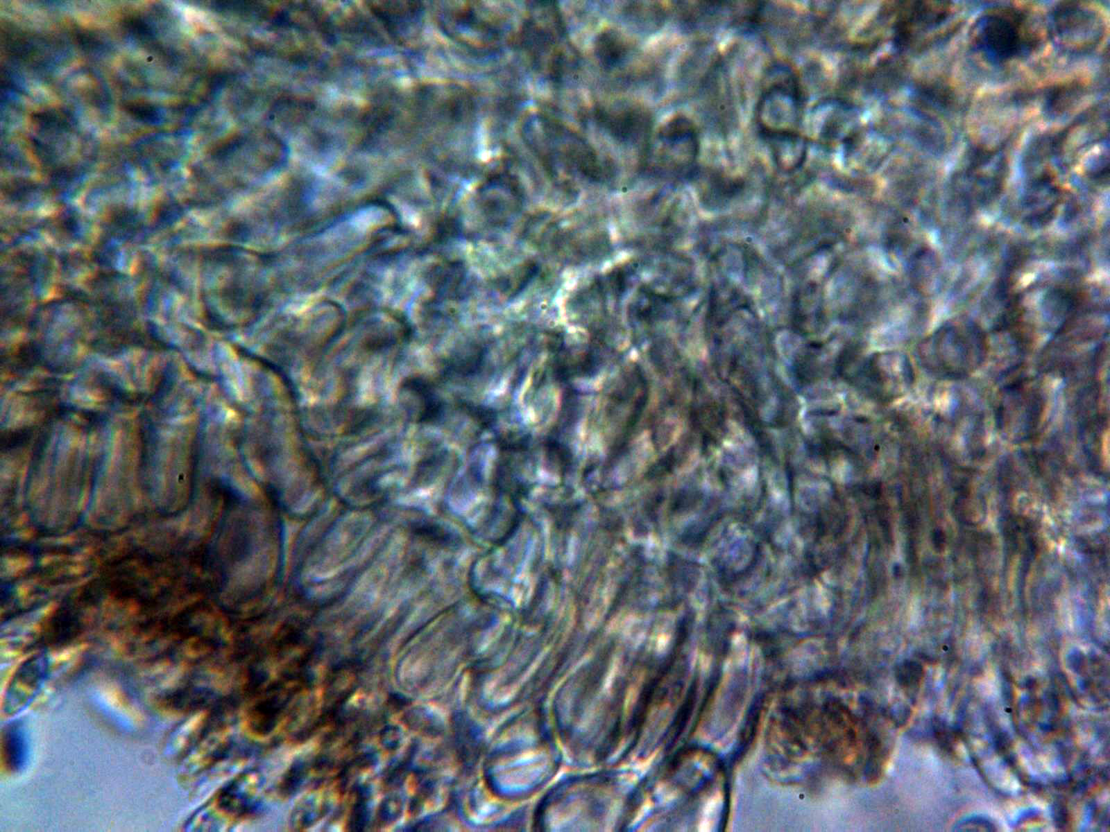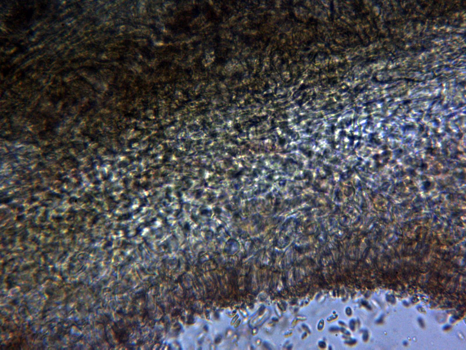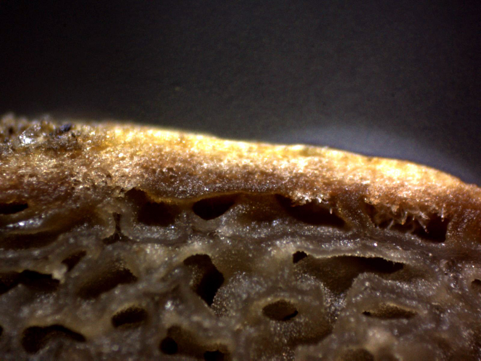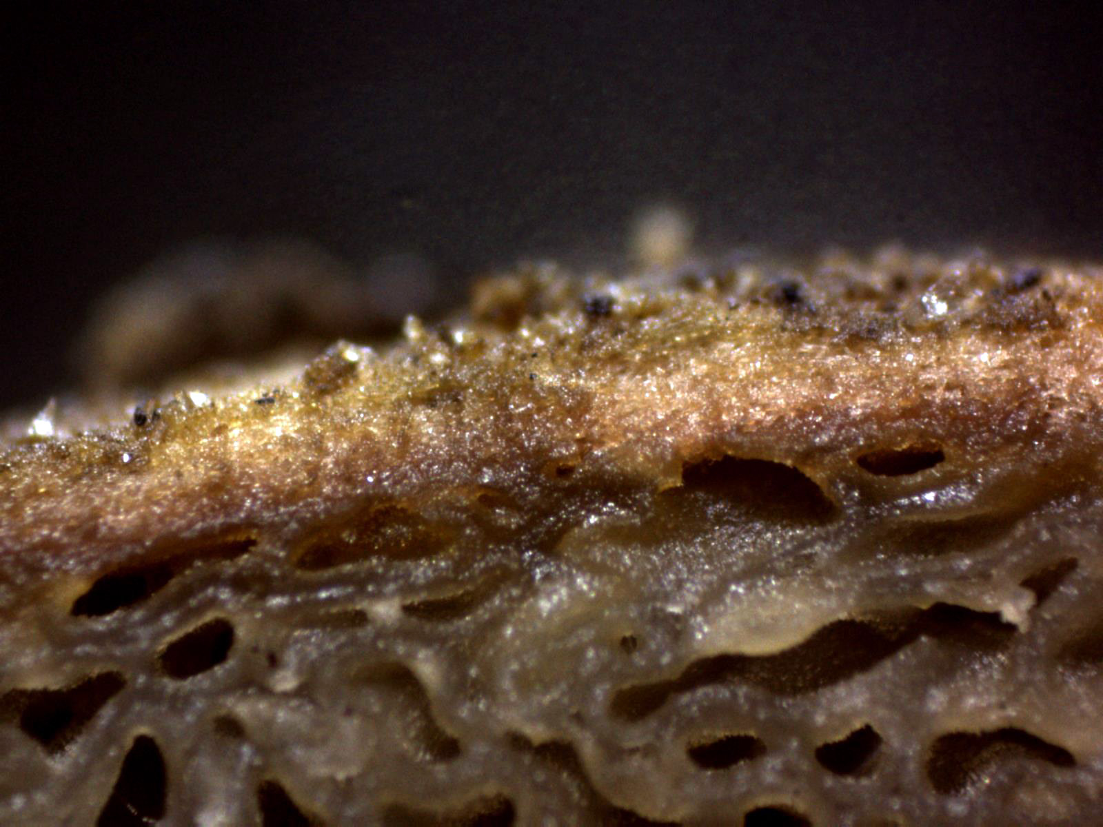 Parte interna del peridio donde en la parte baja ya se pueden observar basidios: