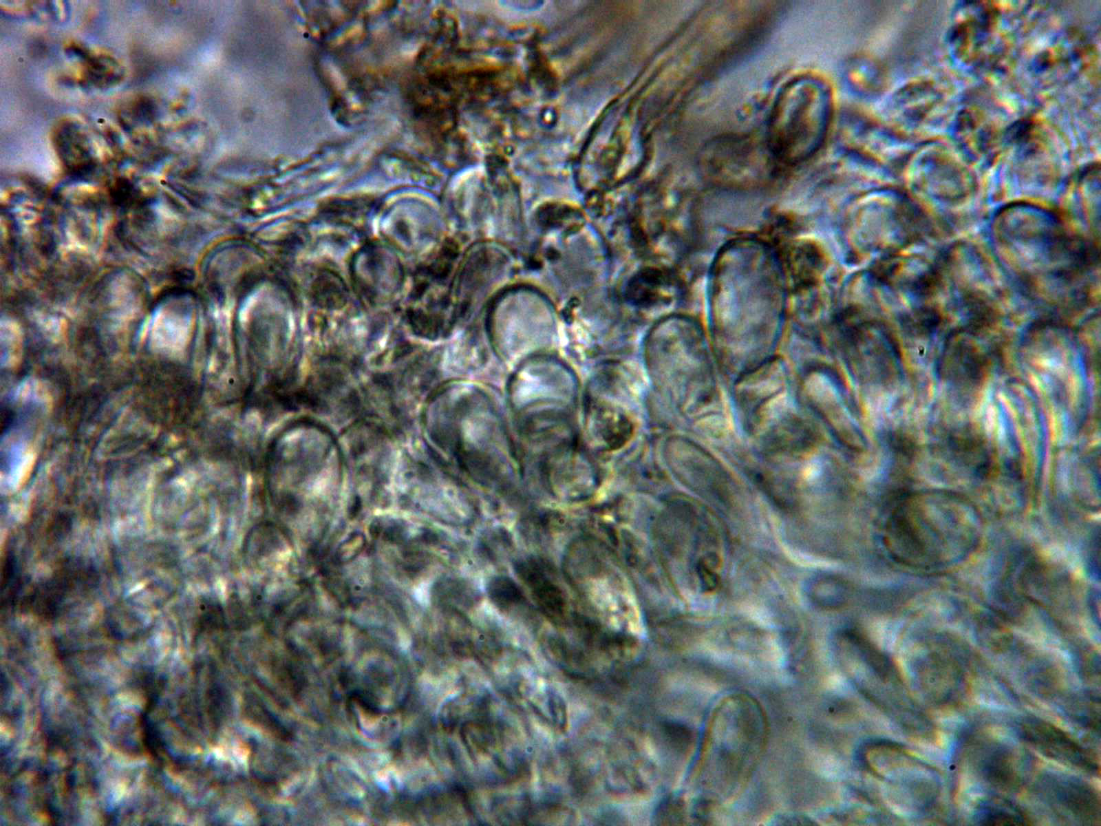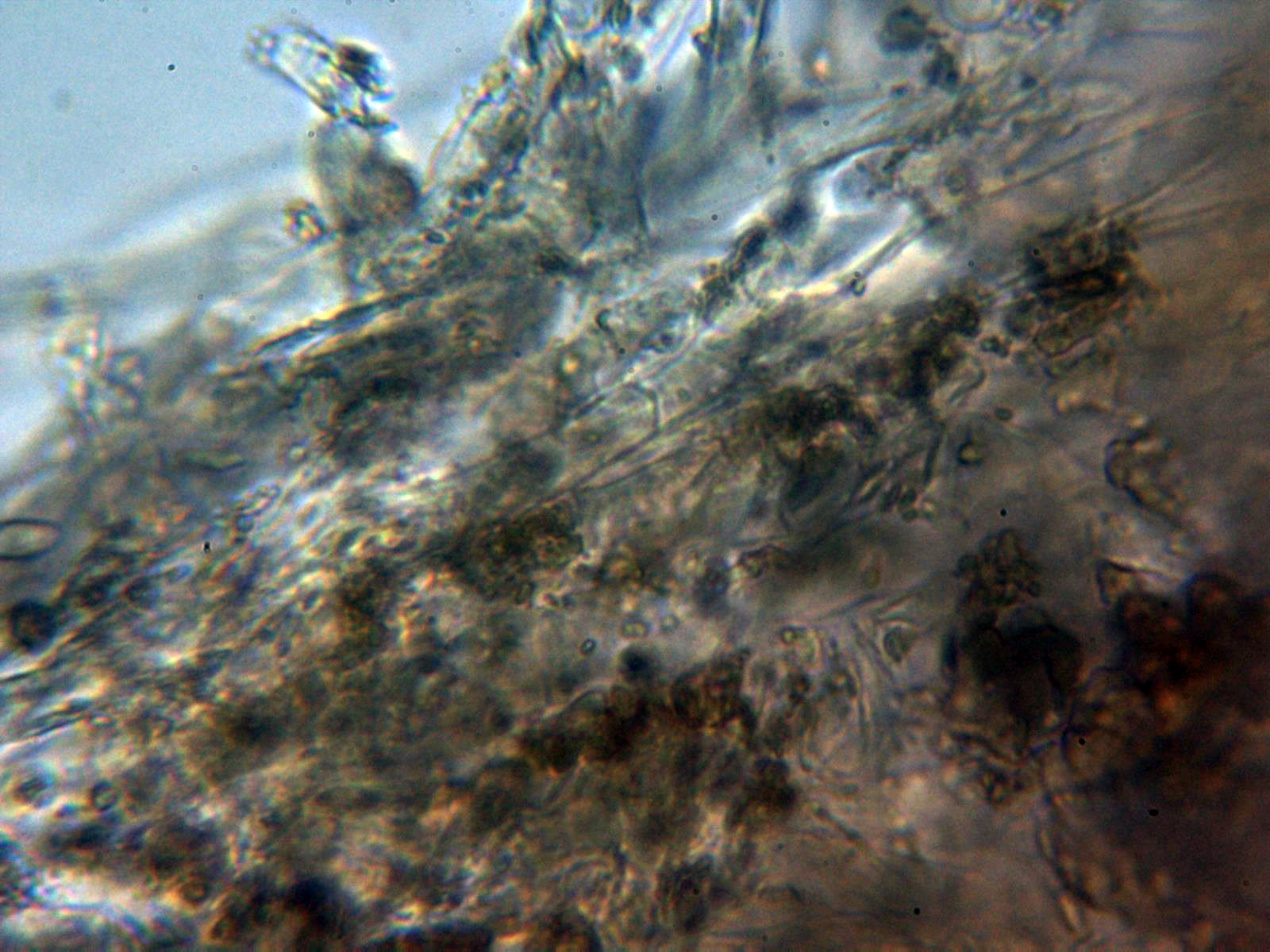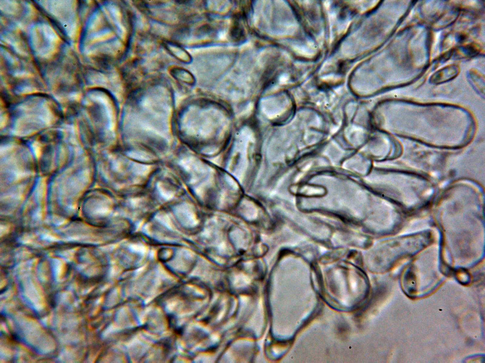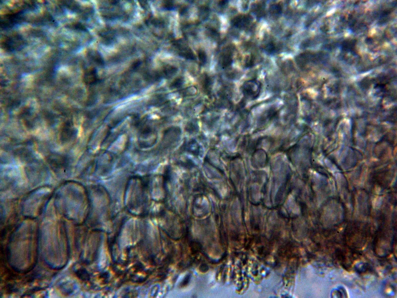 Parte interna del peridio donde en la parte baja ya se pueden observar basidios: