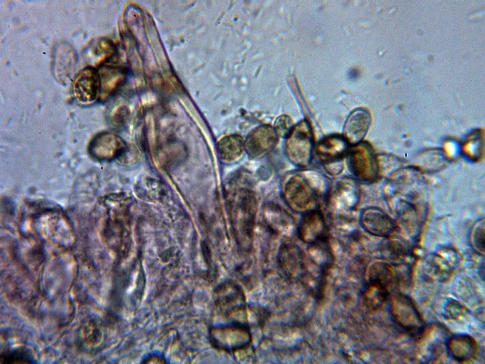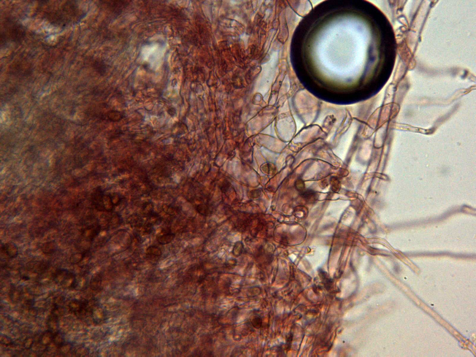 Los queilocistidios fusiformes, ventrudos, con cristalizaciones en el ápice y unas medidas de (31.9) 39.1 - 63.6 (71.9) × (13) 13.8 - 15.6 (19.8) µm. con una pared que en algunos casos supera las 2 µm.
