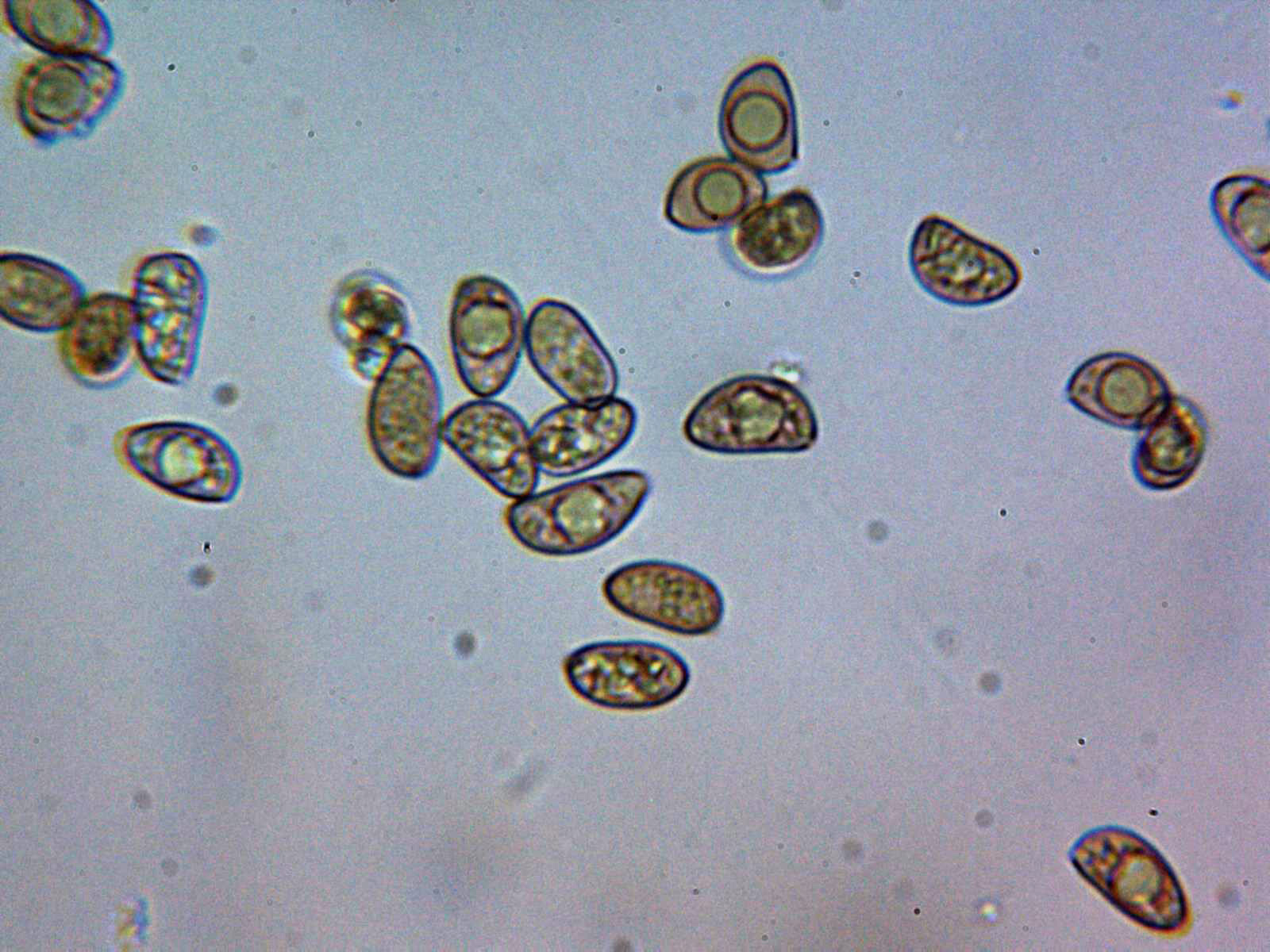 Esporas entre elipsoidales, almendradas a largamente amigdaliformes con unas medidas de: