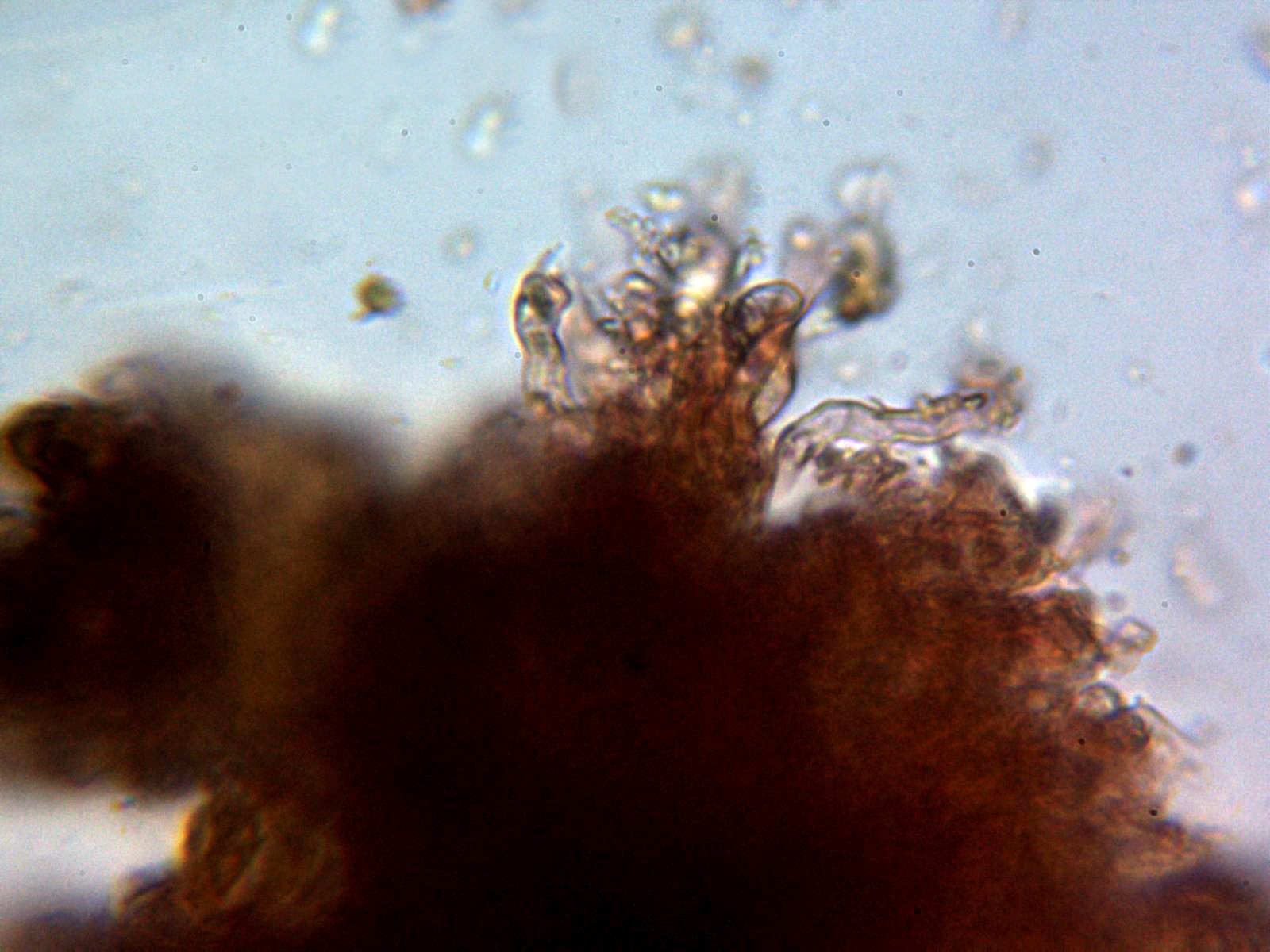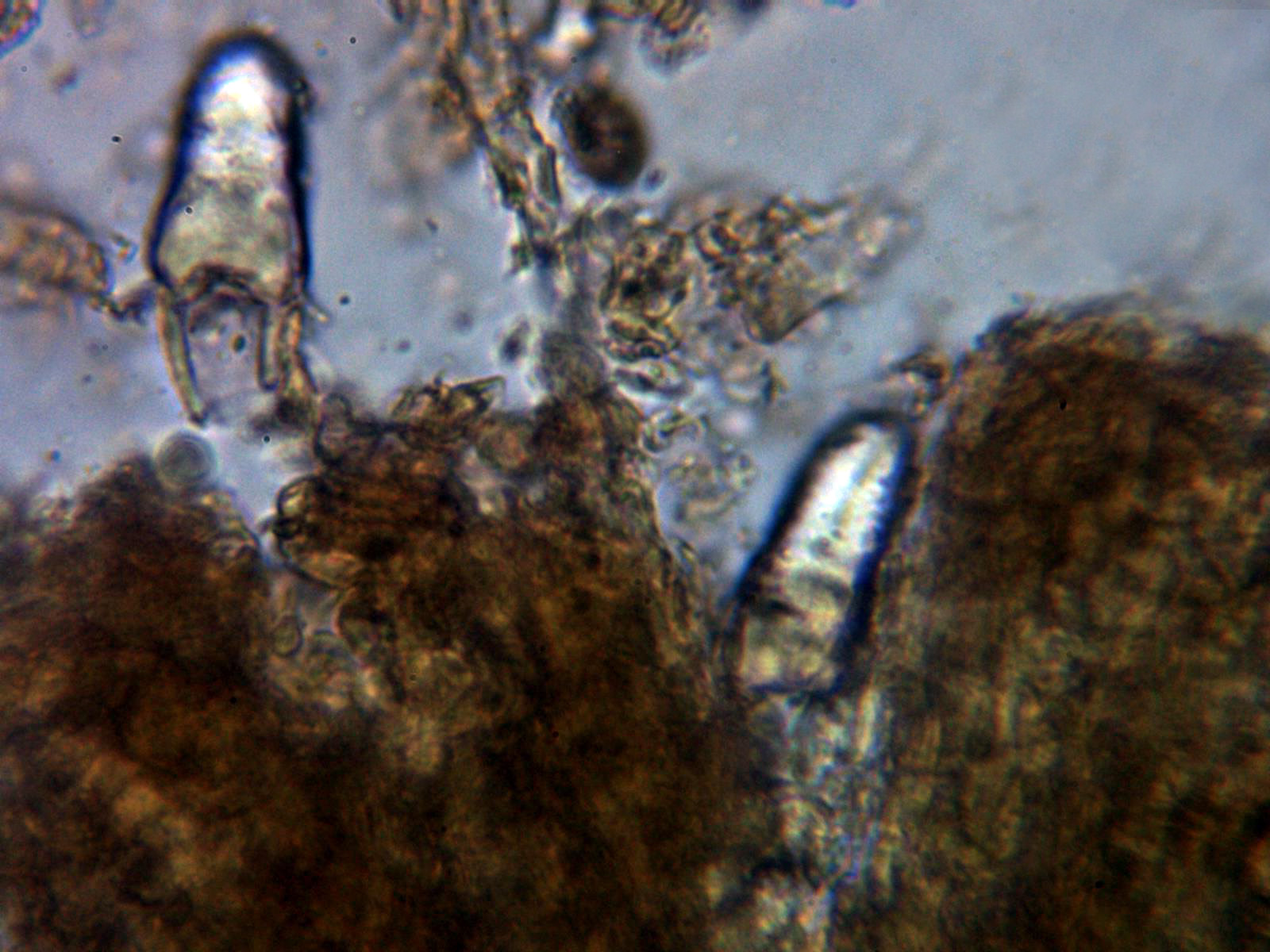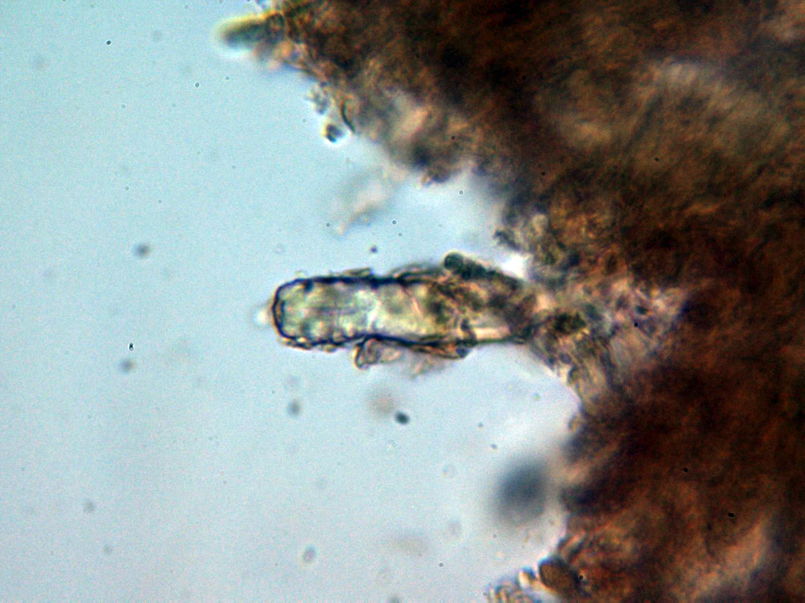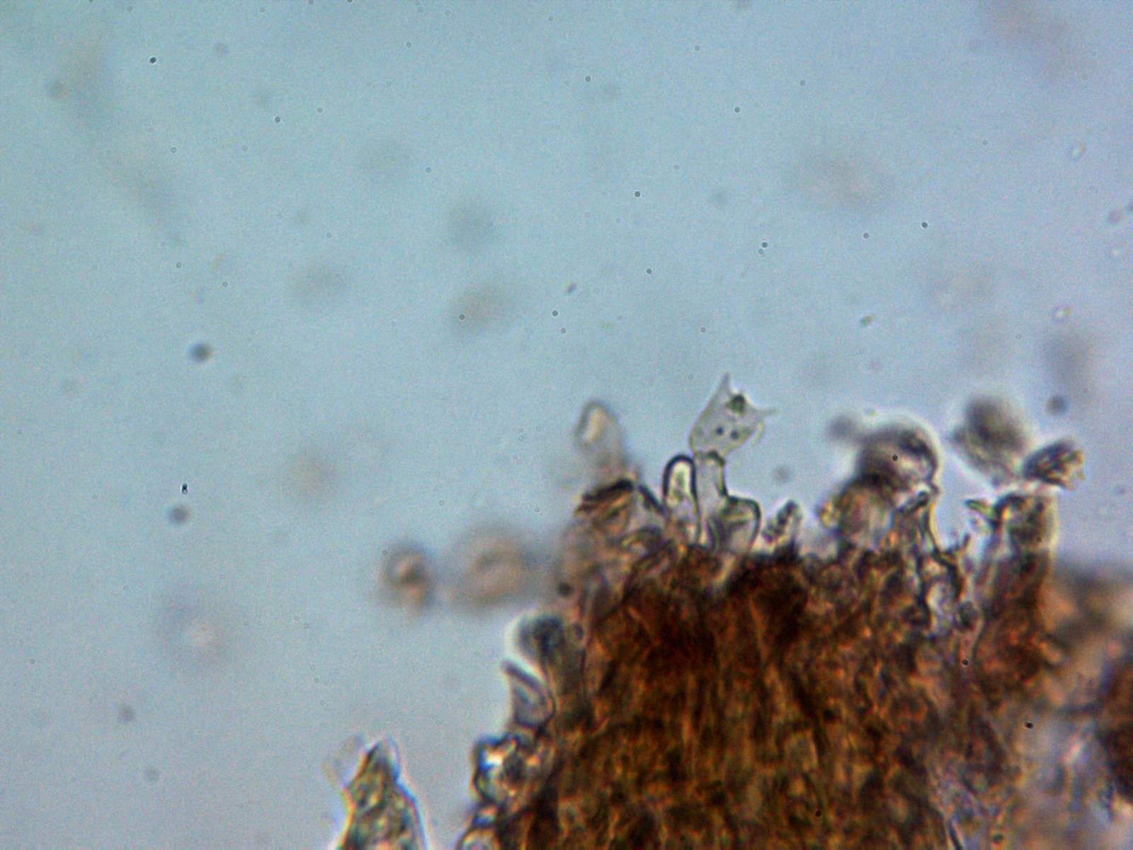 Himenio a 400 aumentos donde ya se aprecian bien los lamprocistidios: