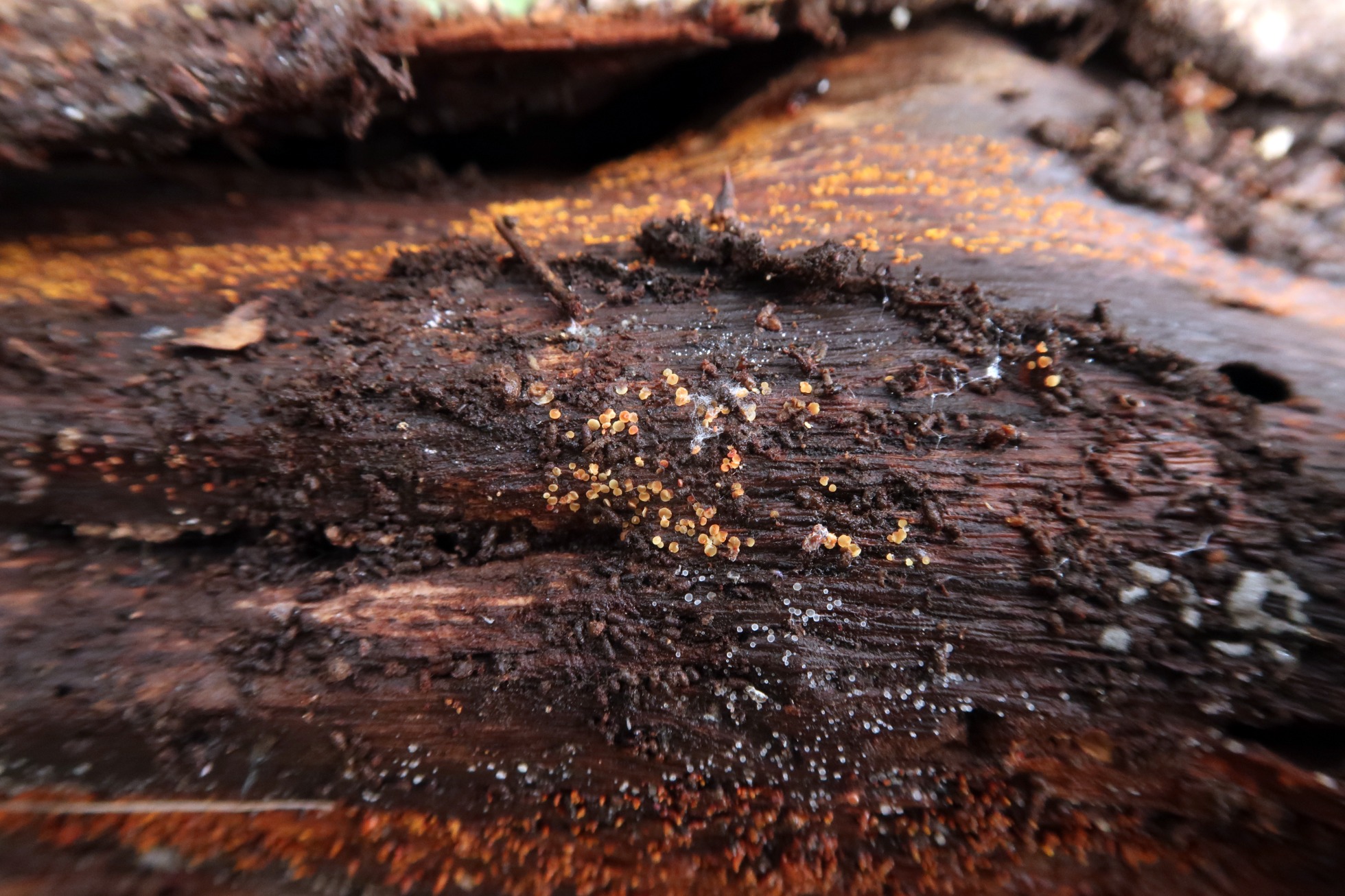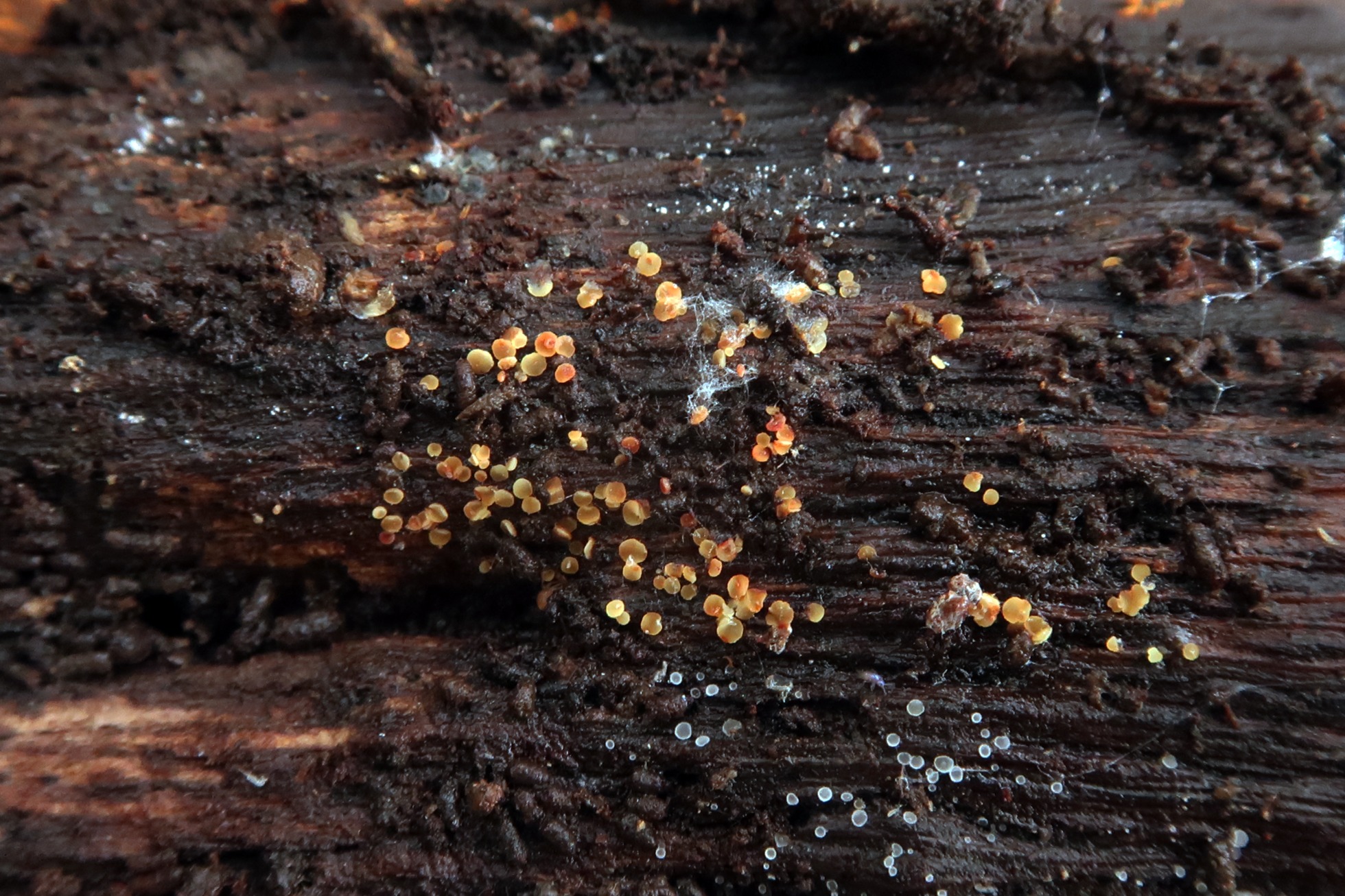Unos diminutos apotecios fotografiados el pasado domingo sobre la superficie de un tronco de planifolio indeterminado cerca de un cauce fluvial.