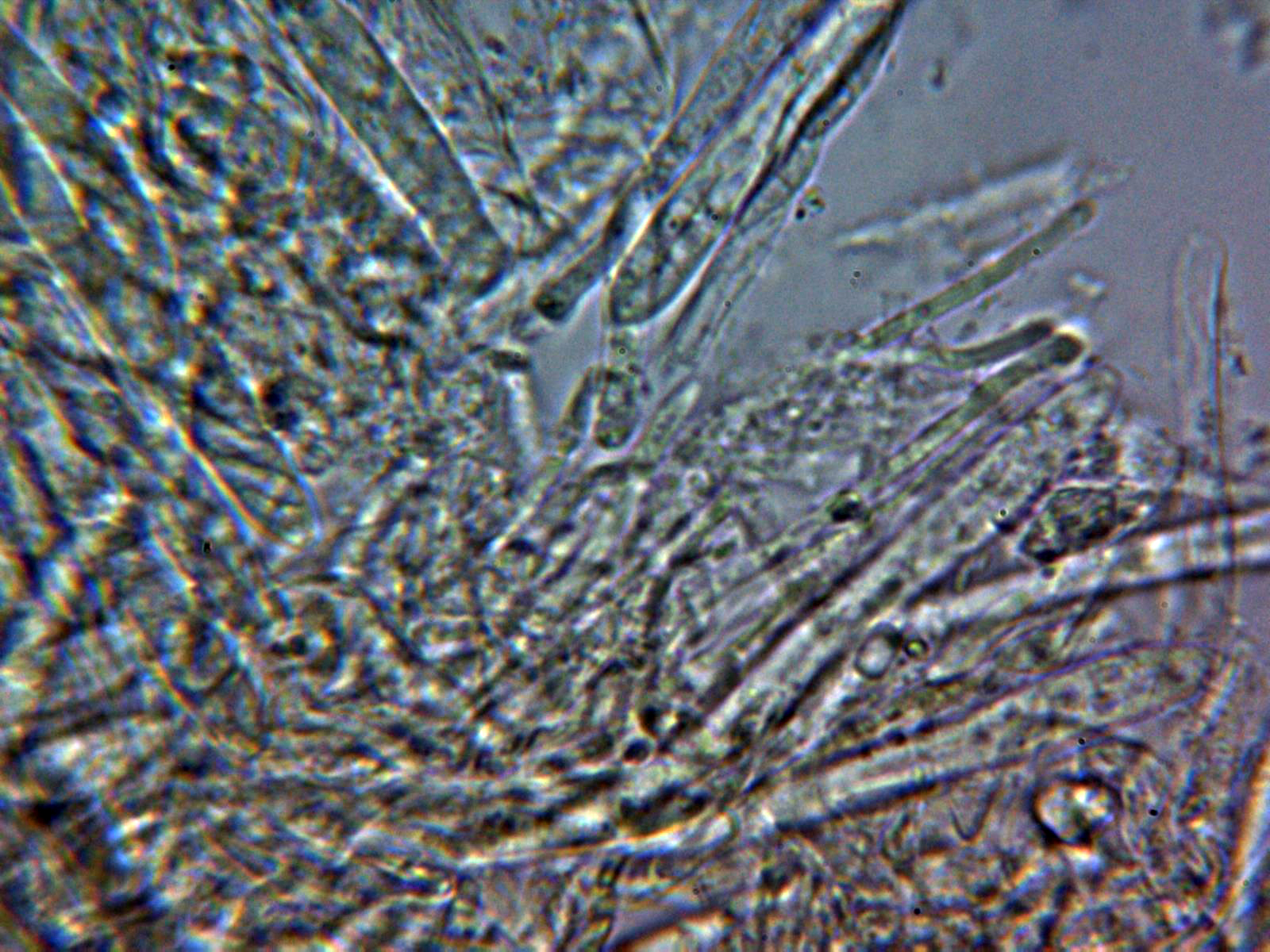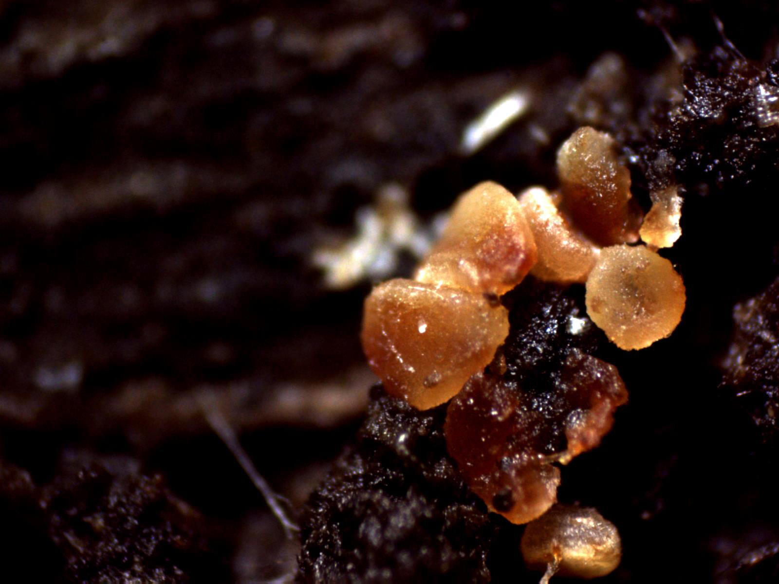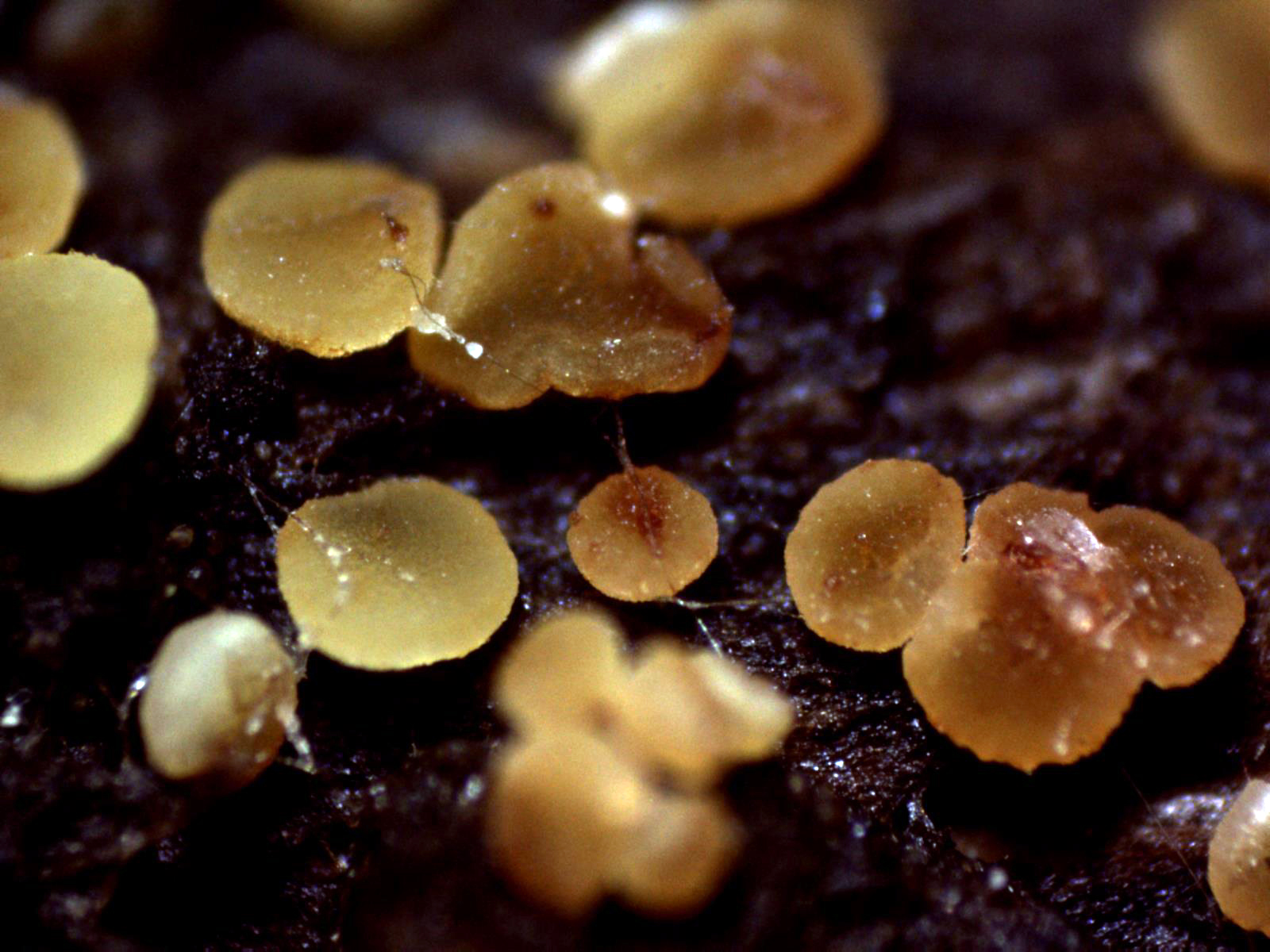 Muy diminutas fructificaciones de entre 0,3 y 0,8 mm., de color crema que va oscureciendo con la deshidratación a un color marrón rojizo muy intenso: