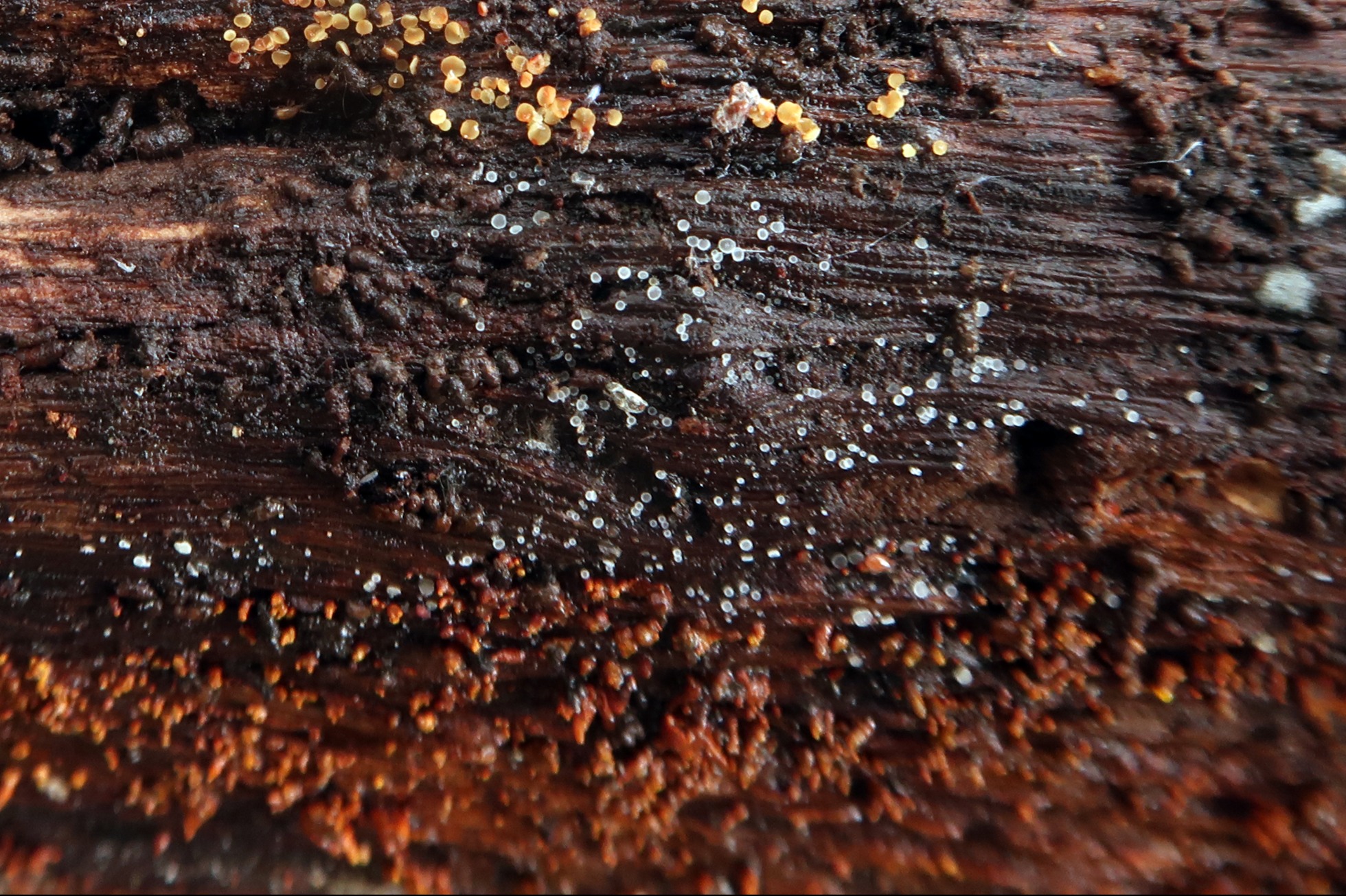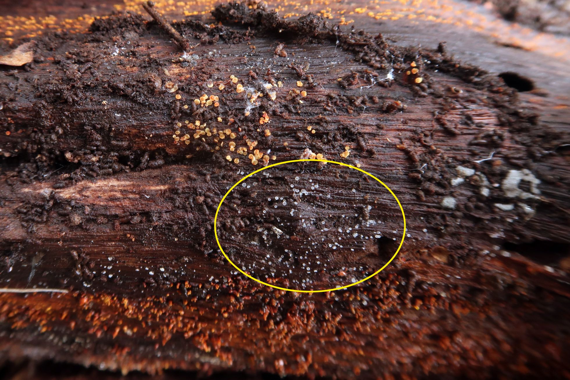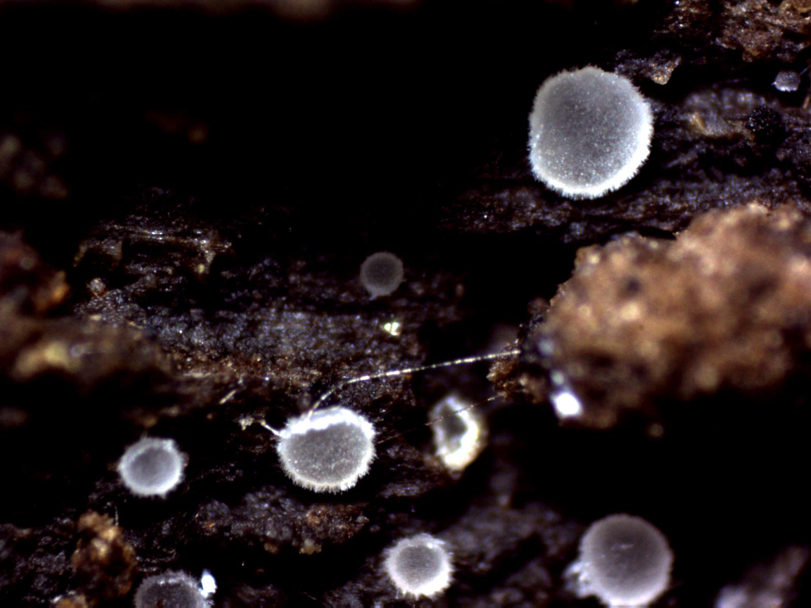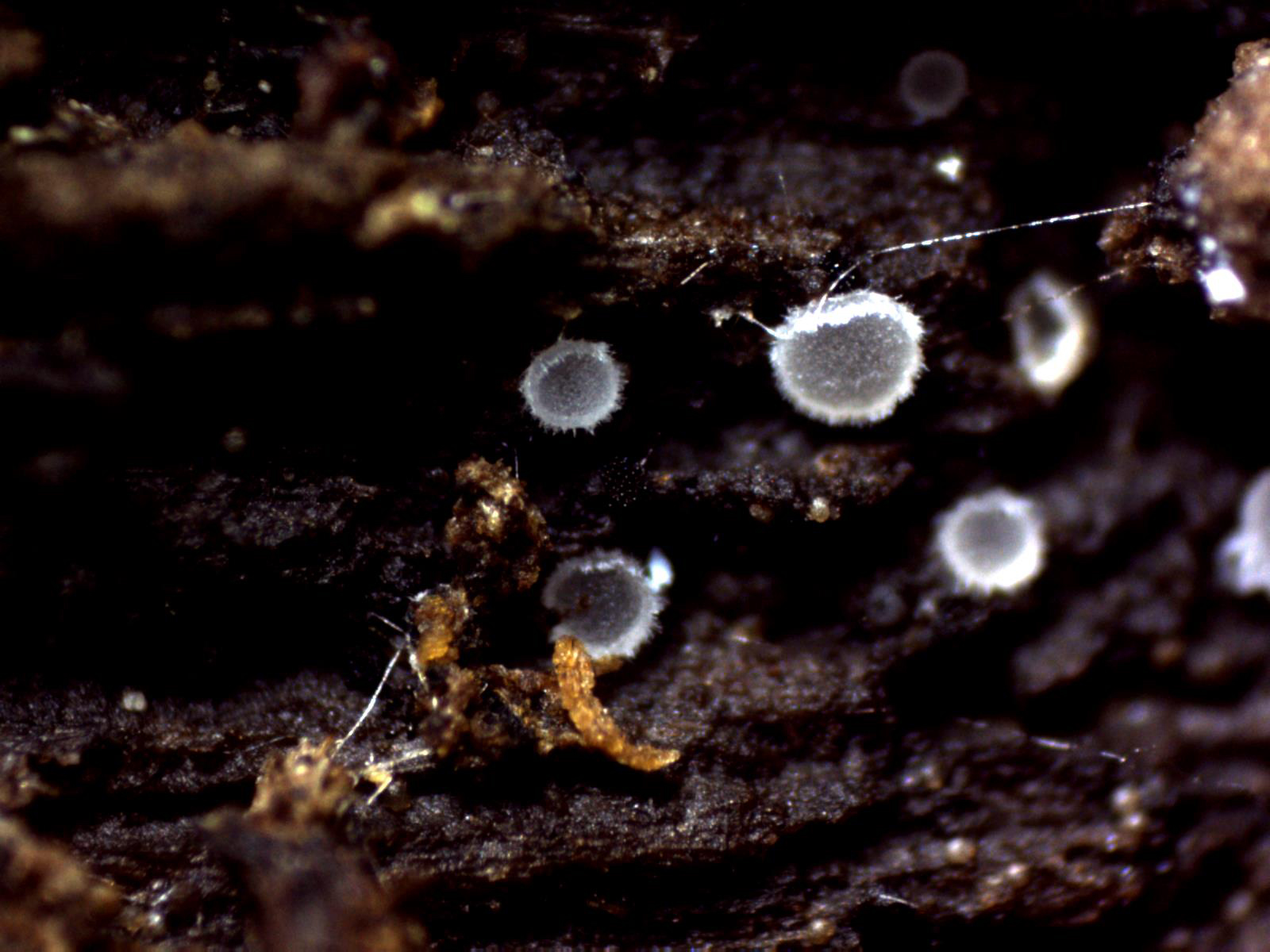 Unos muy diminutos apotecios de color blanco localizados debajo de la Calycina heterospora presentada recientemente:
