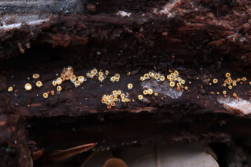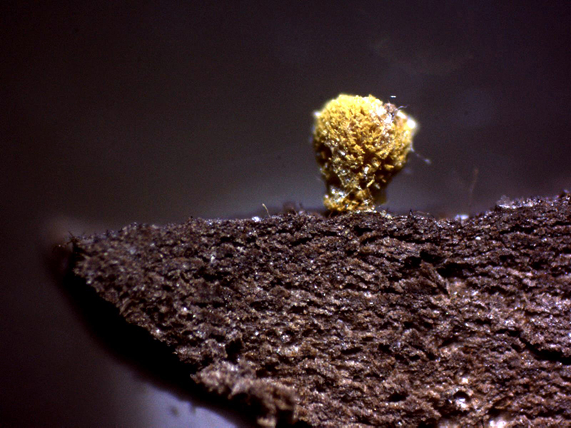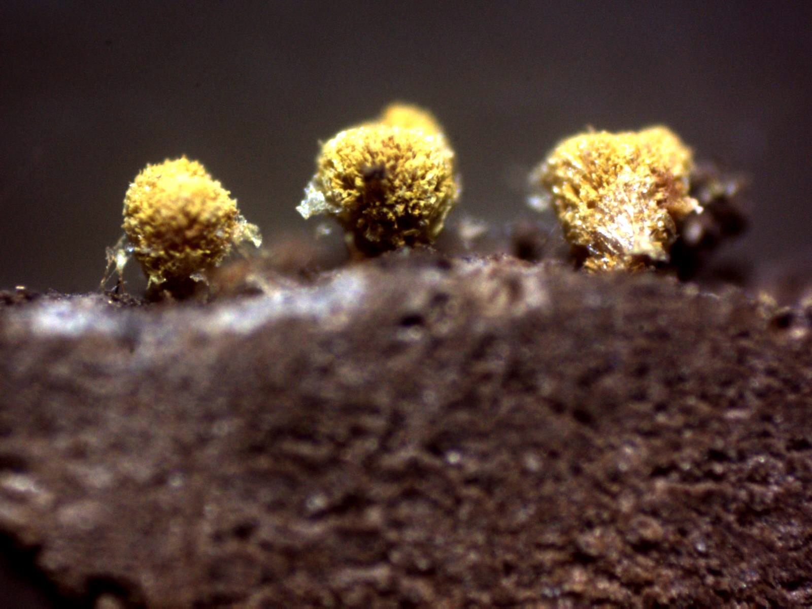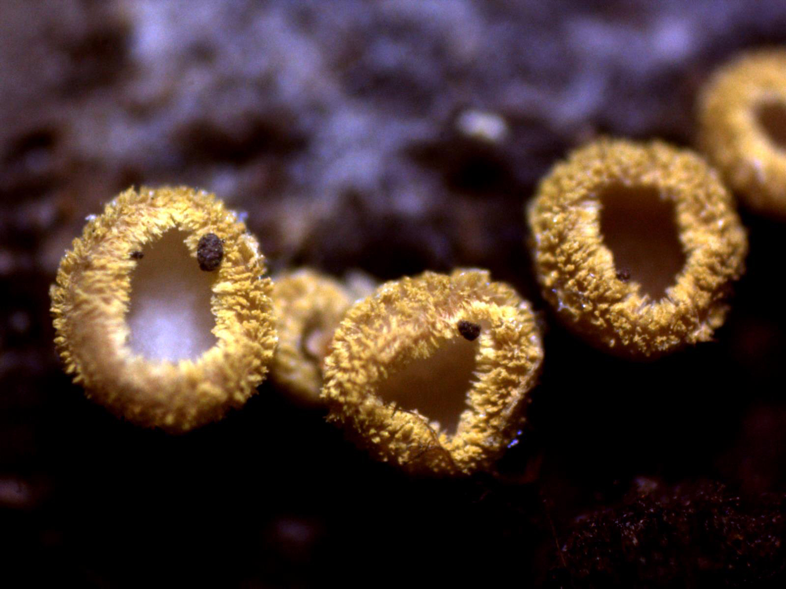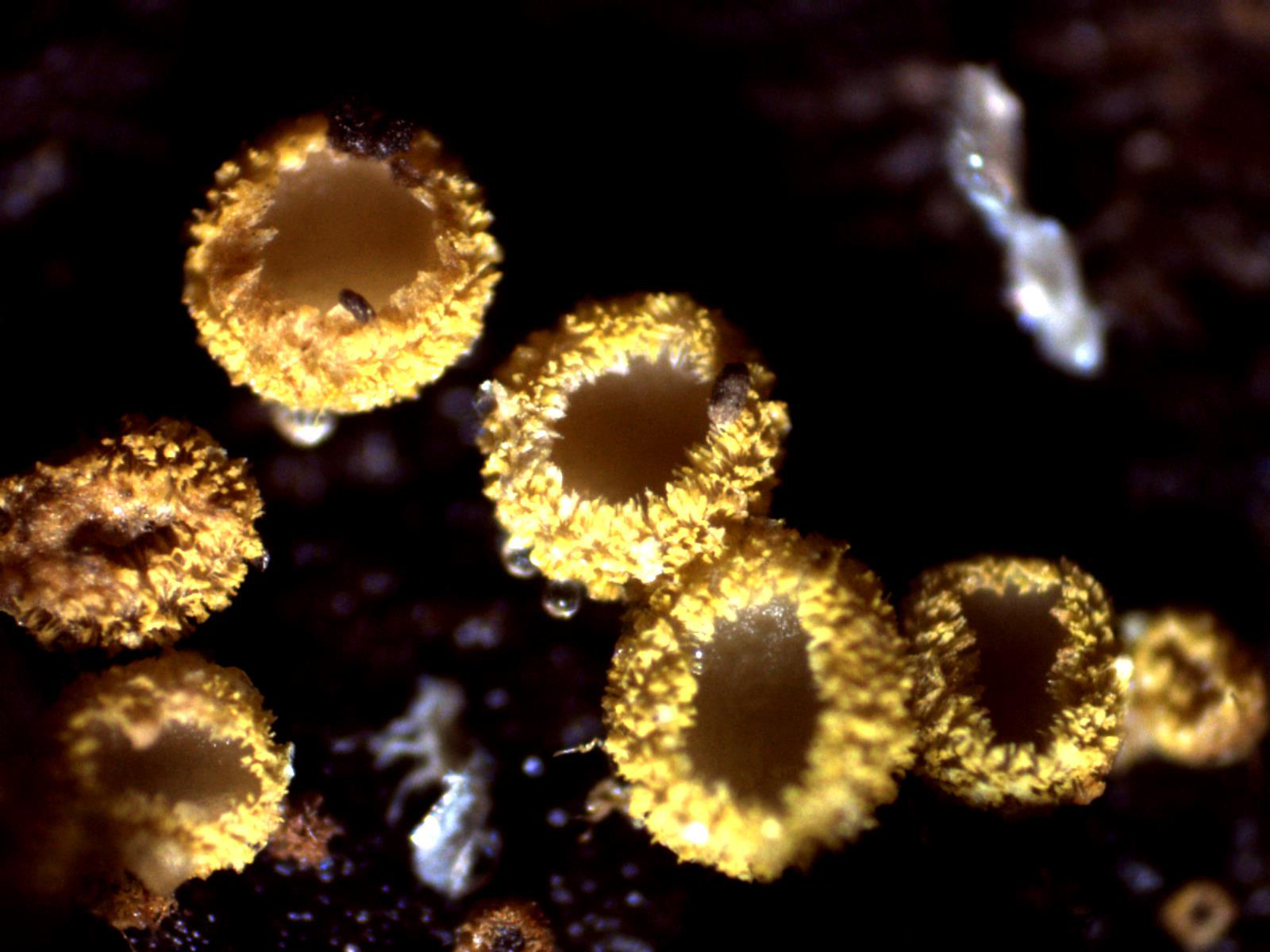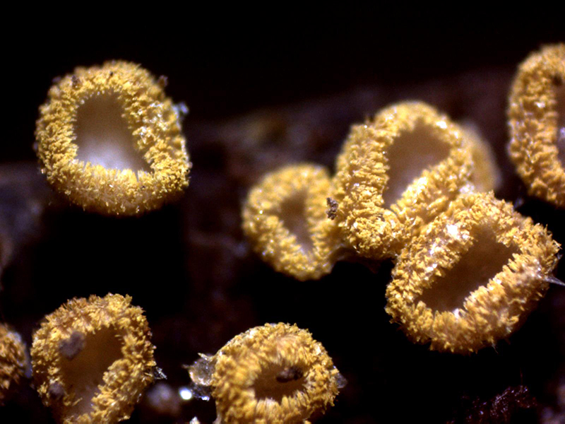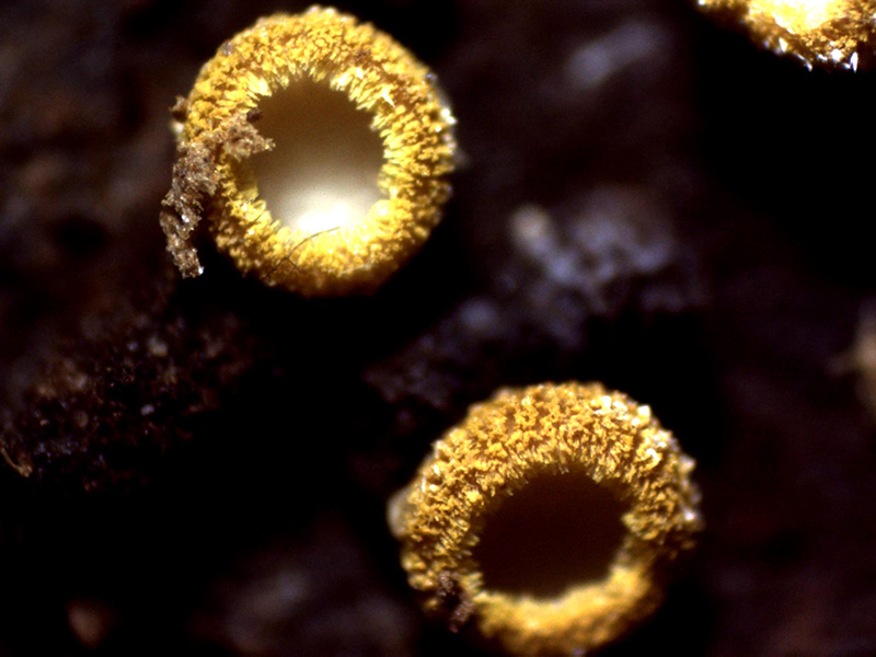 Apotecios pilosos de color amarillo y forma globosa de entre 0,55 a 0,82 mm. de diámetro y una altura de entre 0,49 a 0,54 mm., que se abren dejando entrever su himenio de color blanco.