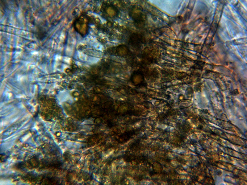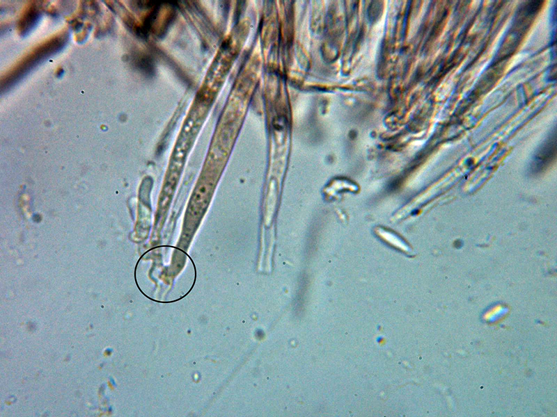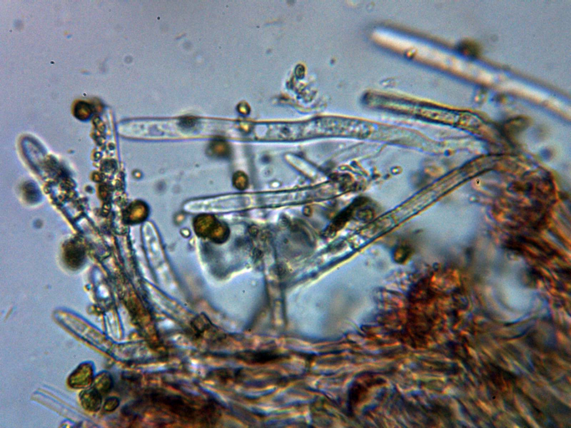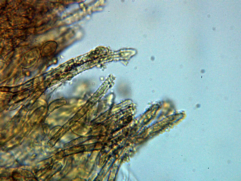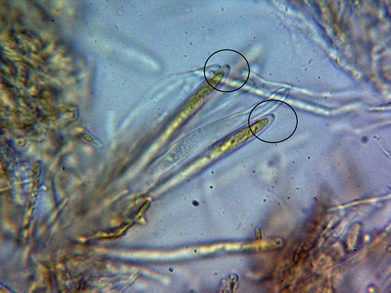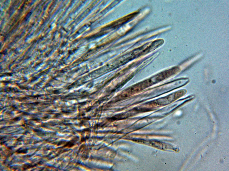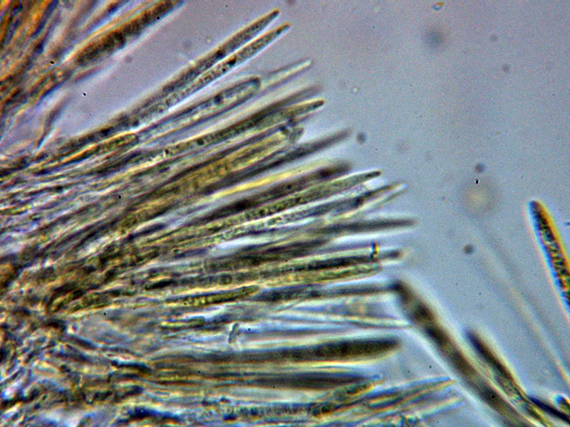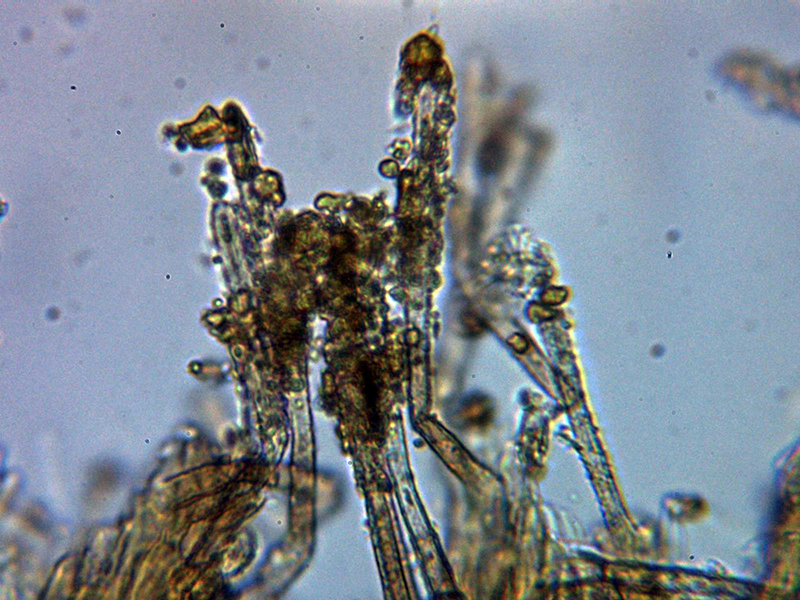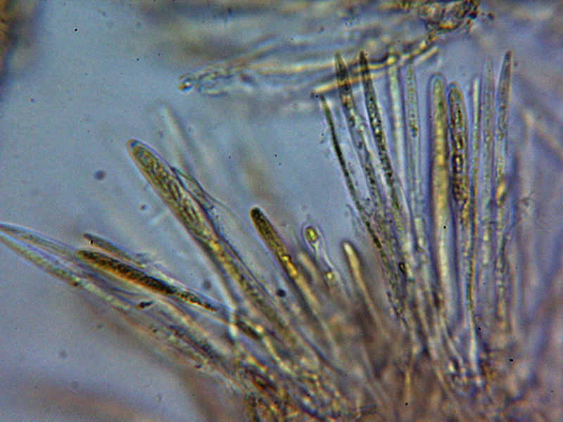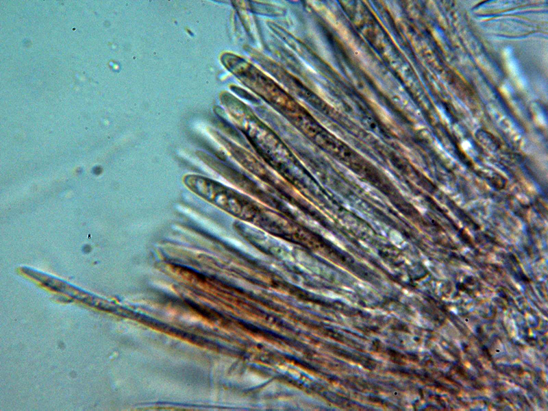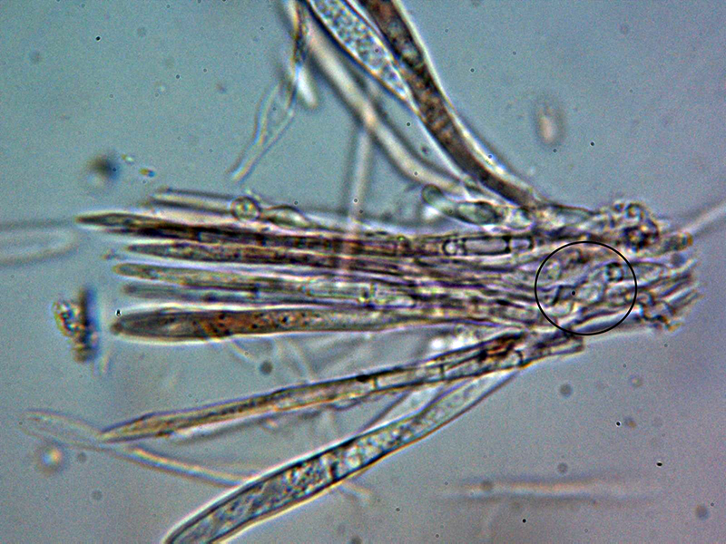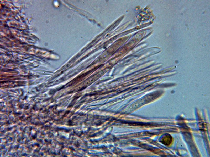 Paráfisis muy abundantes, lanceoladas estrechas, terminando en forma apuntada, algunas septadas, con contenido que se colorea ligeramente en Reactivo de Melzer y que sobresalen ligeramente por encima del nivel de los ascos.