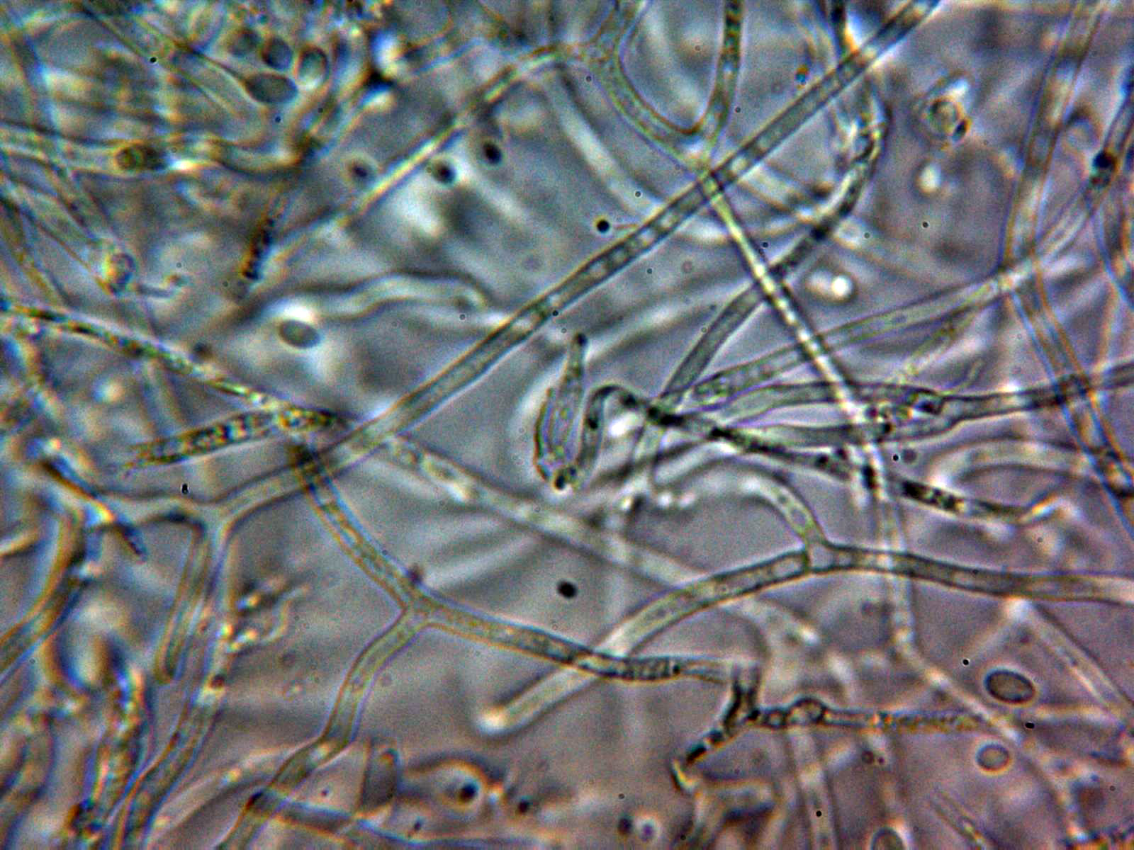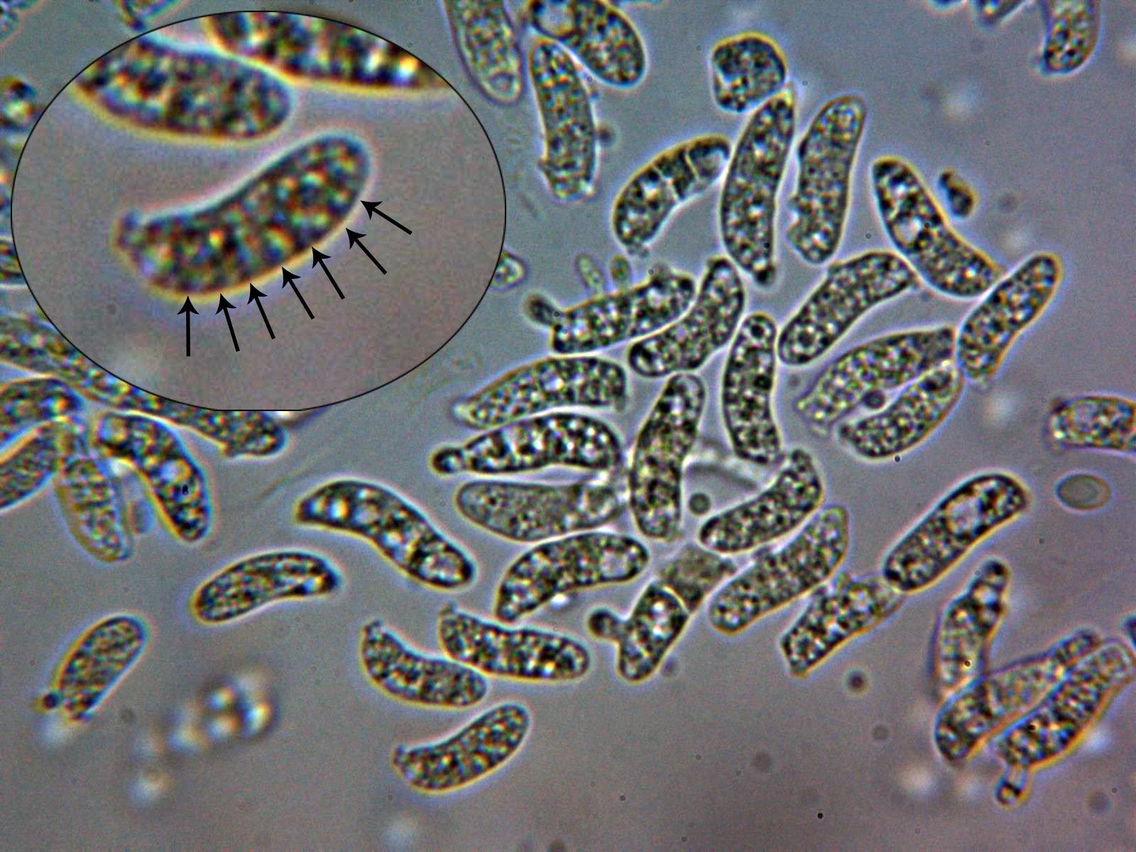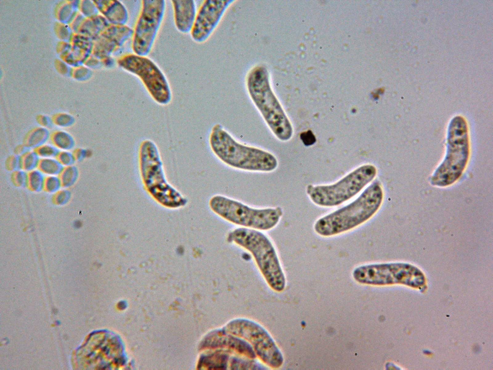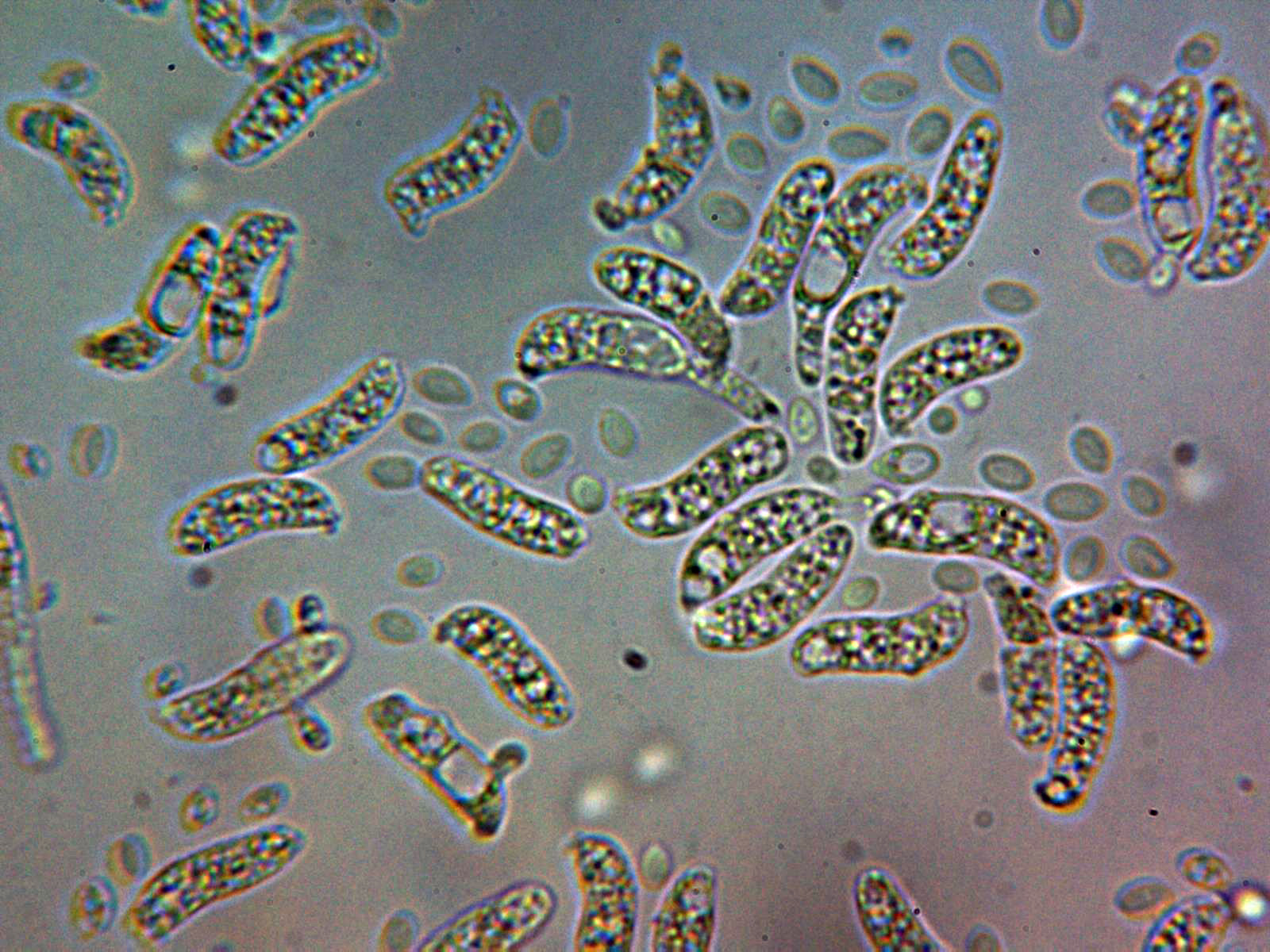 Un par de imágenes de las esporas en agua, en ellas se intuyen una buena cantidad de septos mayoritariamente con 7: