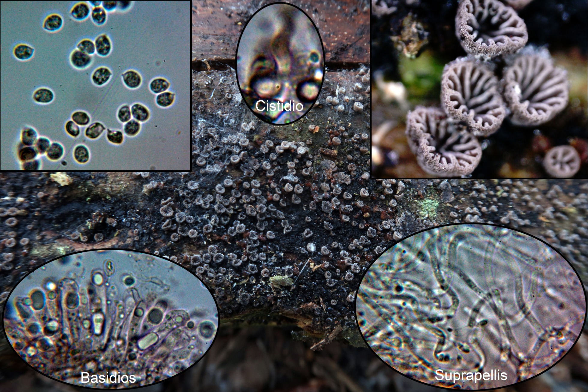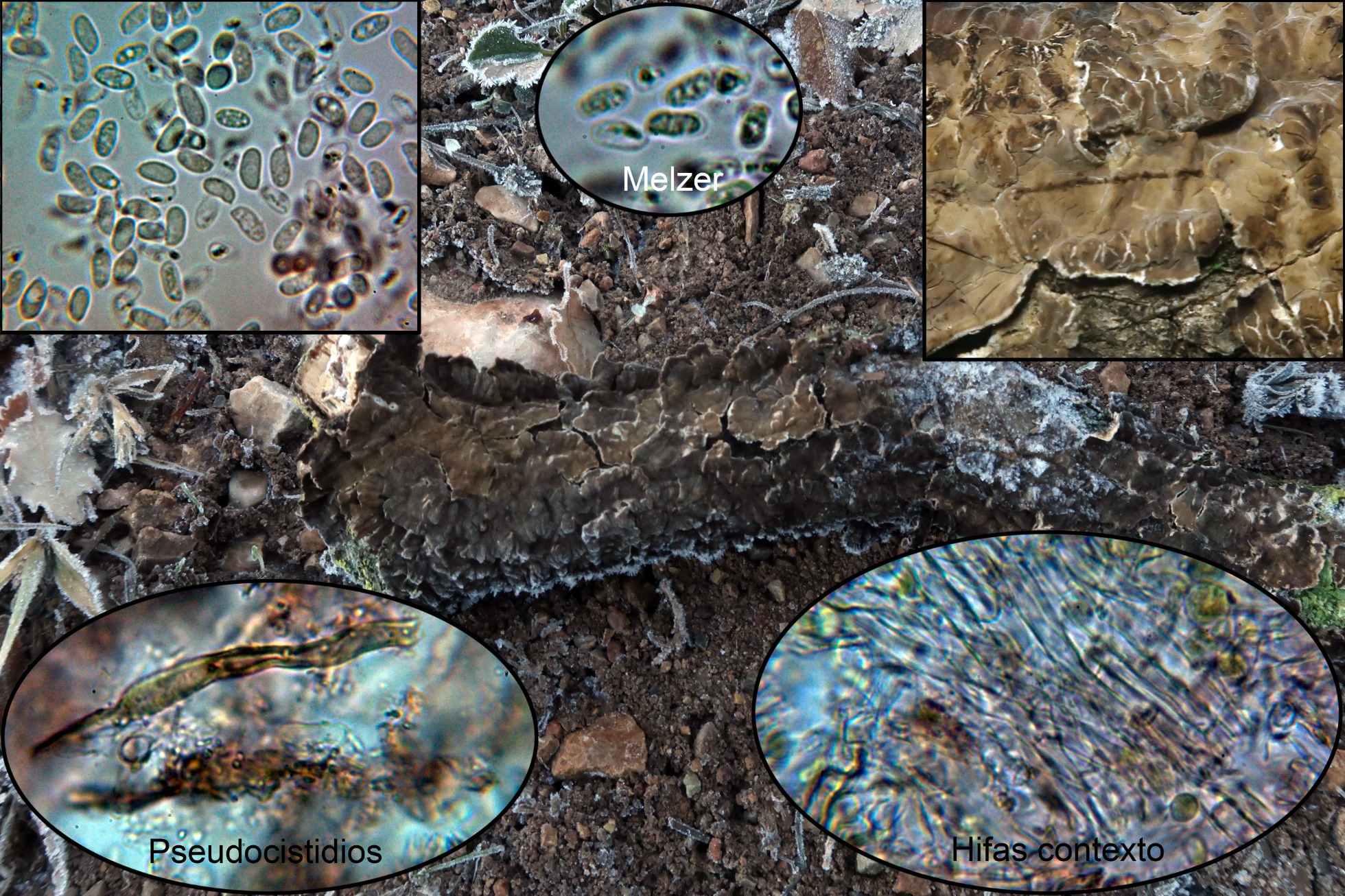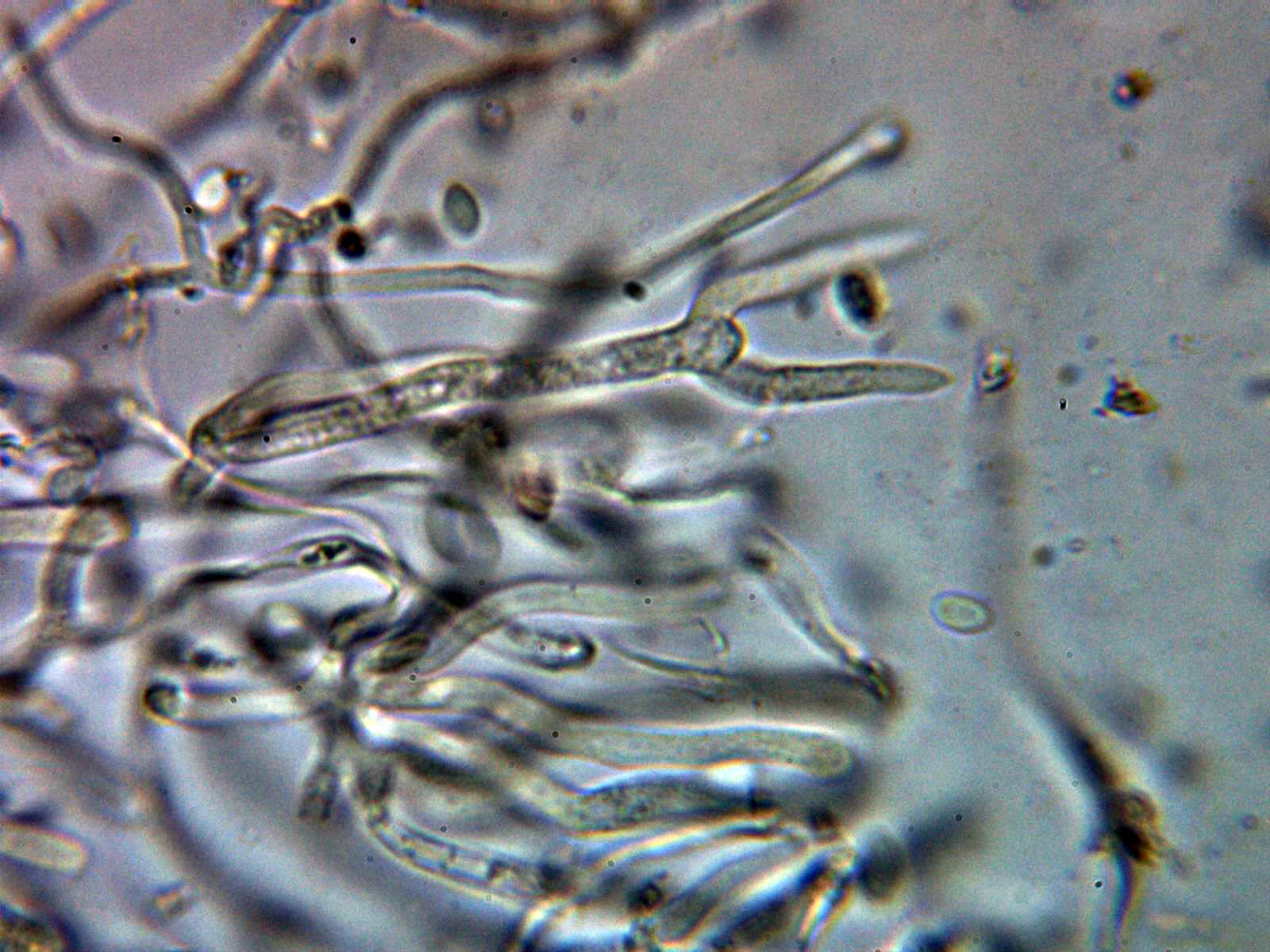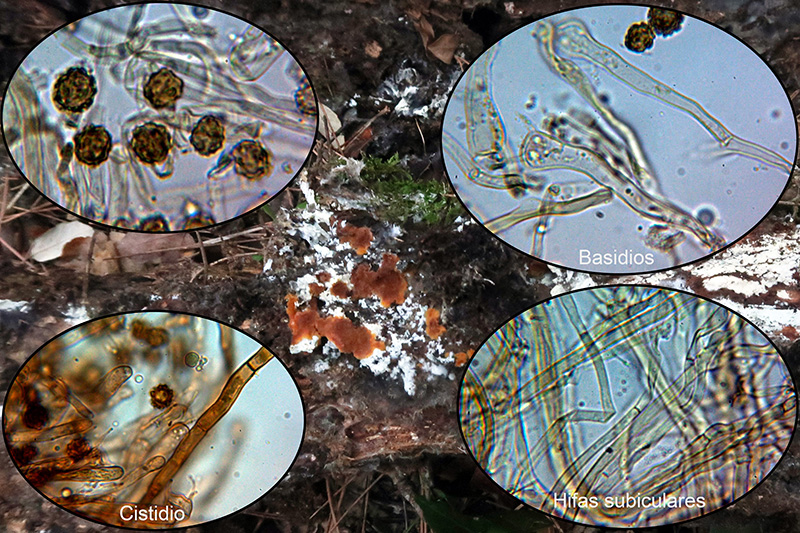Y ya para terminar una Tomentella, con largos cistidios o paracistidios septados que sobresalen por encima del himenio, la Tomentella fibrosa, actualmente Odontia fibrosa