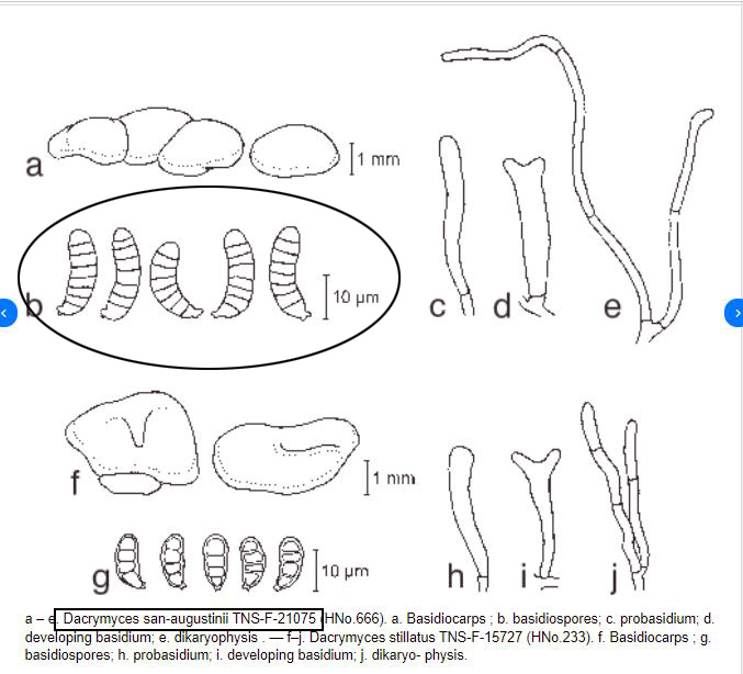 Aunque hay muy poca información al respecto me he encontrado con un trabajo de ResearchGate, de un supuesto Dacrymyces san-augustinii, que parece encajar a la perfección con el del presente estudio, dejo un pantallazo con una comparativa del Dacrymyces san-augustinii y el Dacrymyces stillatus: