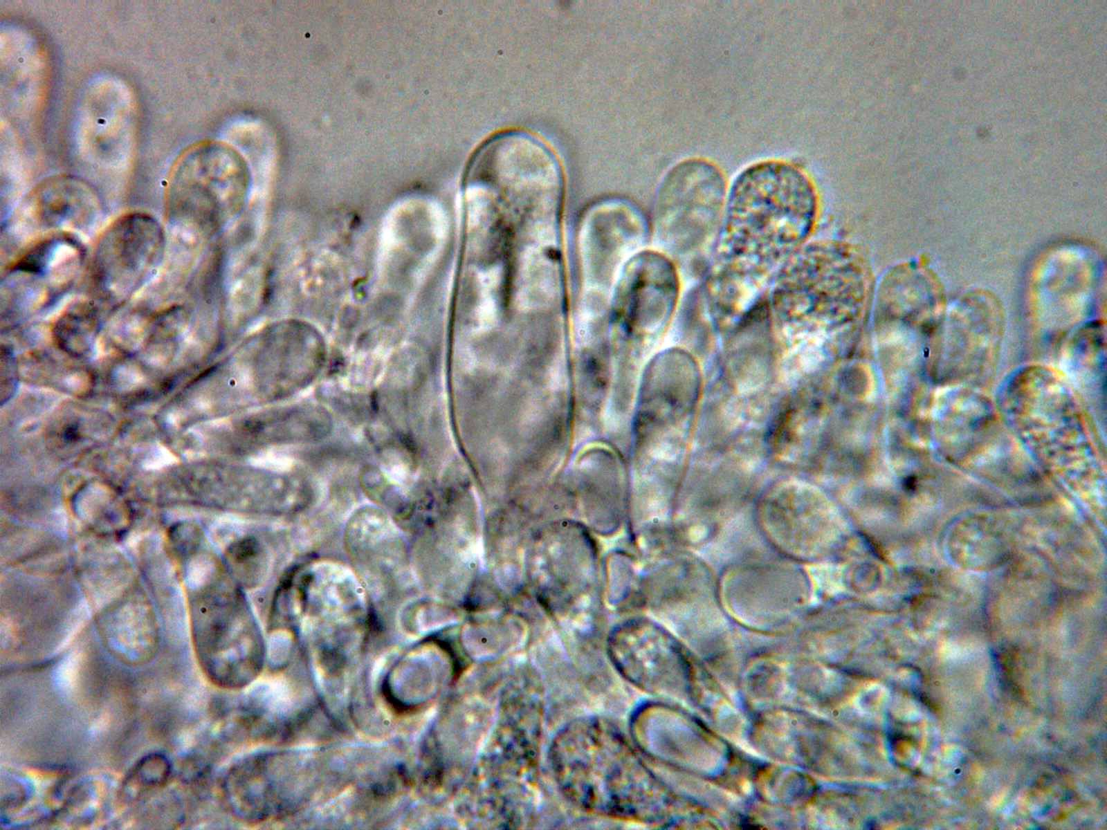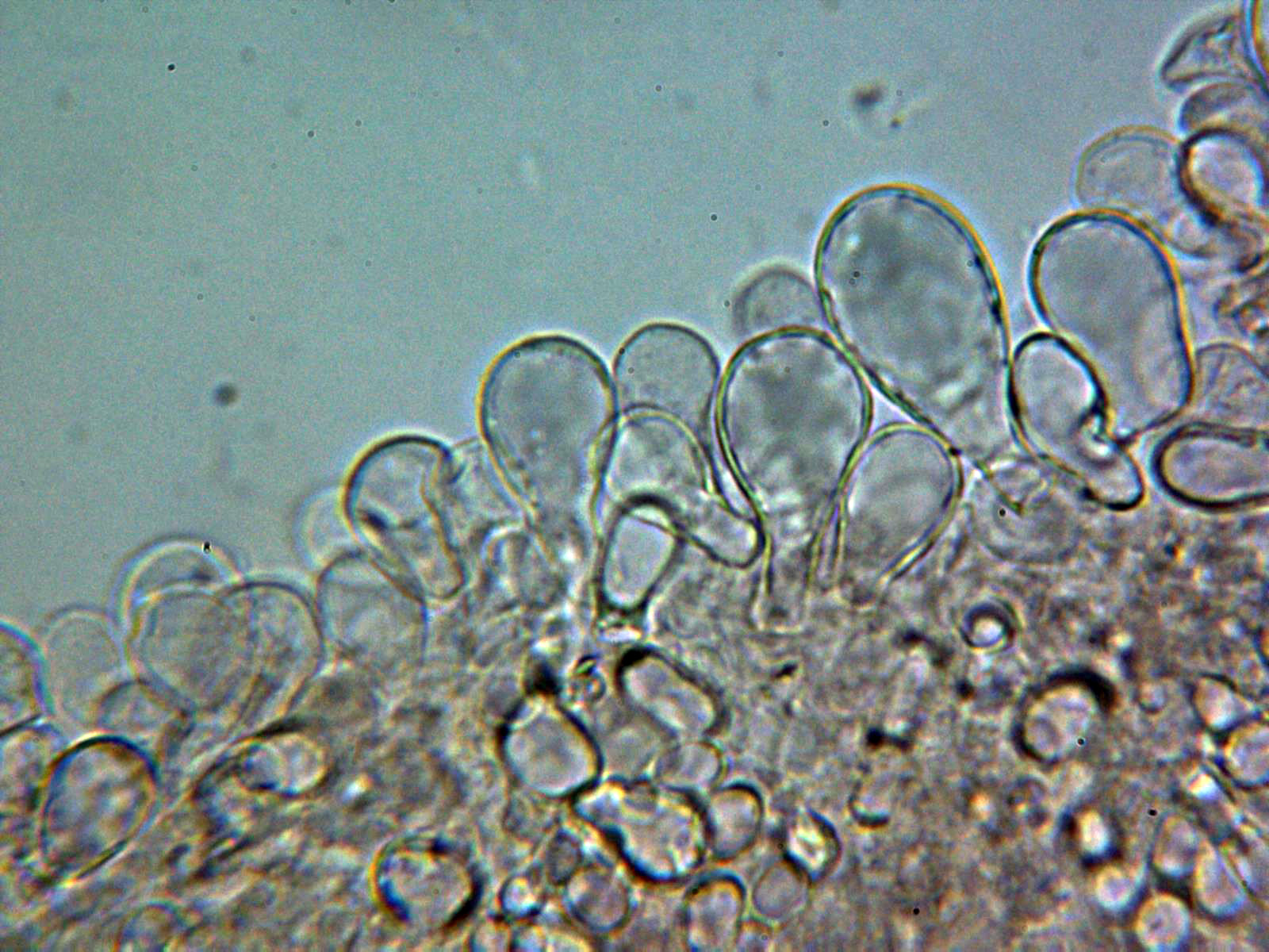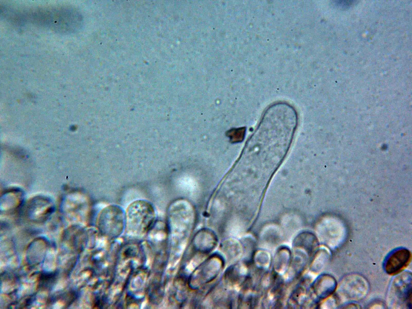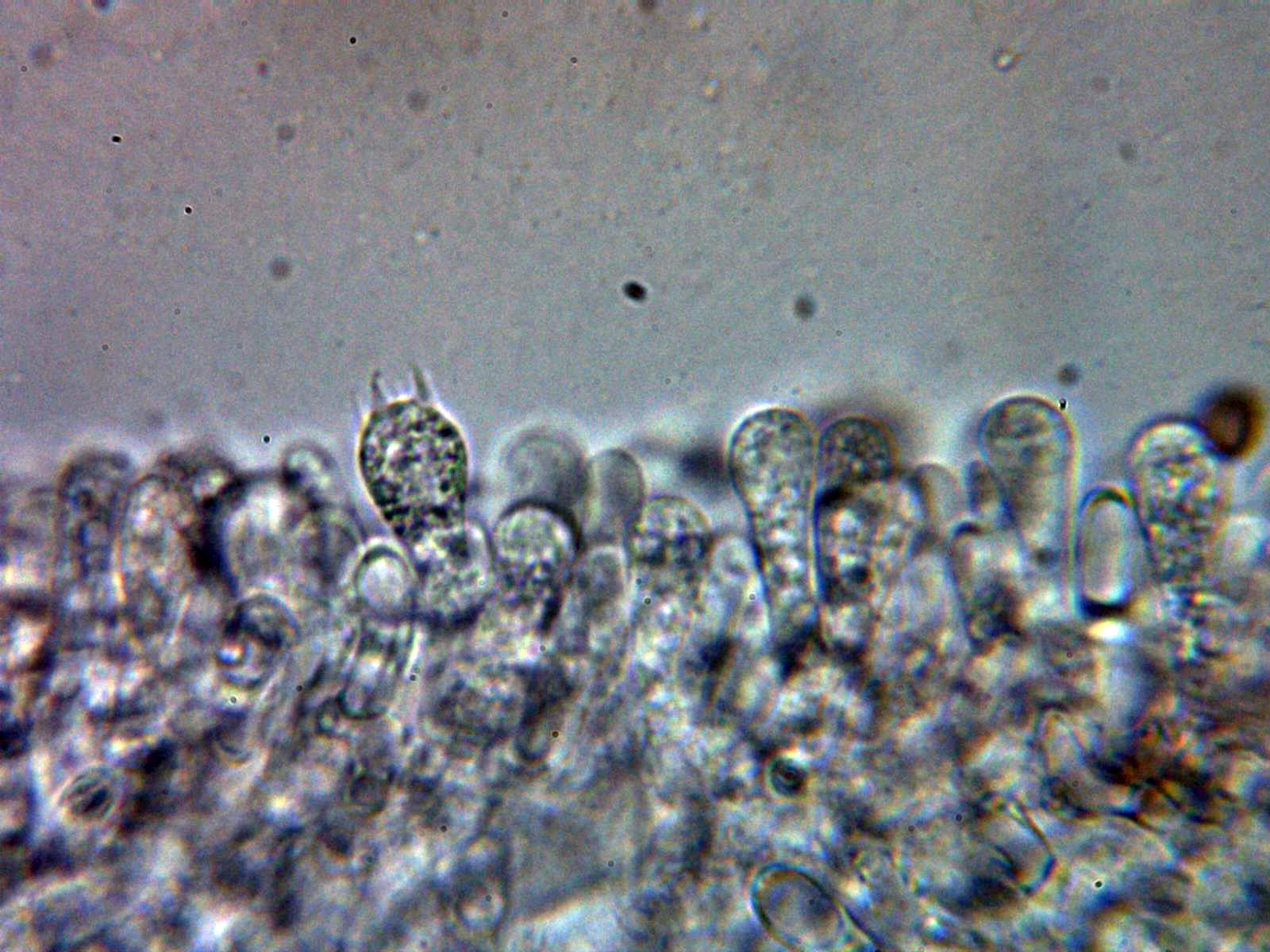 Queilocistidios muy abundantes, entre piriformes y cilíndricos con tenue pigmento en su interior y unas medidas de 29.1 - 45.2 × 11.8 - 18 µm.