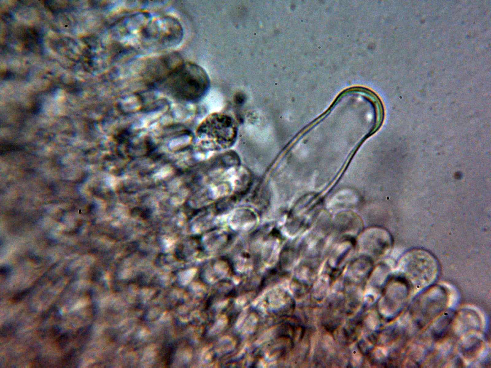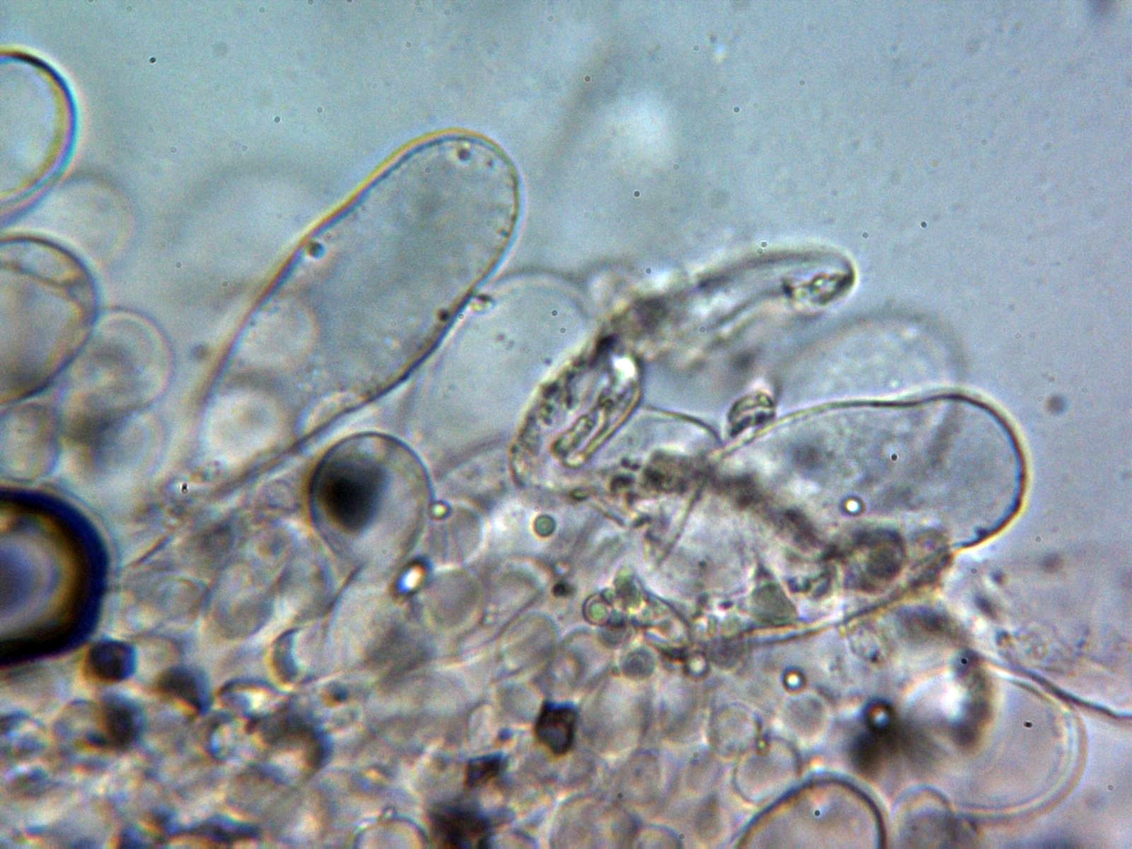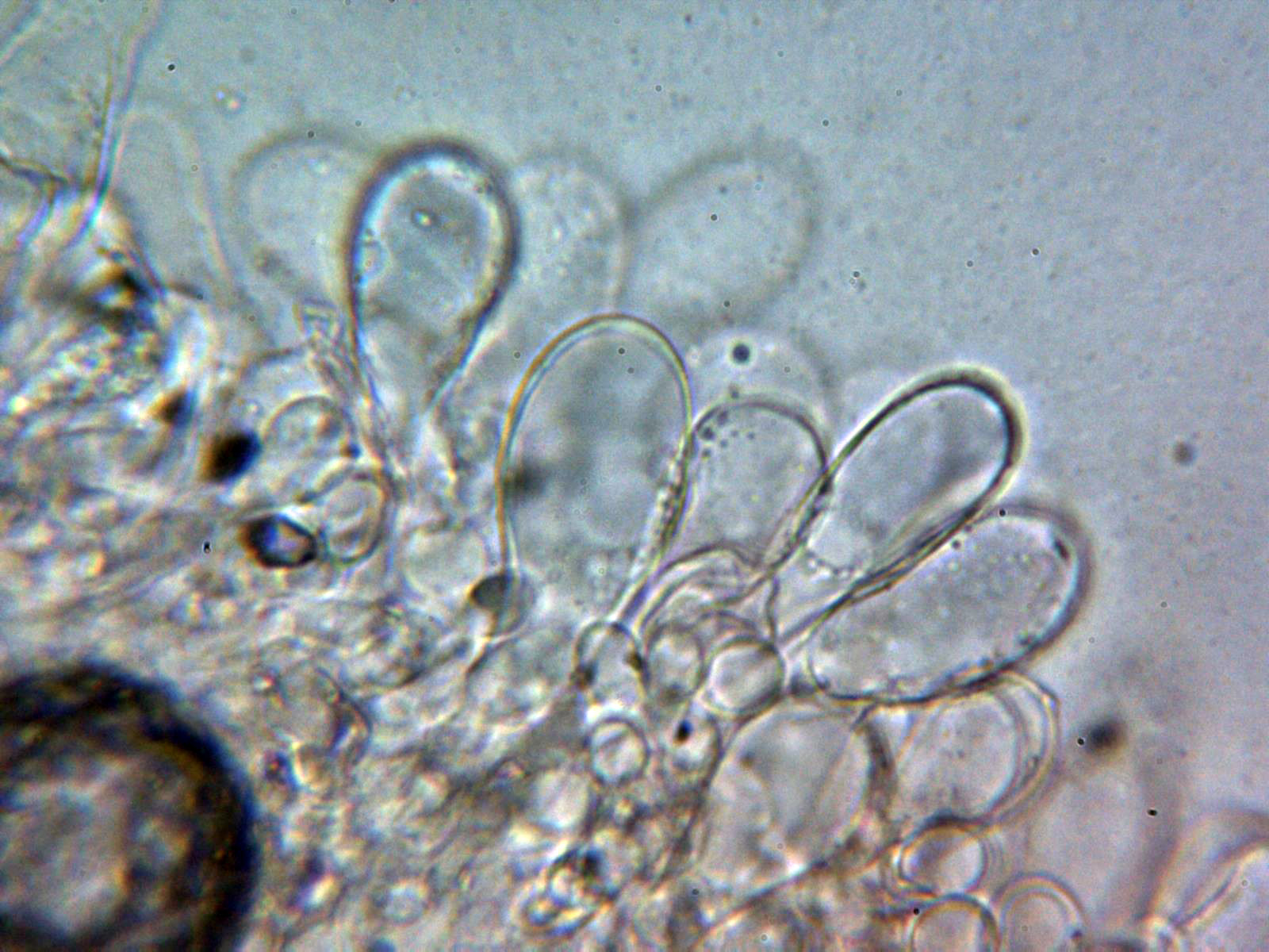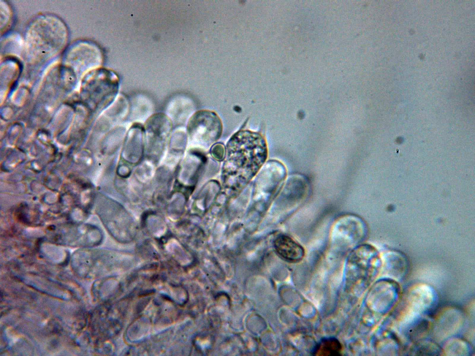 Queilocistidios muy abundantes, entre piriformes y cilíndricos con tenue pigmento en su interior y unas medidas de 29.1 - 45.2 × 11.8 - 18 µm.